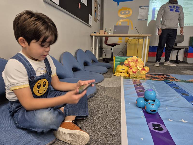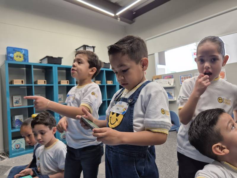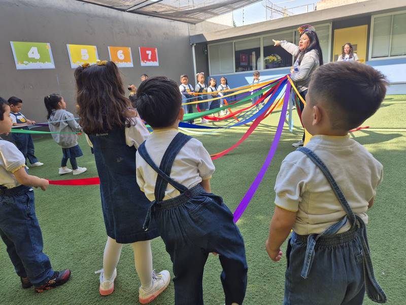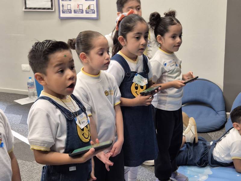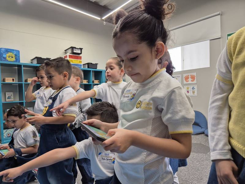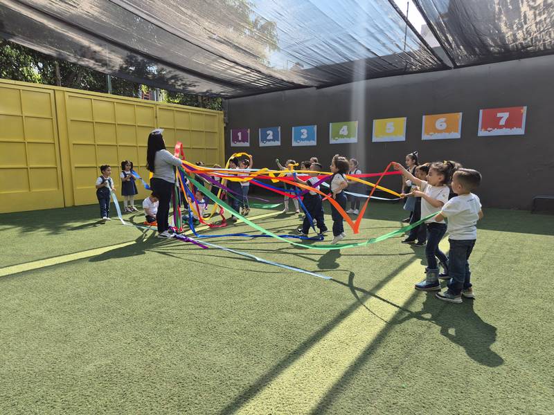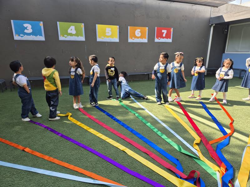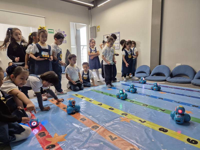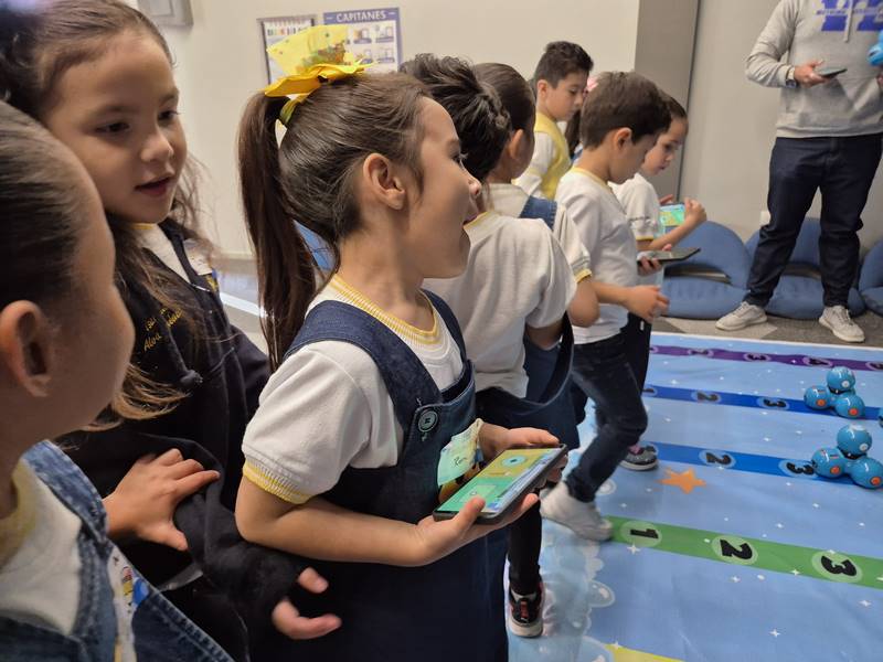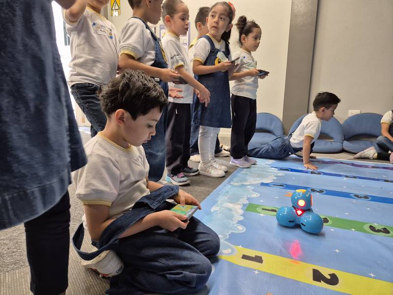 - Matemáticas y Coding: Se divirtieron mucho jugando a los listones de colores para trabajar la identificación de números y sumas; terminaron en la clase de coding resolviendo acertijos con el robot para encontrar el cofre del tesoro.