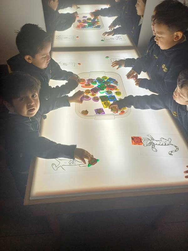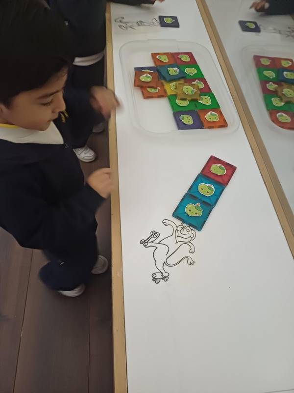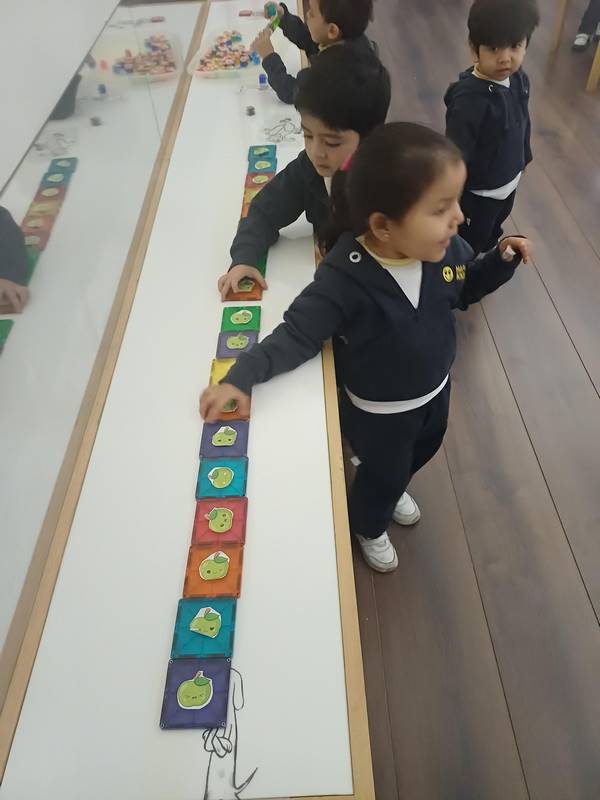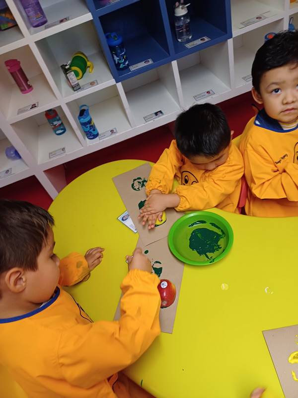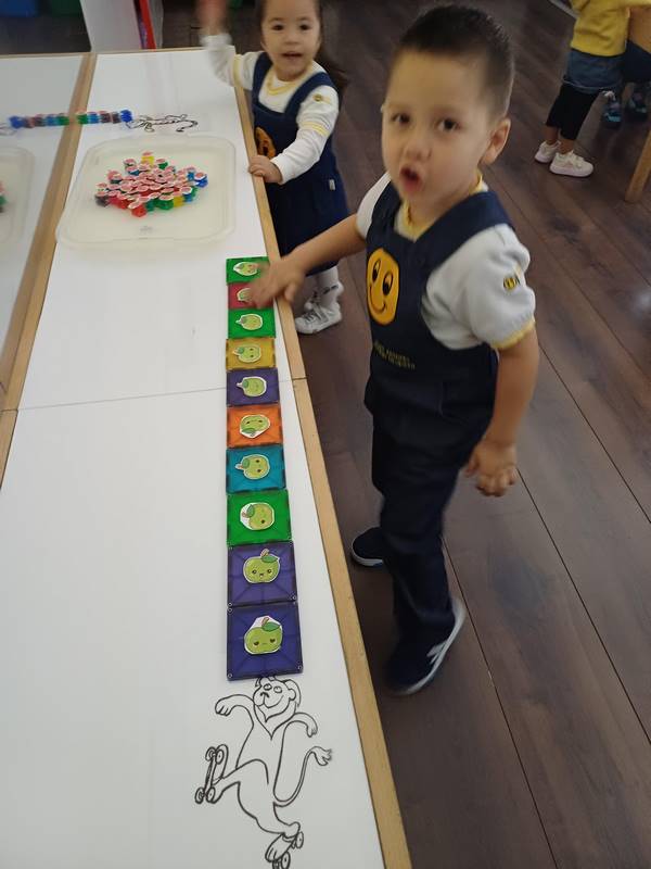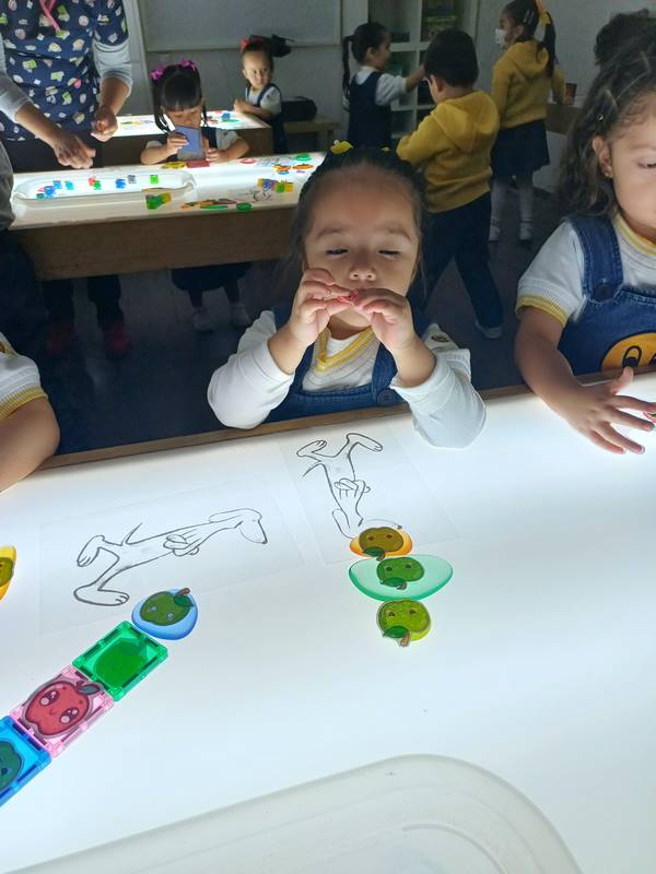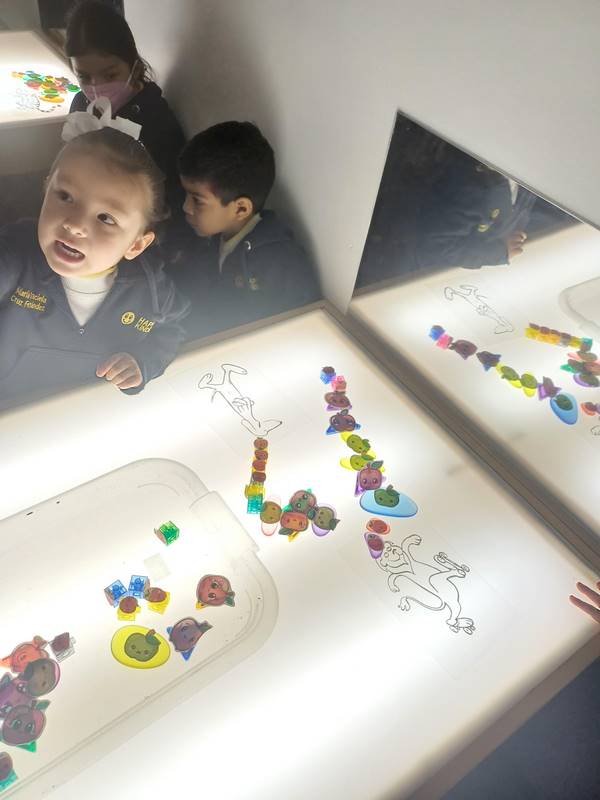 En K1, leímos la historia “Apples Up on Top”, en la que los niños repasaron los números del 1 al 10. Fuimos al light lab para hacer una actividad de matemáticas. Los niños eligieron un personaje de la historia y colocaron 10 manzanas sobre sus cabezas tal como en el cuento, y tuvieron que contar manzana por manzana para llegar a 10.