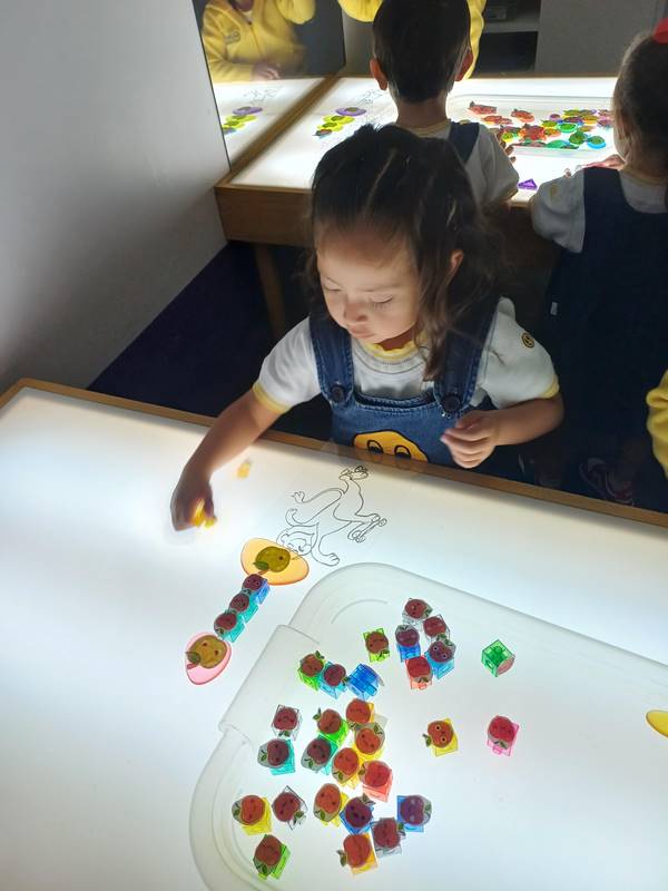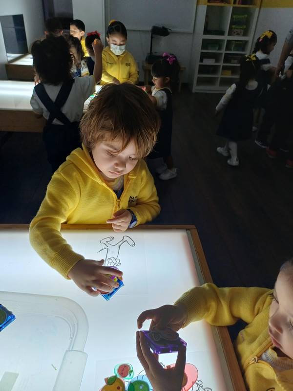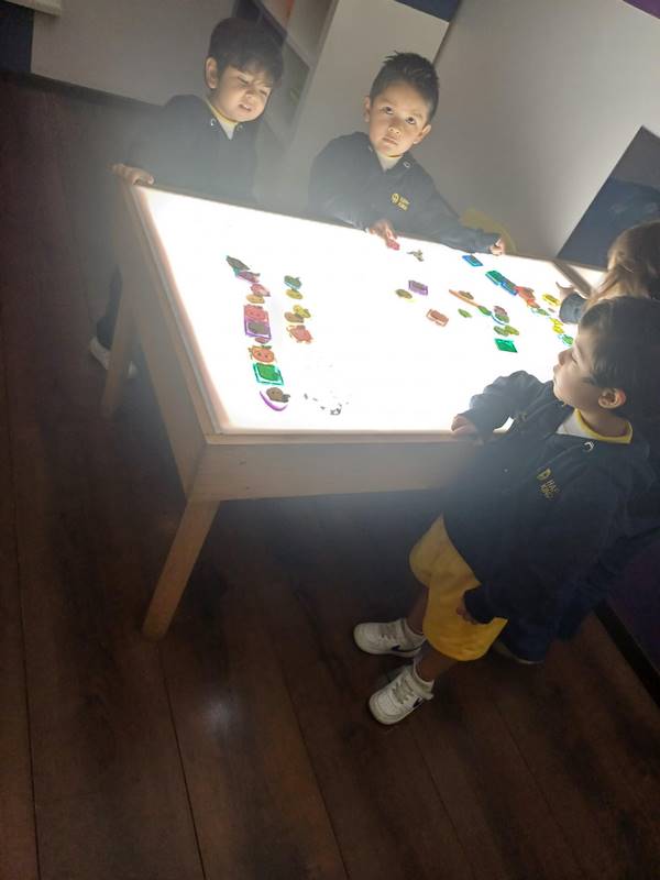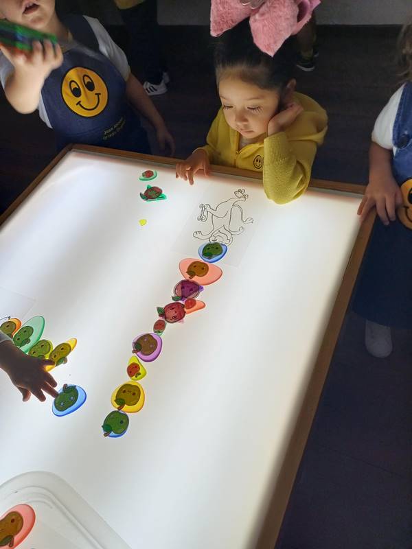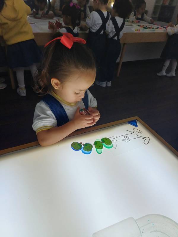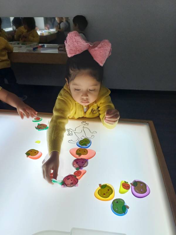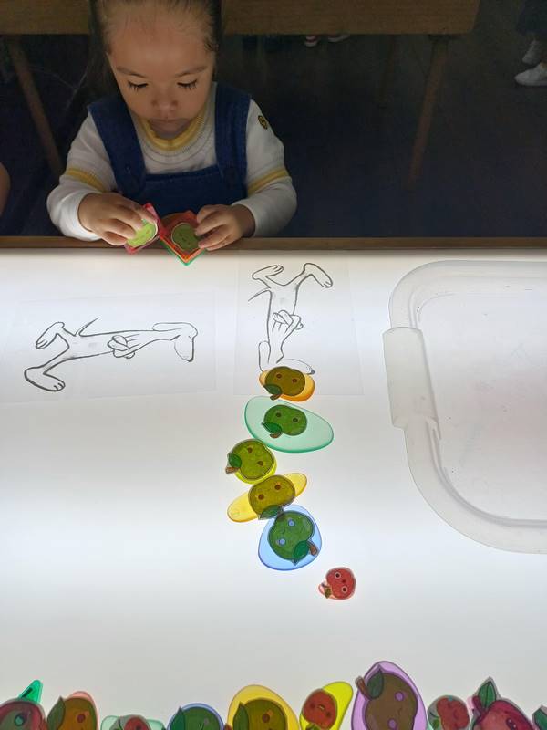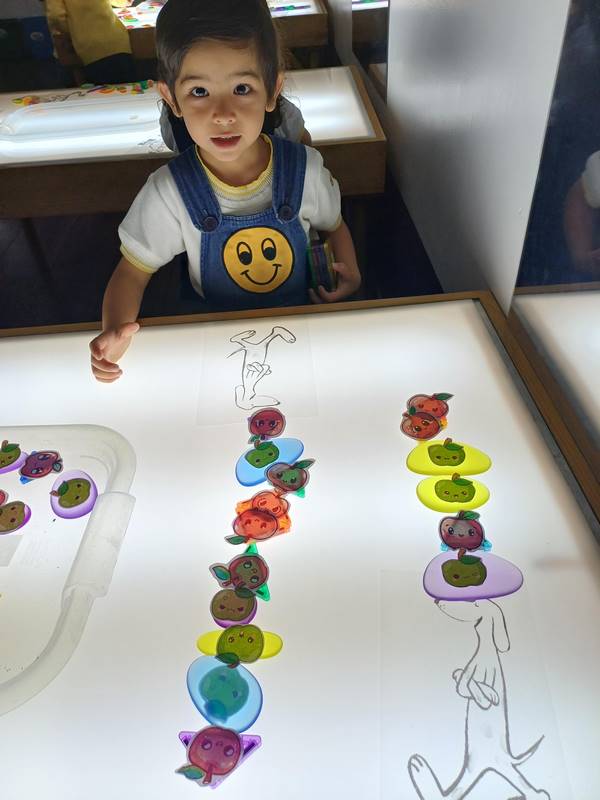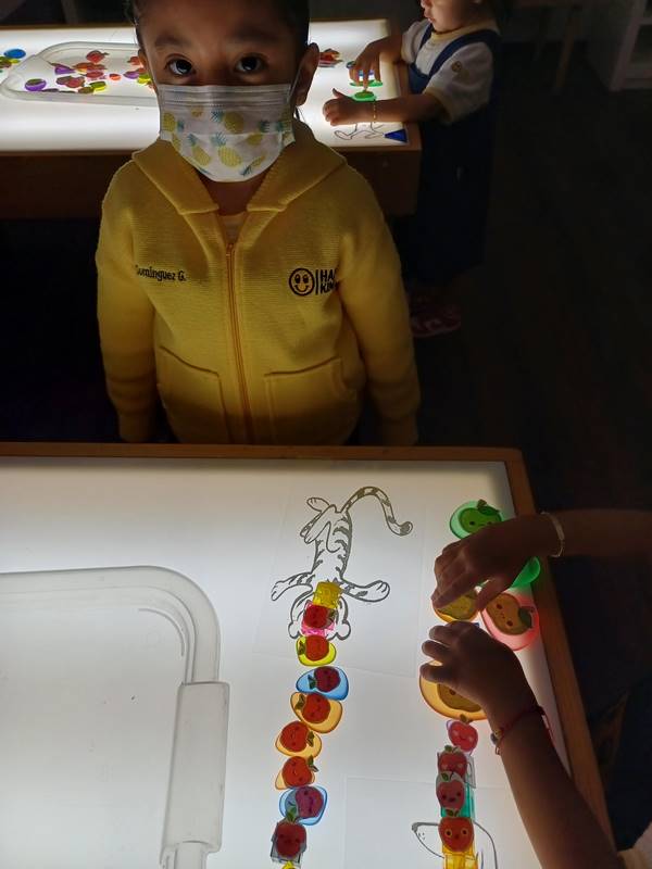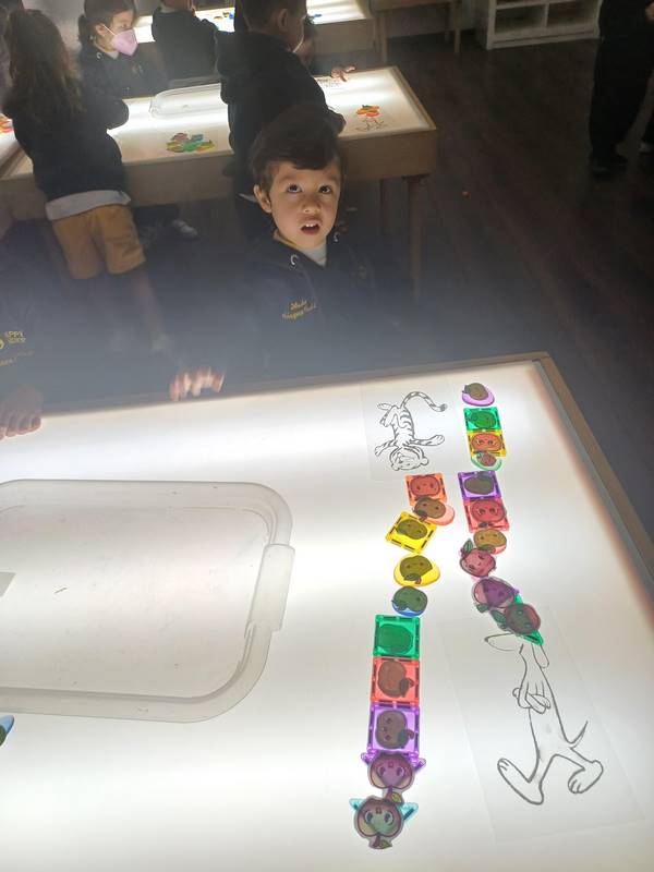 In K1, we read the story “Apples Up on Top,” in which kids reviewed numbers from 1 to 10. We went to the light lab to do a math activity. Kids decide on a story character and place 10 apples on their heads, just like in the story. Kids had to count apple by apple to reach 10.