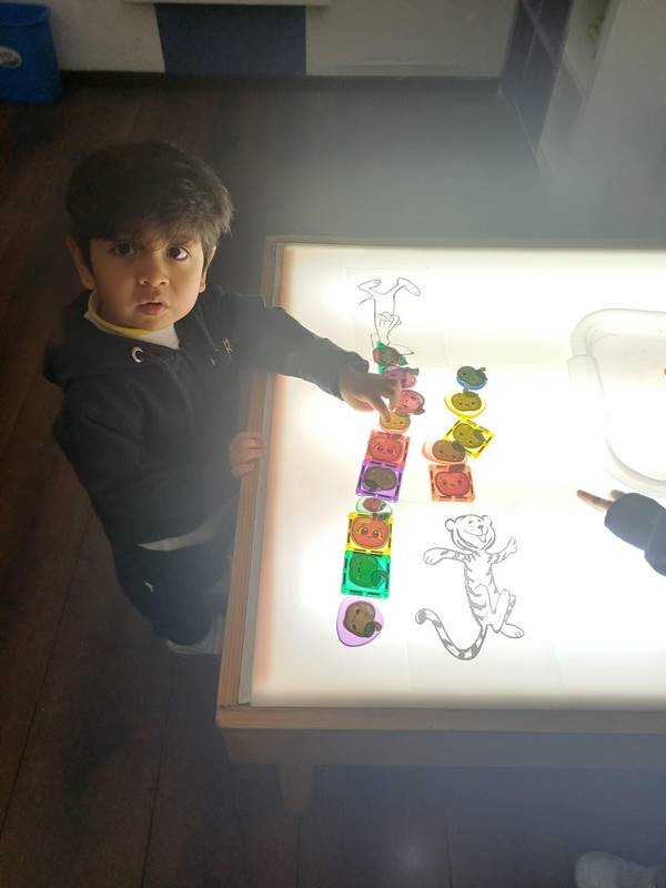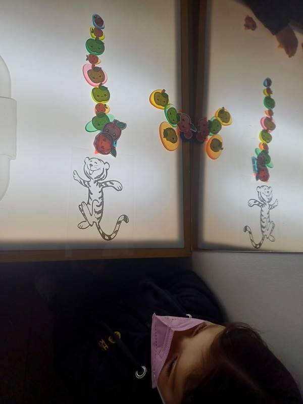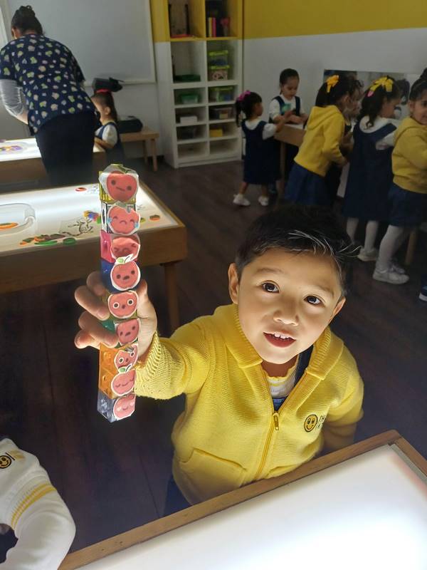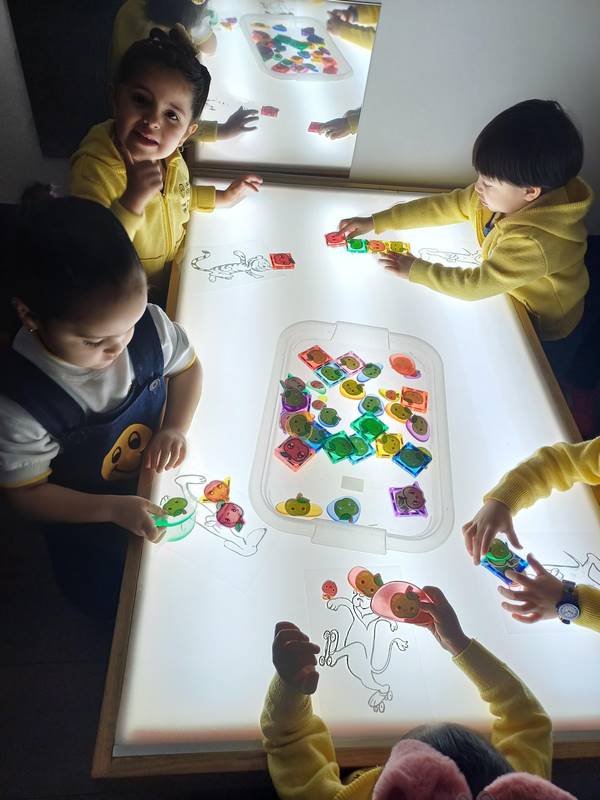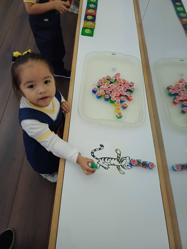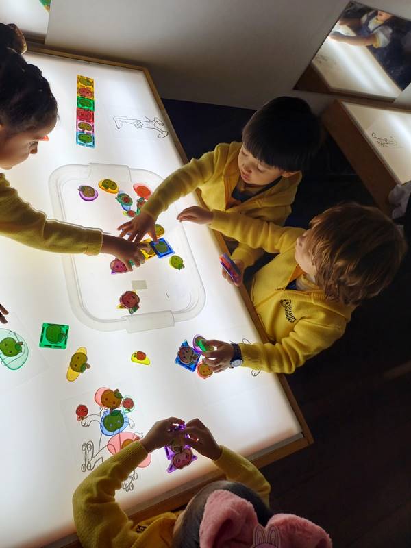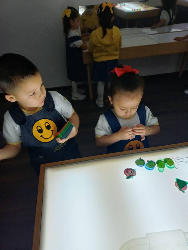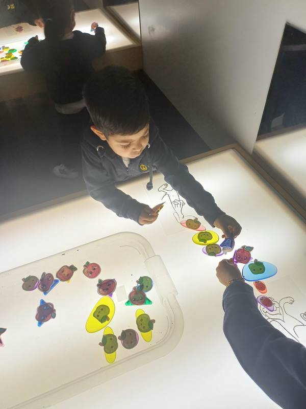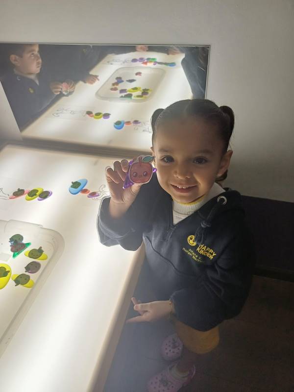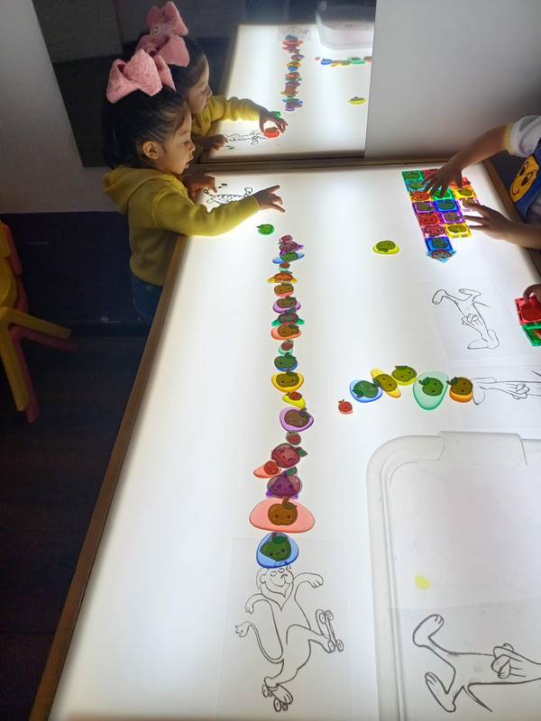 In K1, we read the story “Apples Up on Top,” in which kids reviewed numbers from 1 to 10. We went to the light lab to do a math activity. Kids decide on a story character and place 10 apples on their heads, just like in the story. Kids had to count apple by apple to reach 10.