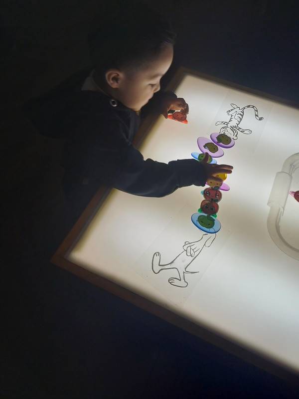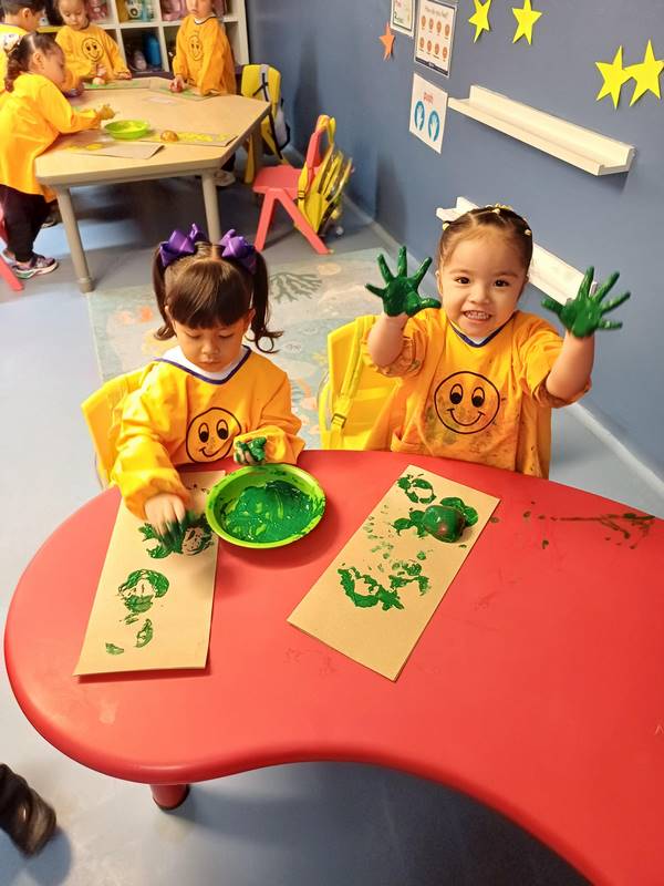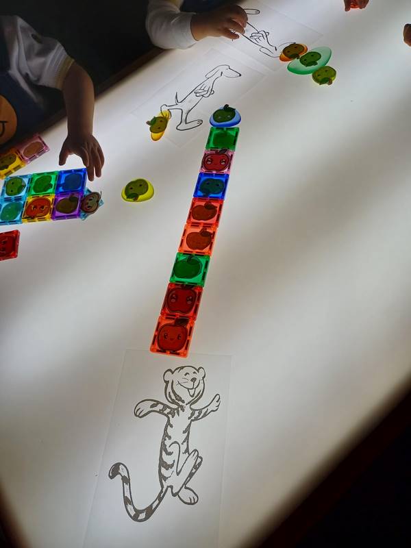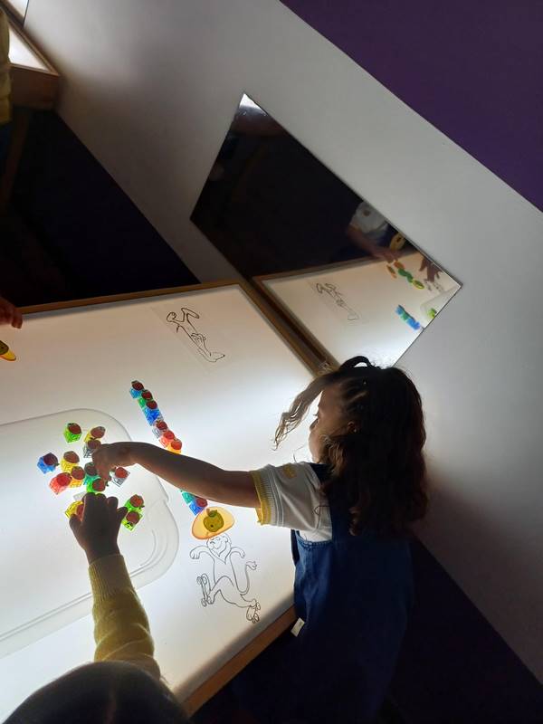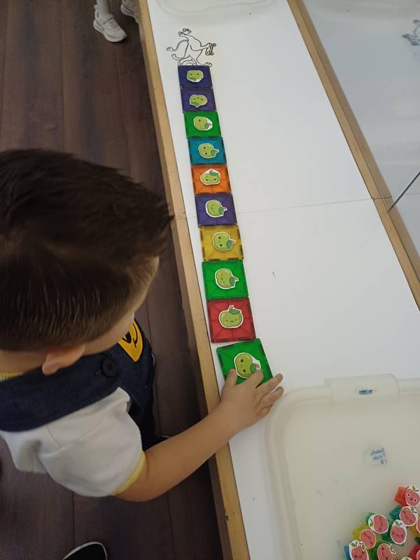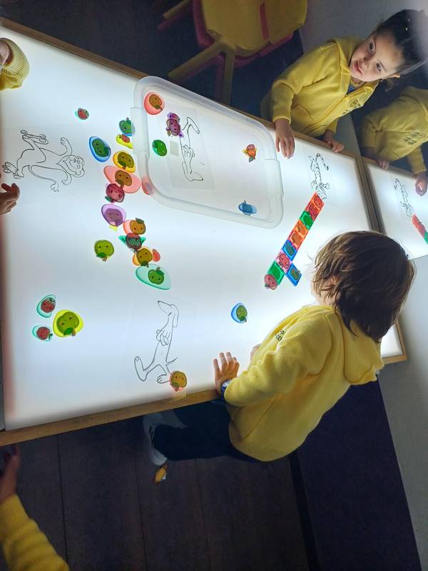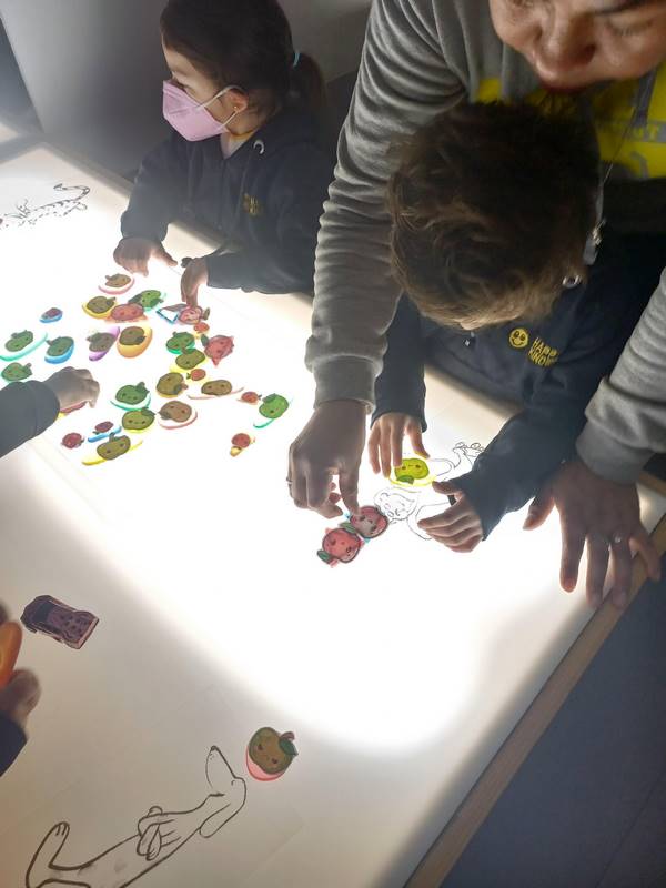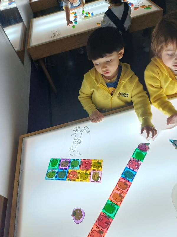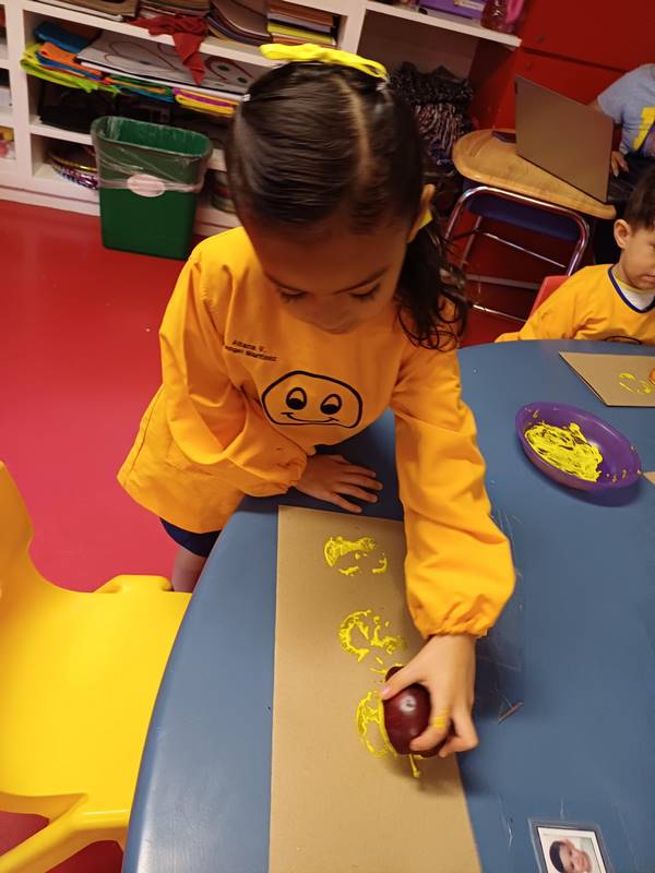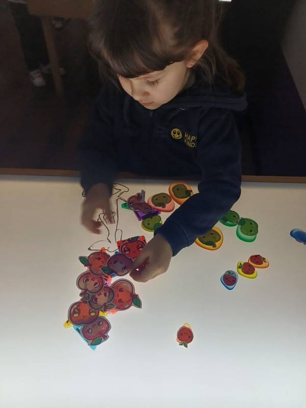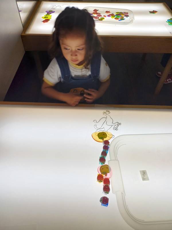 In K1, we read the story “Apples Up on Top,” in which kids reviewed numbers from 1 to 10. We went to the light lab to do a math activity. Kids decide on a story character and place 10 apples on their heads, just like in the story. Kids had to count apple by apple to reach 10.