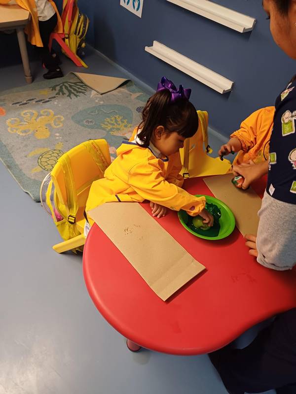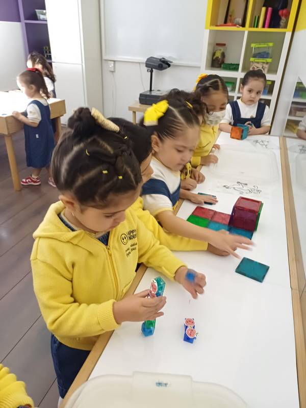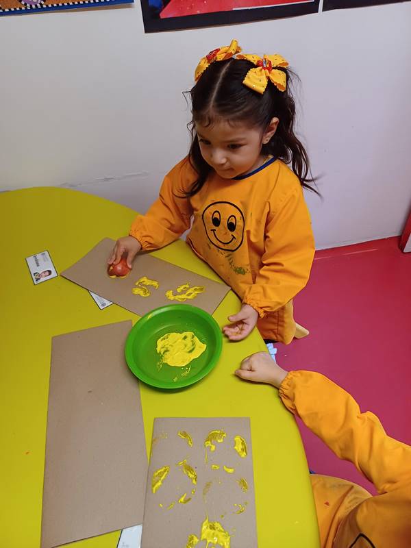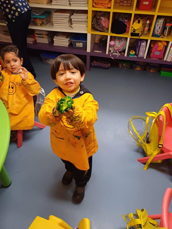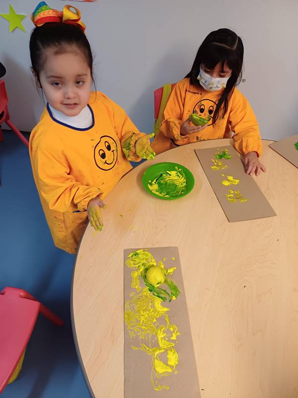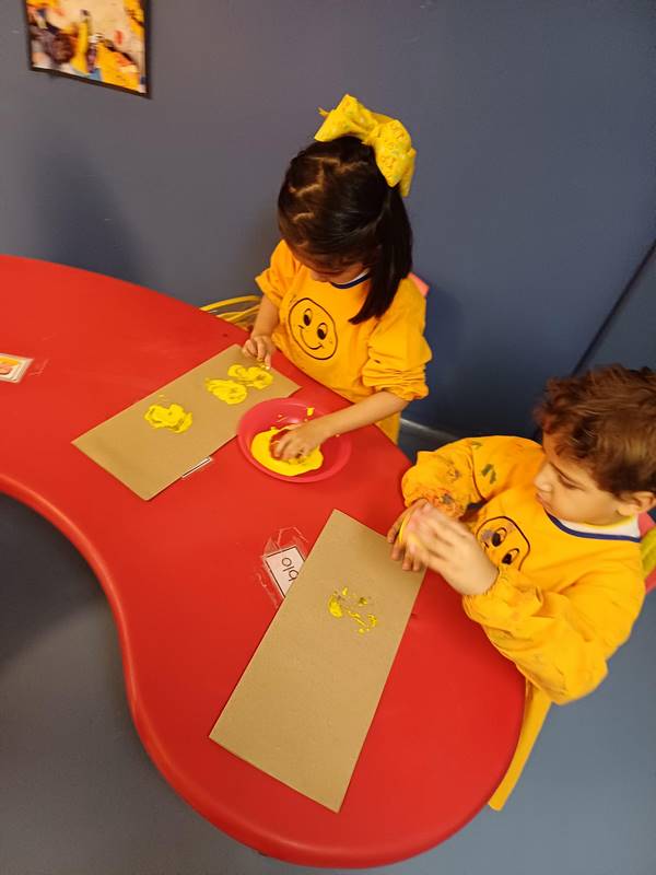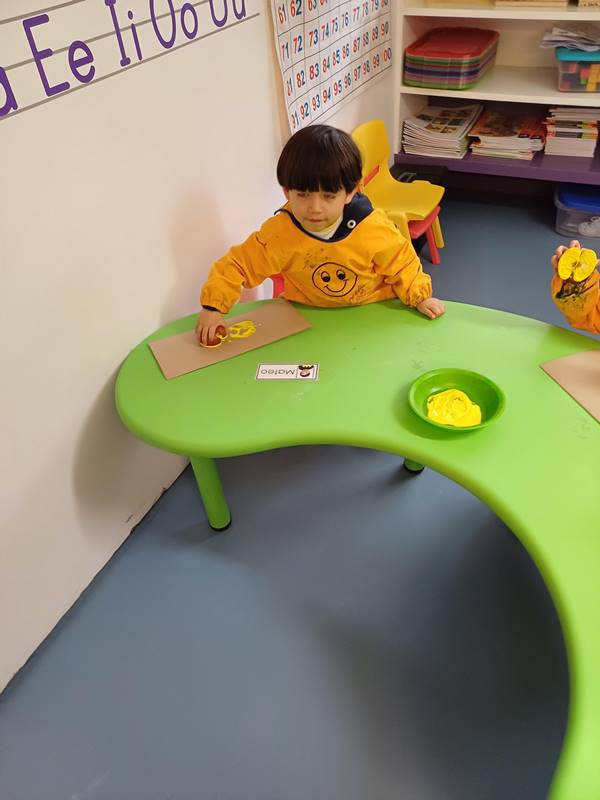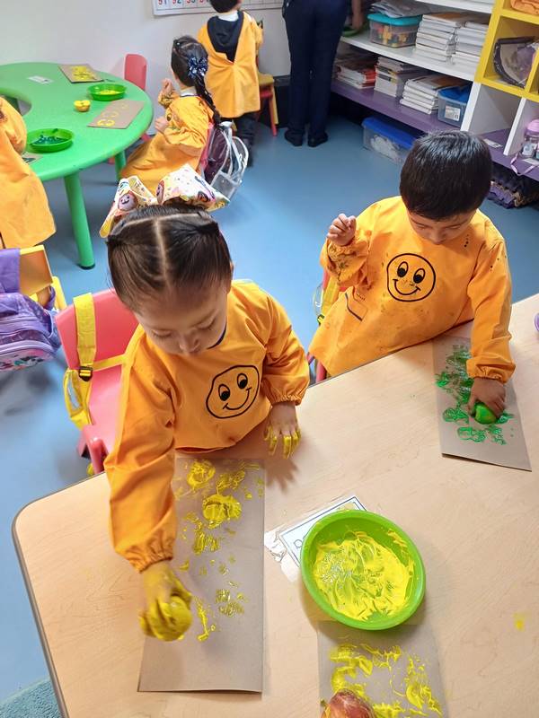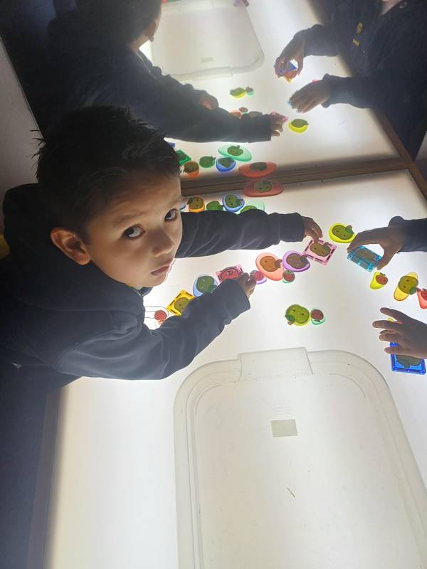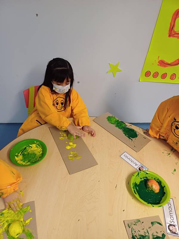In K1, we read the story “Apples Up on Top,” in which kids reviewed numbers from 1 to 10. We went to the light lab to do a math activity. Kids decide on a story character and place 10 apples on their heads, just like in the story. Kids had to count apple by apple to reach 10.