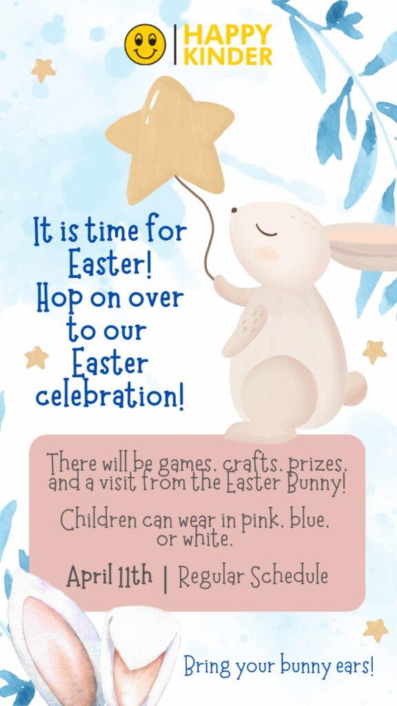 Brinca y diviértete en nuestra celebración de Pascua el viernes 11 de abril. Tendremos horario habitual ese día y en Club también. Nuestros niños pueden usar jeans, shorts y una playera blanca, rosa o lila, orejas de conejo y tenis.