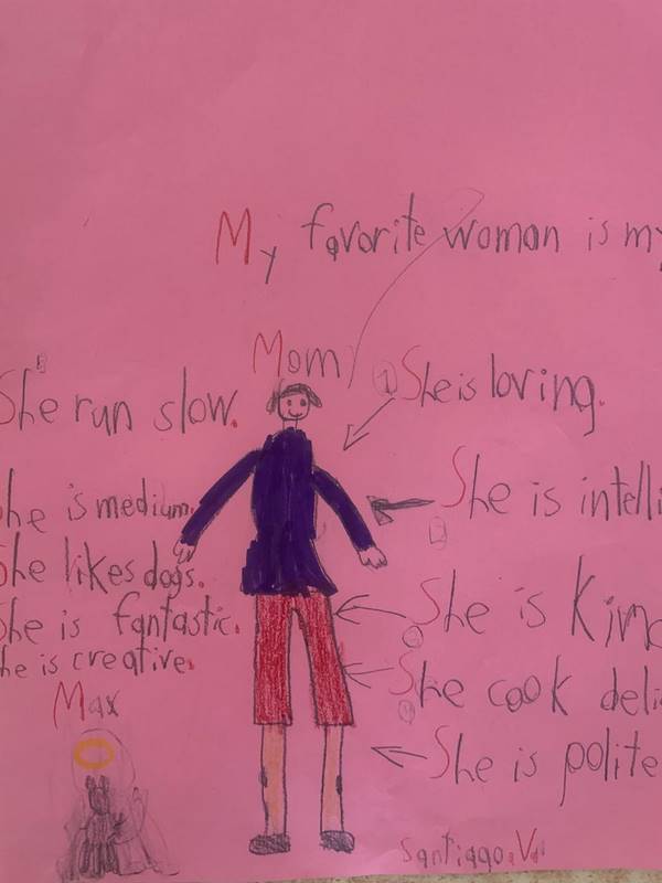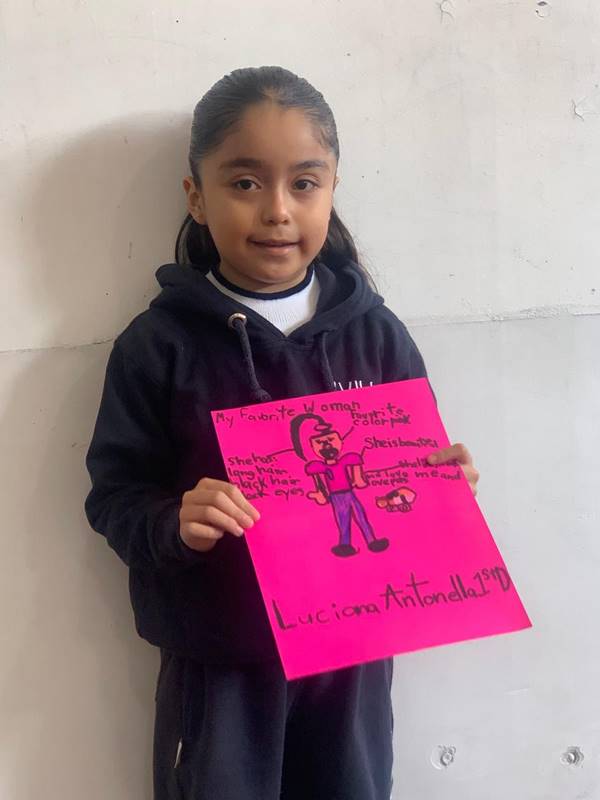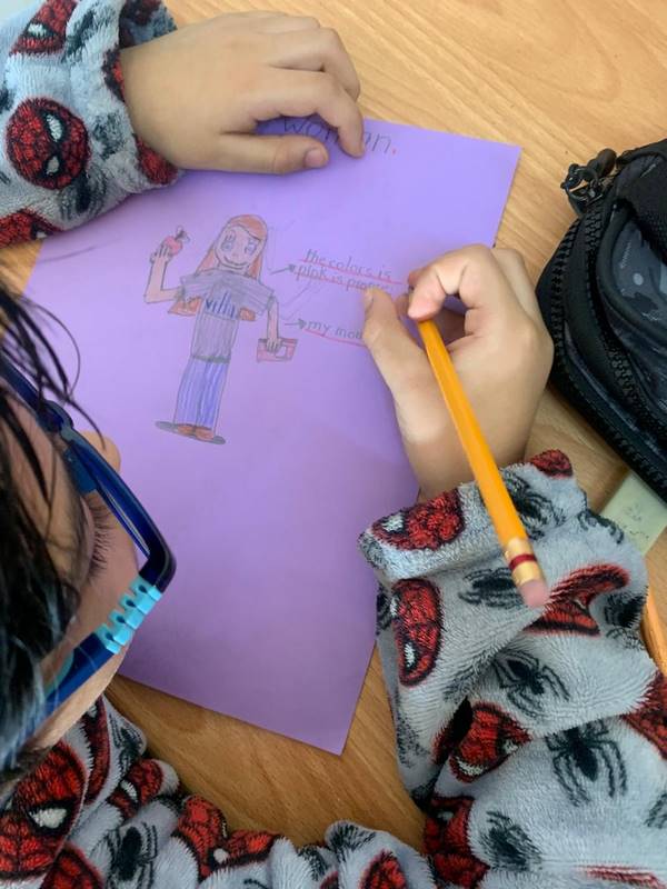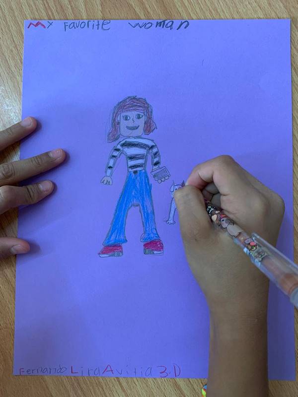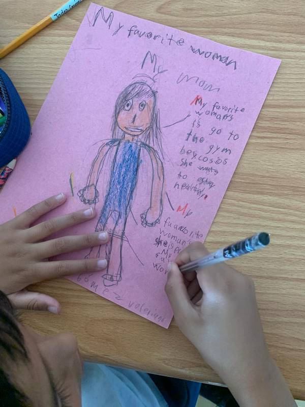 Once they finished drawing, first graders wrote key words and second and third graders wrote sentences that describe the chosen woman using adjectives and adverbs, plus likes/dislikes and their favorite woman’s favorite color, food, animal, place, activity and friend.