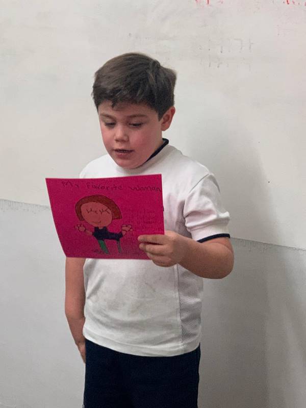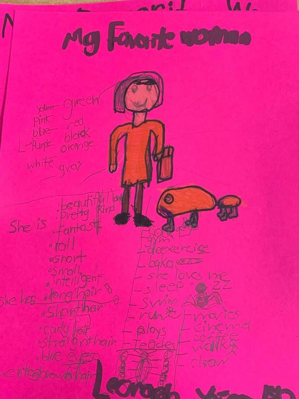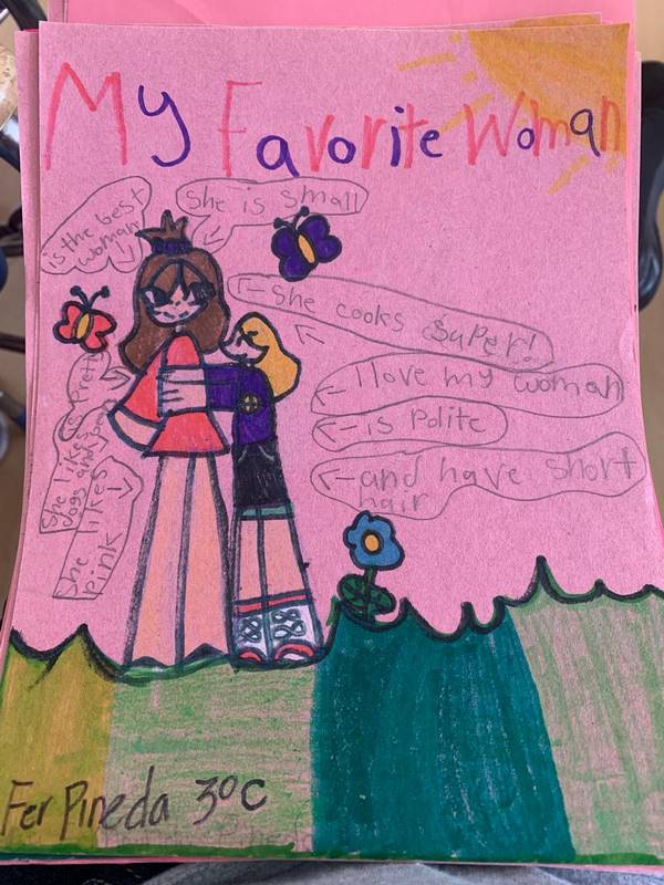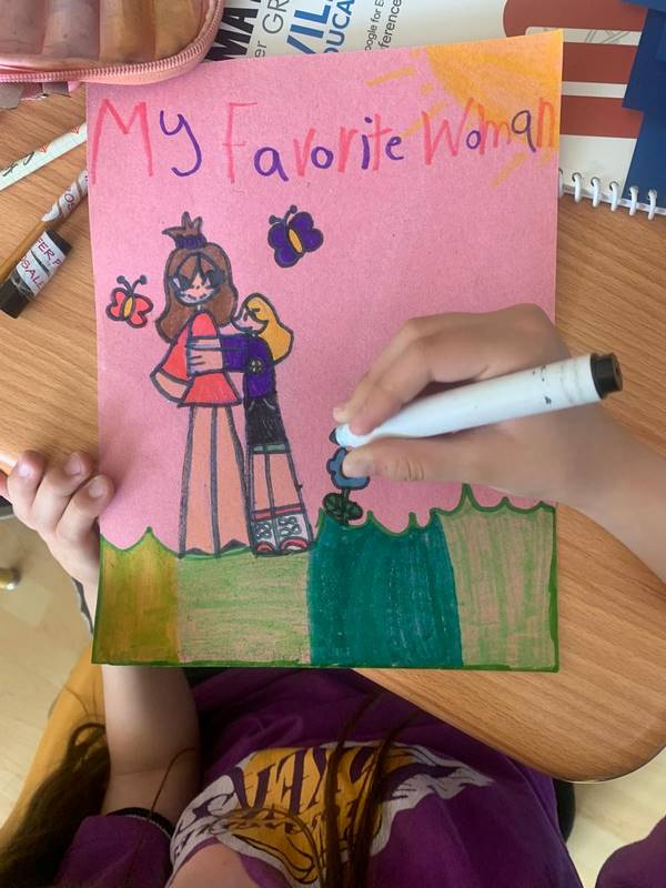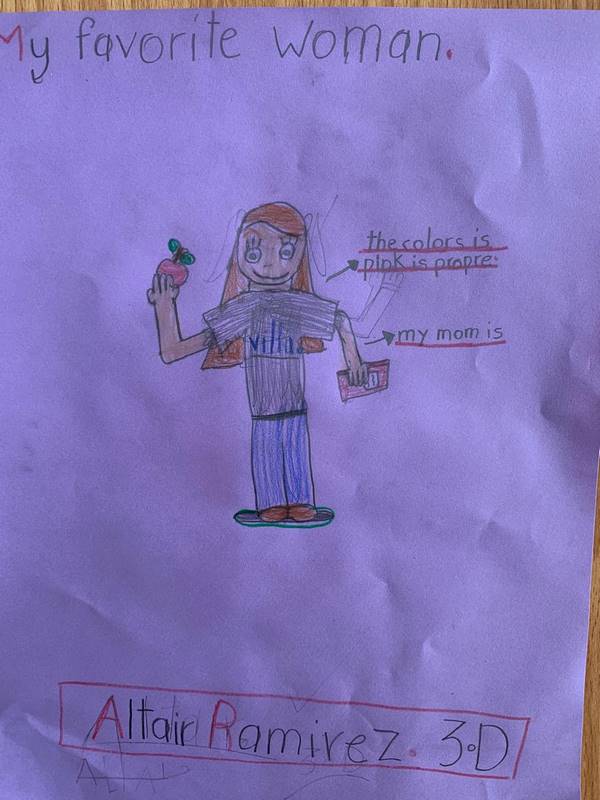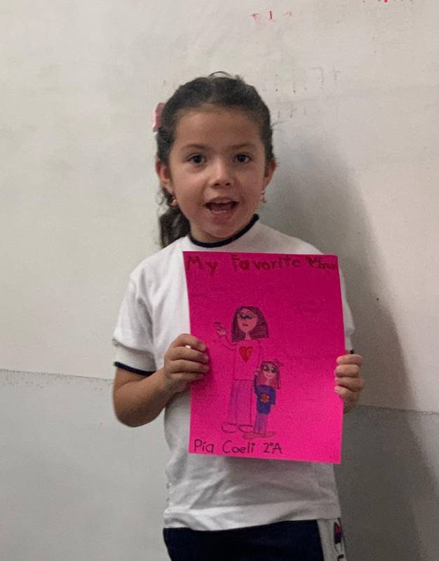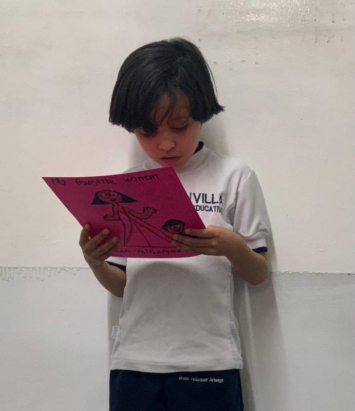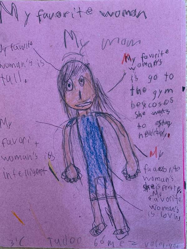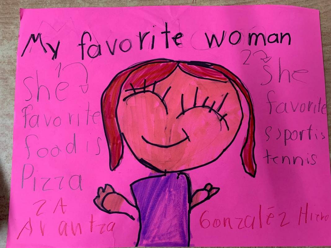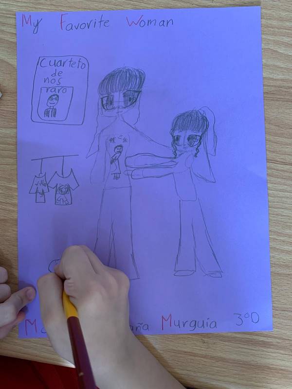 Los alumnos recibieron una hoja de papel rosa o morada en la que debían dibujar la mujer favorita de su elección. Una vez que terminaron, los pequeños de primer grado escribieron a su alrededor palabras clave; los alumnos de segundo y tercer grado escribieron oraciones en presente simple utilizando adjetivos, adverbios y los gustos preferidos de su mujer favorita.