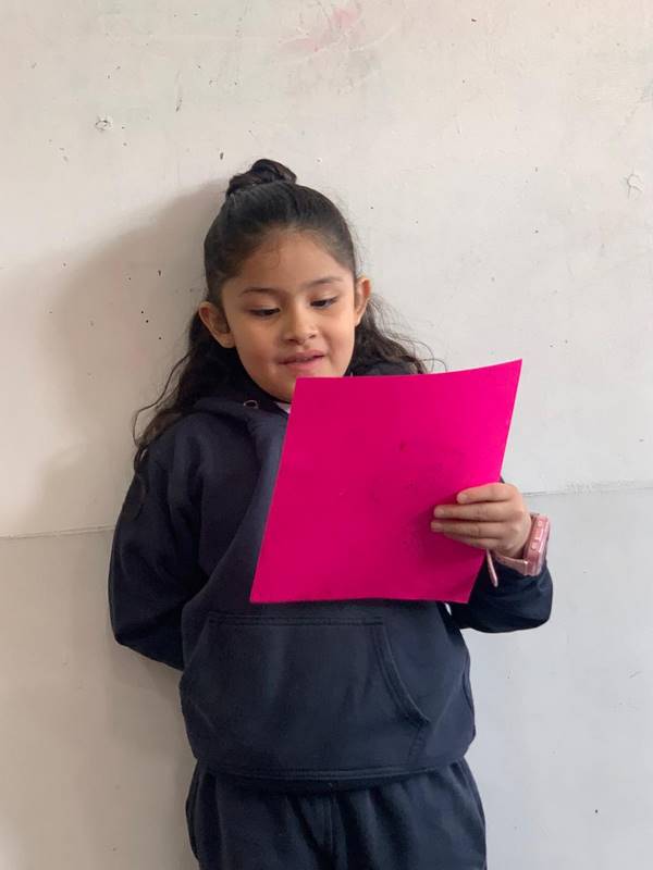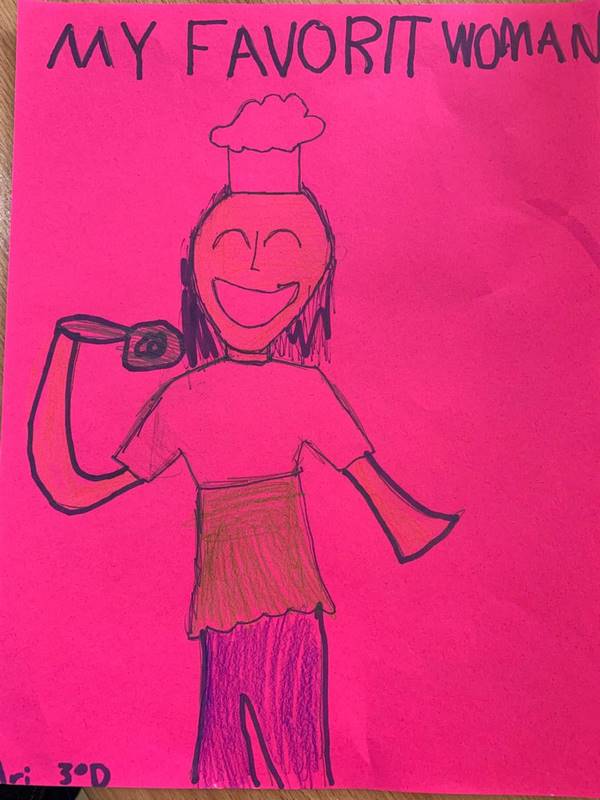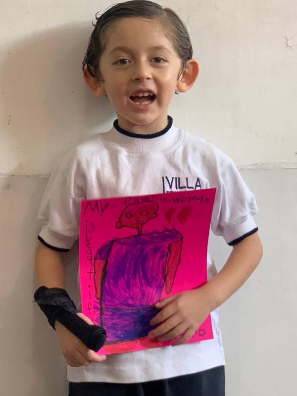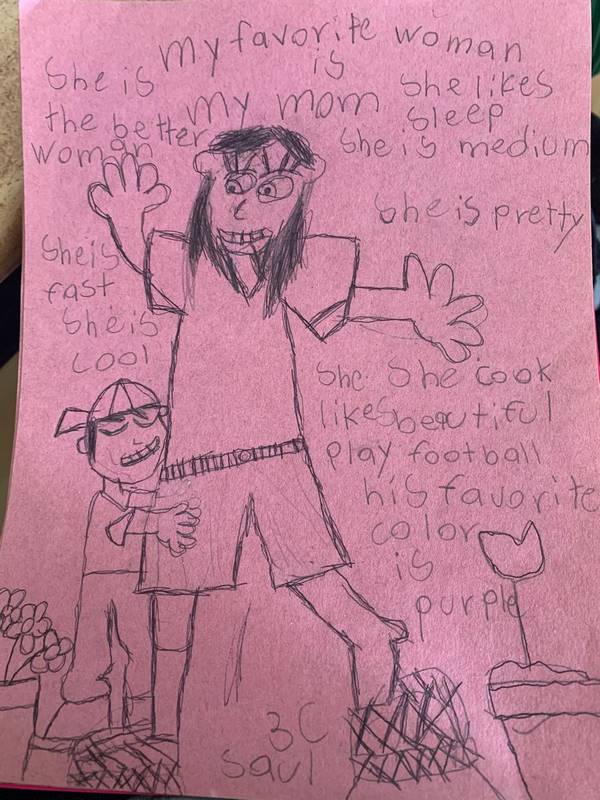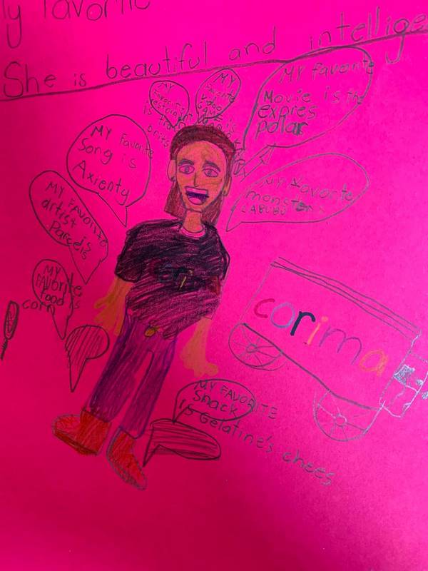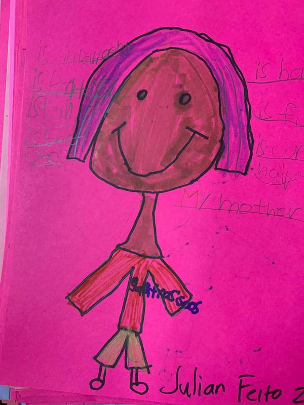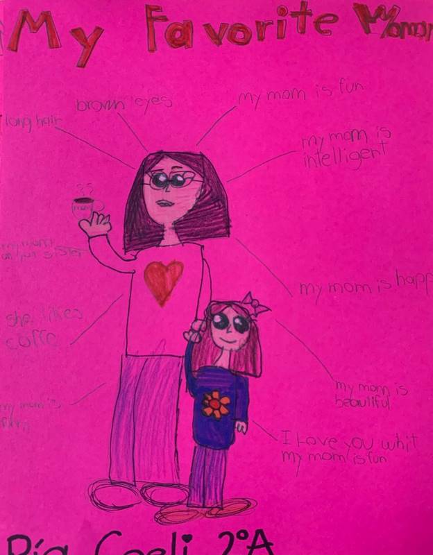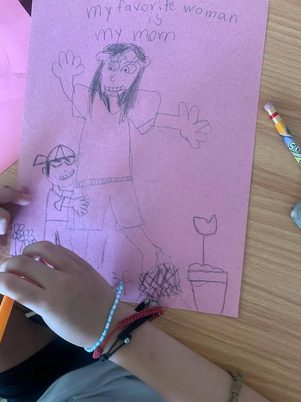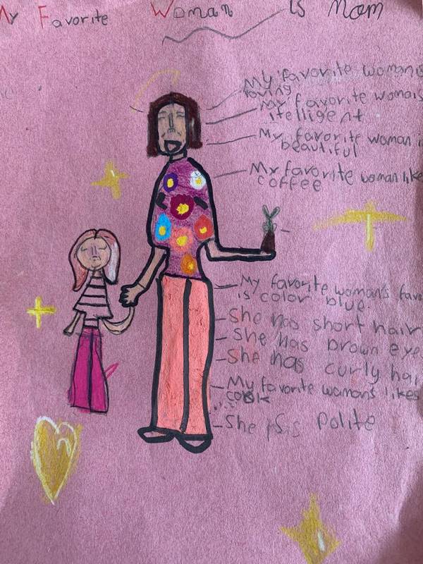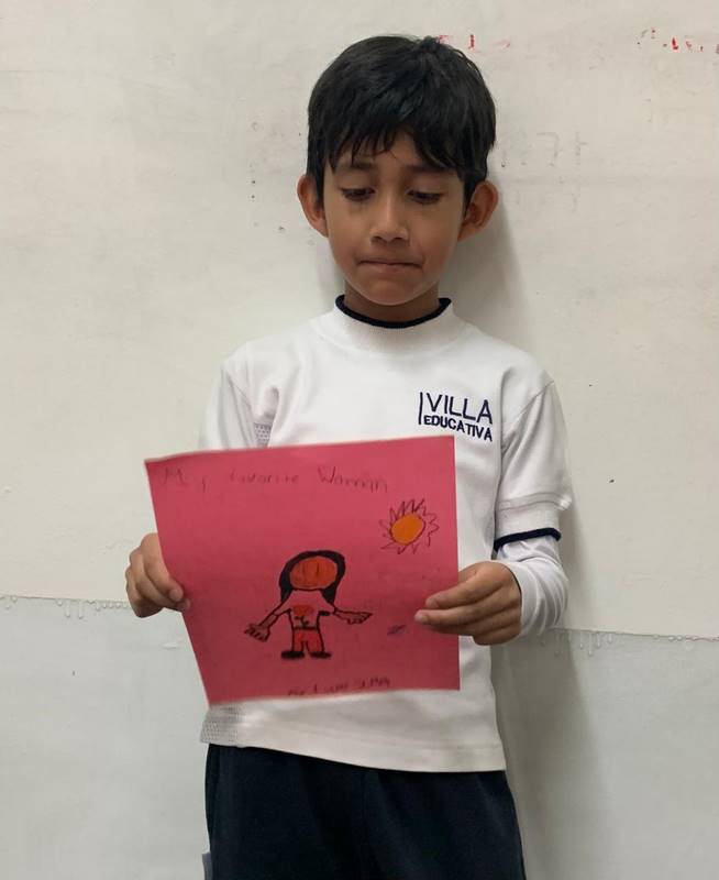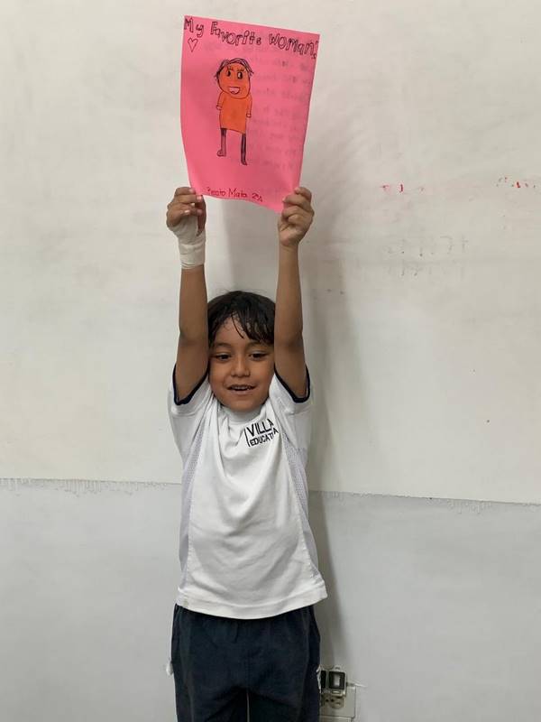 Los alumnos recibieron una hoja de papel rosa o morada en la que debían dibujar la mujer favorita de su elección. Una vez que terminaron, los pequeños de primer grado escribieron a su alrededor palabras clave; los alumnos de segundo y tercer grado escribieron oraciones en presente simple utilizando adjetivos, adverbios y los gustos preferidos de su mujer favorita.
