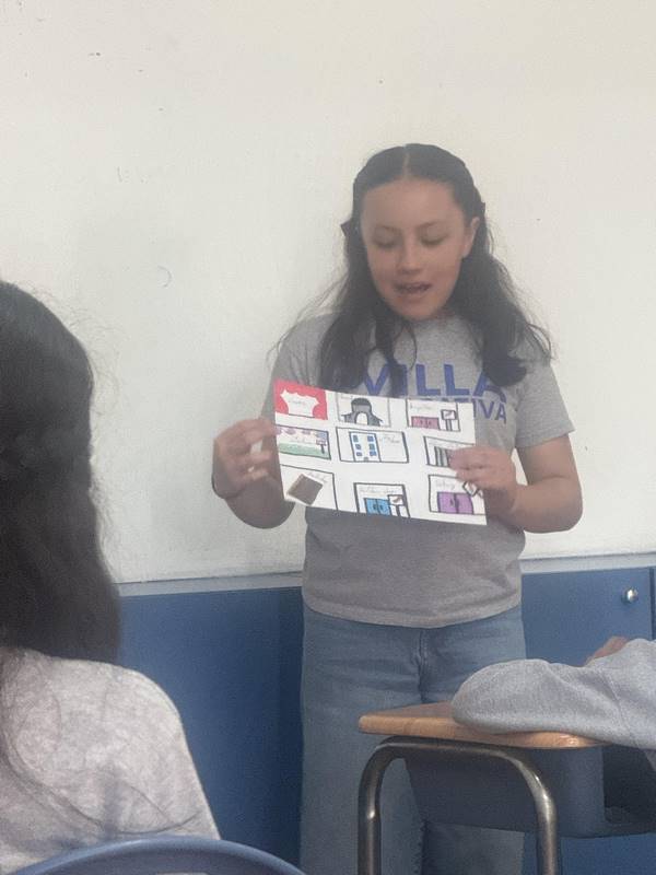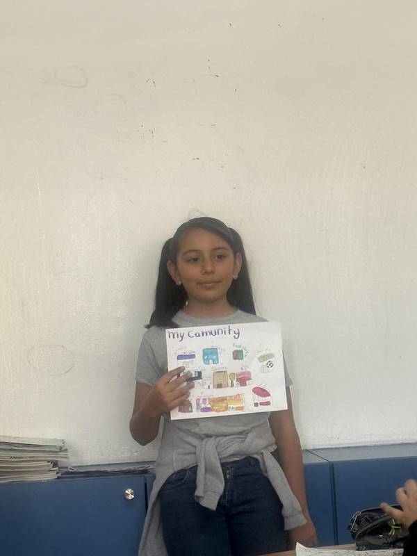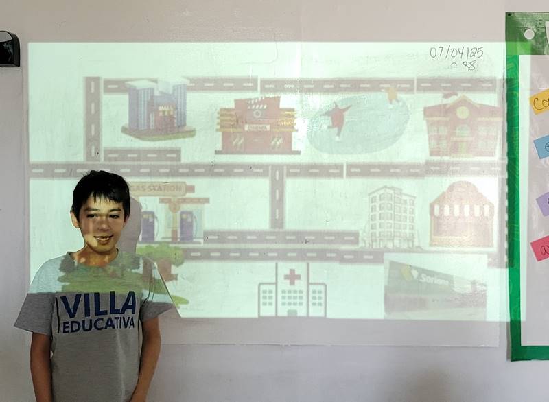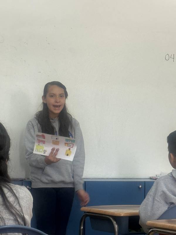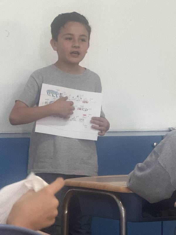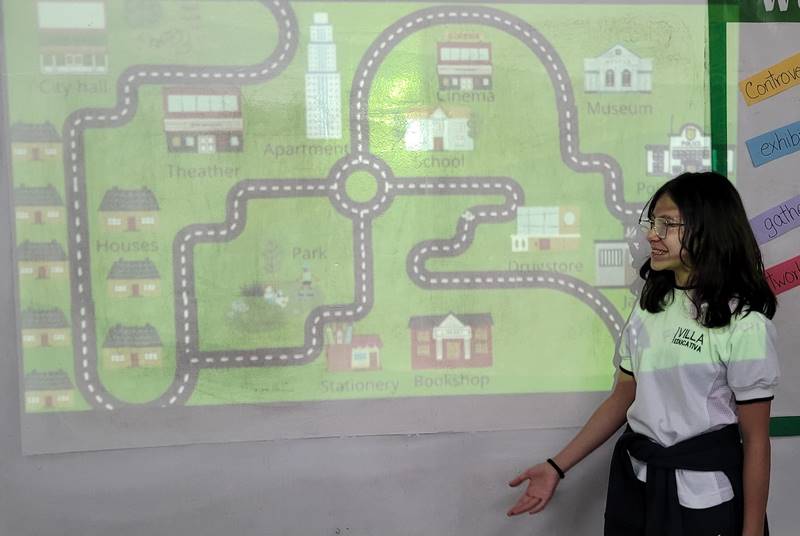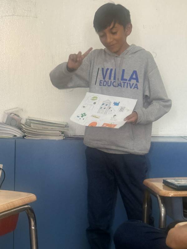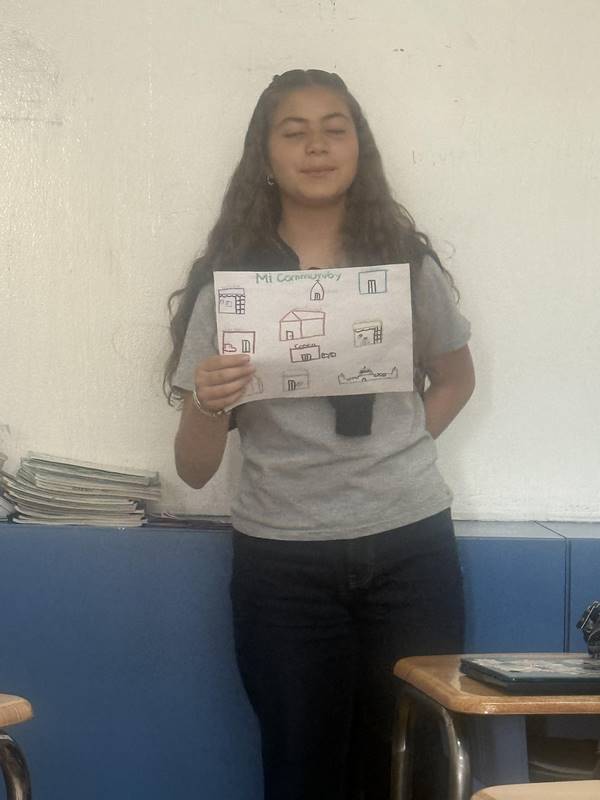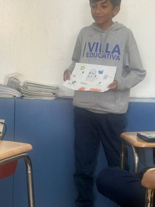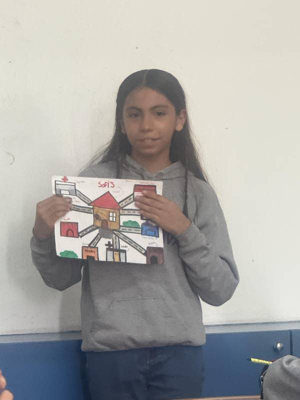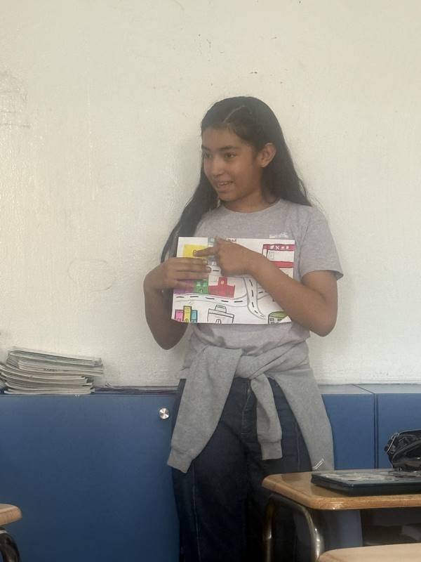 Después de diseñar sus comunidades ideales, los estudiantes pasaron al frente de la clase para presentar sus trabajos. Explicaron qué lugares incluyeron —tales como librerías, estadios, cines y teatros— y describieron cómo los organizaron. Algunos optaron por ubicar escuelas en zonas tranquilas, mientras que otros diseñaron áreas urbanas concurridas con mucho entretenimiento. ¡Lo mejor fue escuchar sus razones detrás de cada decisión!