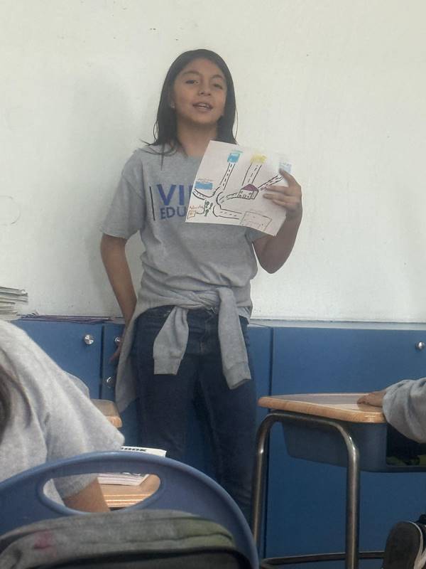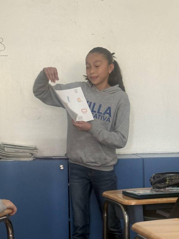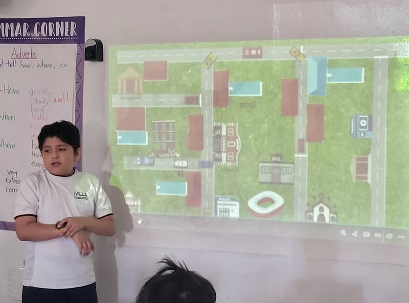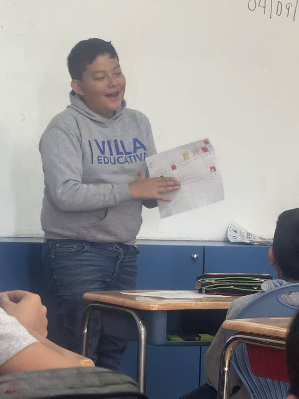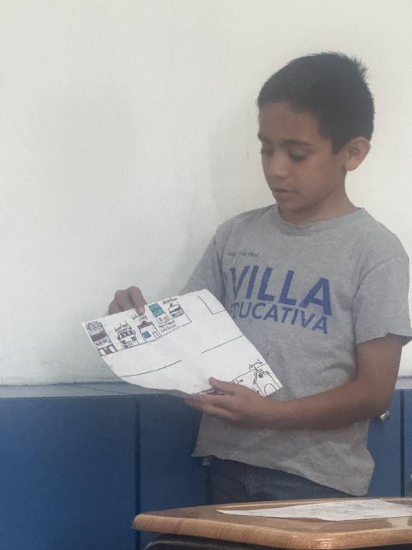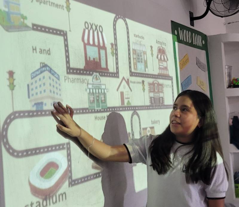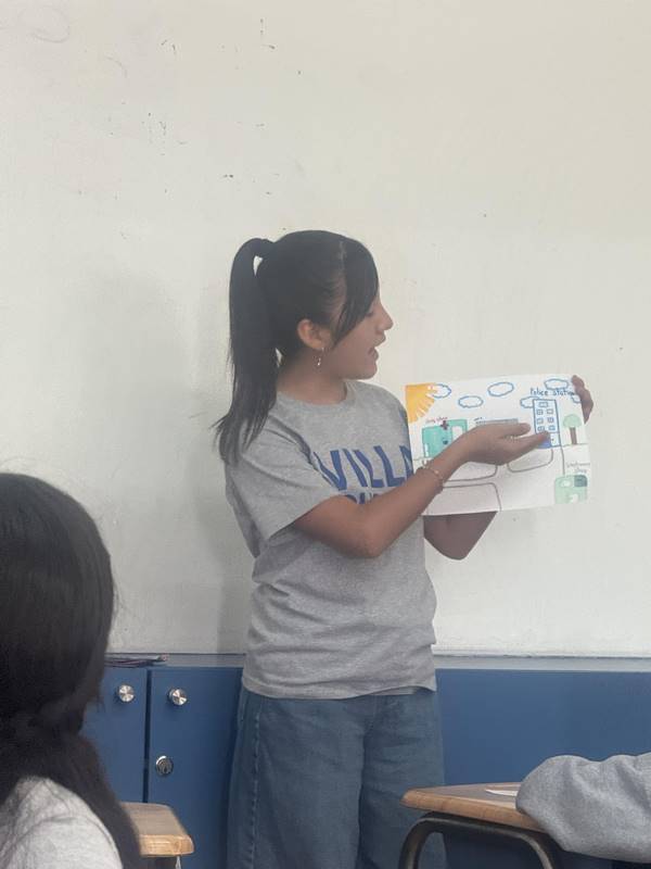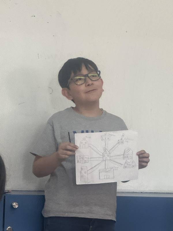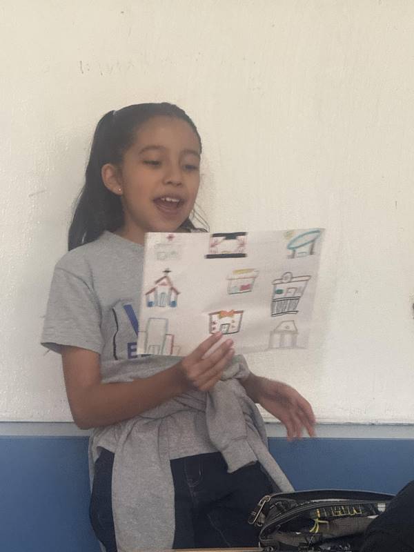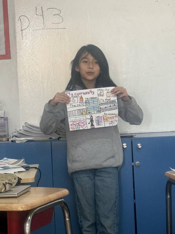 Después de diseñar sus comunidades ideales, los estudiantes pasaron al frente de la clase para presentar sus trabajos. Explicaron qué lugares incluyeron —tales como librerías, estadios, cines y teatros— y describieron cómo los organizaron. Algunos optaron por ubicar escuelas en zonas tranquilas, mientras que otros diseñaron áreas urbanas concurridas con mucho entretenimiento. ¡Lo mejor fue escuchar sus razones detrás de cada decisión!