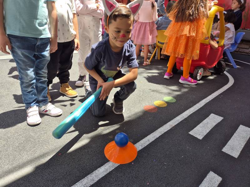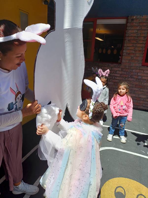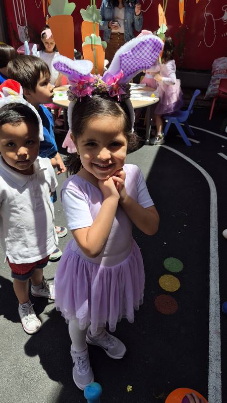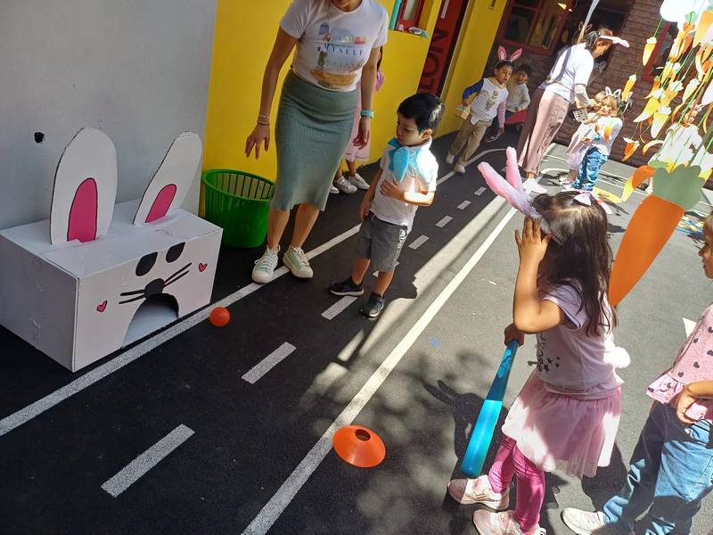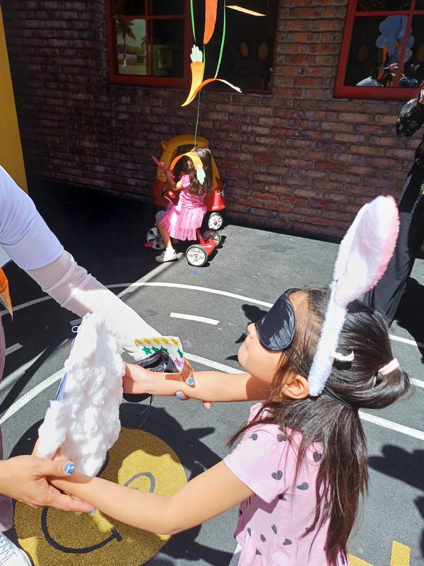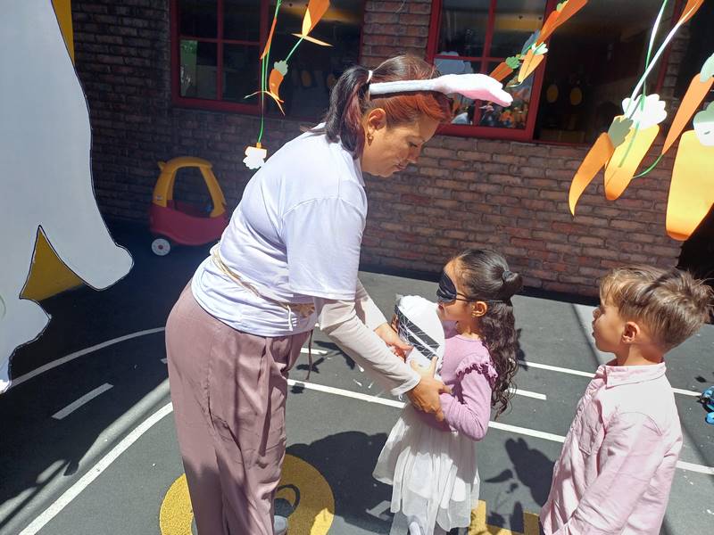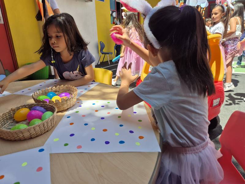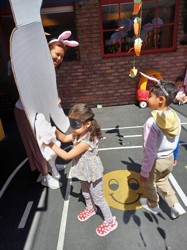 Before going on vacation, we celebrated Easter with a bunny party! Kids and teachers dressed in light colors and wore bunny ears! Teachers prepared incredible activities to do in the classroom. During recess, kids had to feed a bunny box with colorful balls. With their eyes covered, children pinned the tail on a bunny and were thrilled to discover the different parts where they placed it. They also had to solve a puzzle where kids had to match Easter eggs with dots of the same color. Kids won bunny stickers for prizes, and at the end of the day, all got a carrot to make bubbles to enjoy their spring vacation!