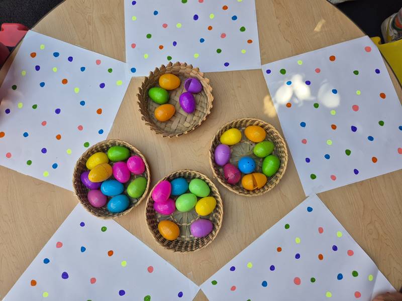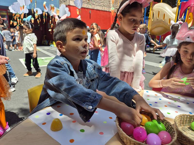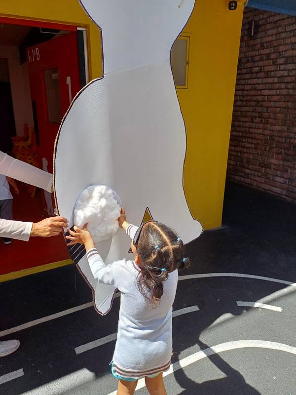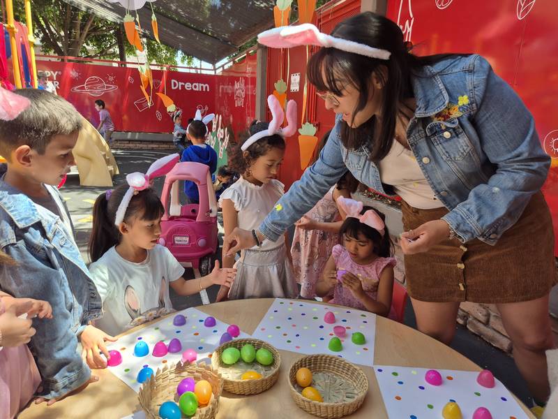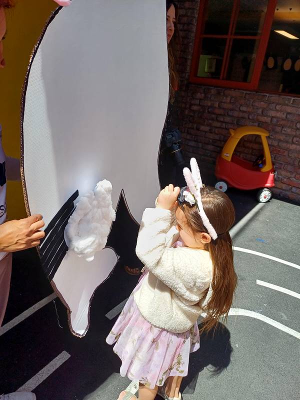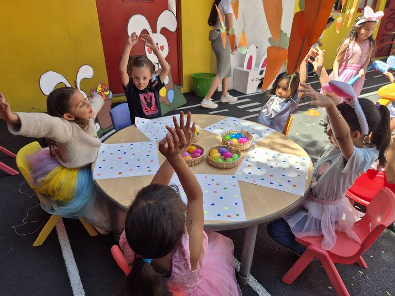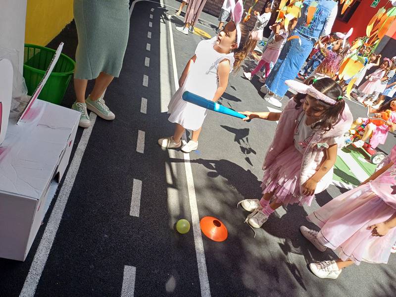 Before going on vacation, we celebrated Easter with a bunny party! Kids and teachers dressed in light colors and wore bunny ears! Teachers prepared incredible activities to do in the classroom. During recess, kids had to feed a bunny box with colorful balls. With their eyes covered, children pinned the tail on a bunny and were thrilled to discover the different parts where they placed it. They also had to solve a puzzle where kids had to match Easter eggs with dots of the same color. Kids won bunny stickers for prizes, and at the end of the day, all got a carrot to make bubbles to enjoy their spring vacation!