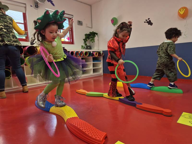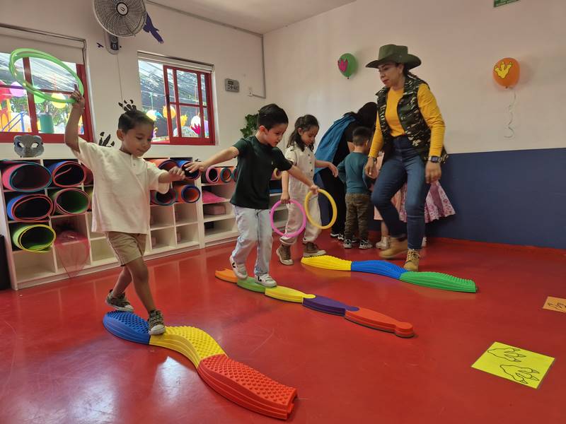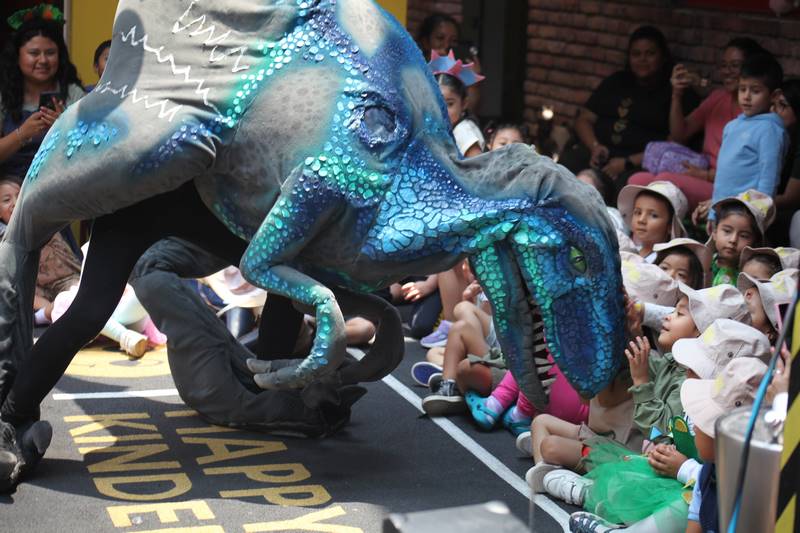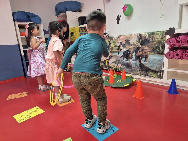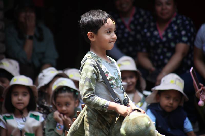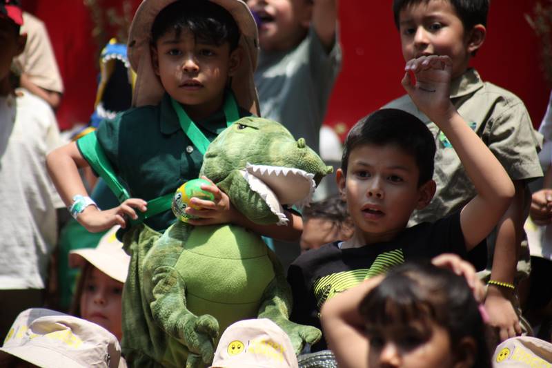 En otro juego, los niños tuvieron que seguir las huellas de dinosaurio para encontrar un triceratops. Lo más emocionante fue cuando los dinosaurios visitaron nuestro Happy Kinder; los niños ayudaron a entrenarlos, tuvieron la oportunidad de tocarlos e incluso bailaron con ellos. Los maestros les teníamos miedo a esos dinosaurios, ¡pero los niños estaban encantados de verlos!