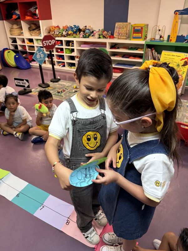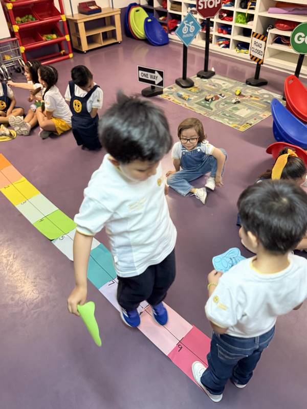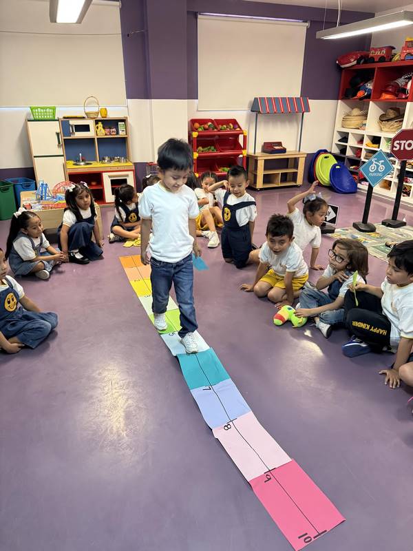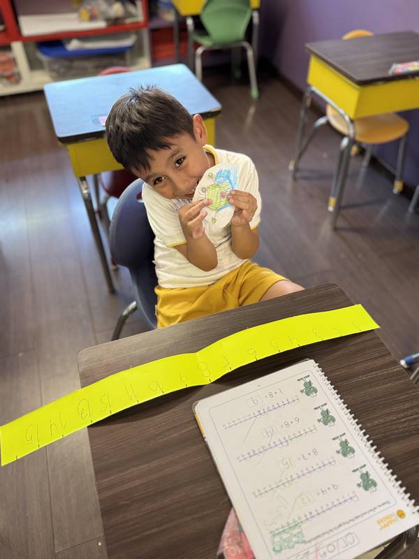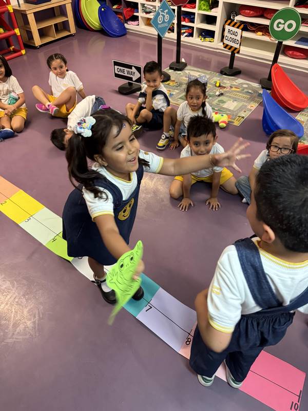 This week, our Kinder 3 students enjoyed a hands-on learning experience through a fun story: René the Frog and his craving for a fly. Using the number line as their stage, the children became frogs and flies, enthusiastically jumping from number to number, exploring quantities and positions, and taking their first steps into addition.