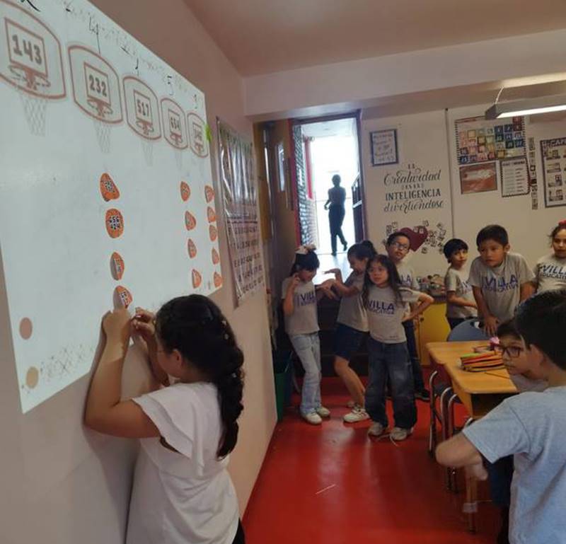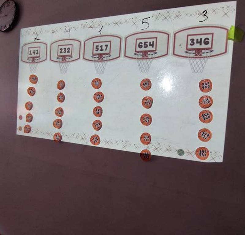 La jornada comenzó con una explosión de expectativas. La miss, con una sonrisa cómplice, reveló el tablero: canastas de baloncesto numeradas y una pila de balones de papel, cada uno con una resta de tres cifras con transformación esperando ser resuelta. La emoción era palpable; no era una clase de mate cualquiera, ¡era un juego!
