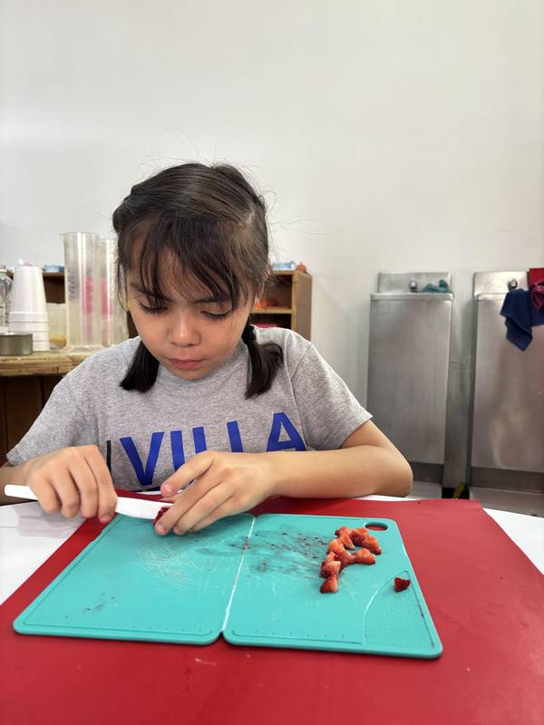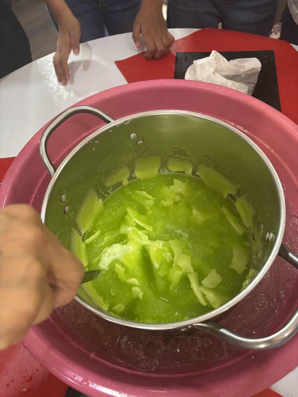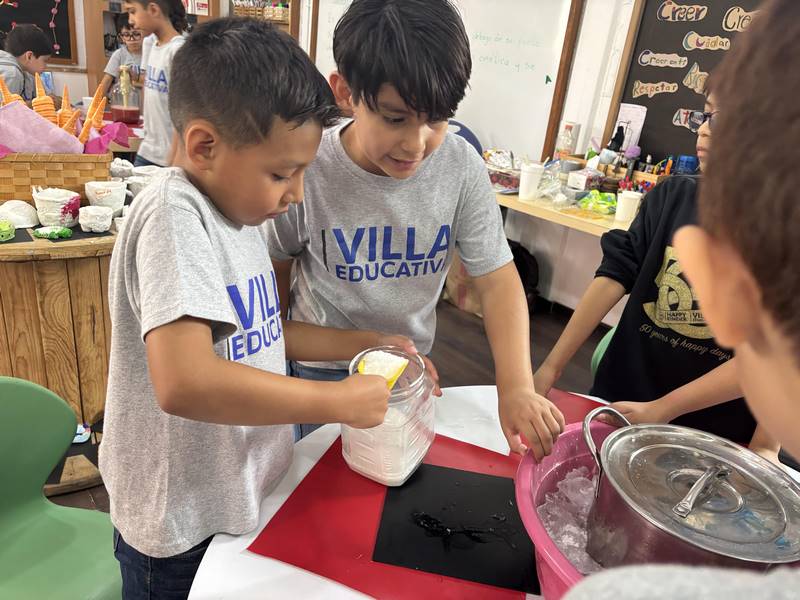 Para preparar la mezcla, los estudiantes trabajaron en equipos para cortar frutas, machacarlas y mezclarlas con agua y azúcar, así como con un ingrediente secreto (yema de huevo). Después de tener la mezcla lista, vertieron el líquido en grandes ollas de metal que se sumergieron en una pequeña tina llena de hielo y sal, y comenzaron a turnarse para girar rápidamente la olla en una dirección y luego en la otra, centrifugando así la mezcla para lograr que cambiara de estado y “esponjara”. Después de girar incansablemente durante varios minutos, la mezcla comenzó a parecer más al hielo y menos al agua.