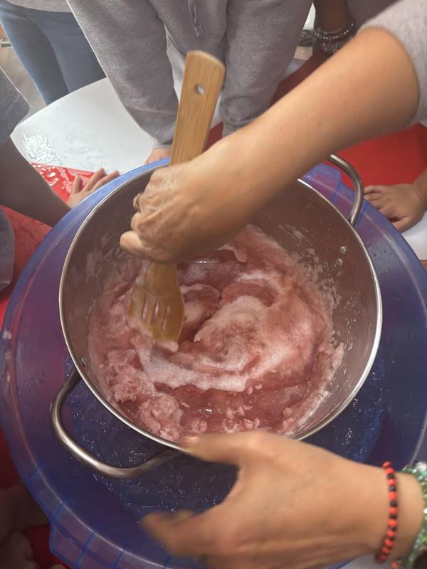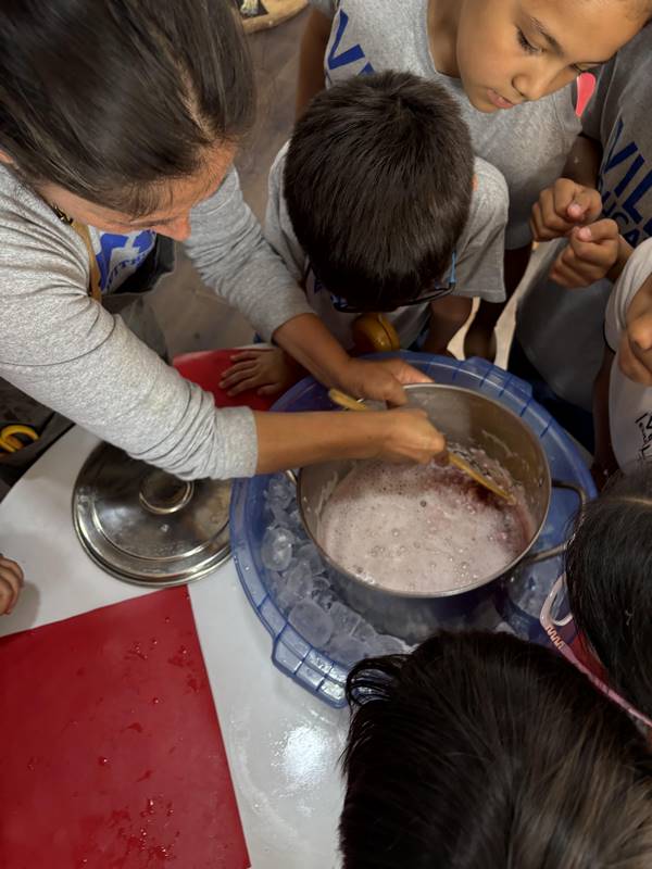 To prepare the mix, students worked in teams to cut some fruits, squish them and mix them with water and sugar as well as with a secret ingredient (egg yolk). After having the mix ready, they poured the liquid into big metal pots that were dipped in a small tub filled with ice and salt and began taking turns to quickly turn the pot in one direction and the other to centrifugate the mix making it change states and “fluff up”. After relentlessly turning for some minutes, the mix began looking more like ice and less like water.