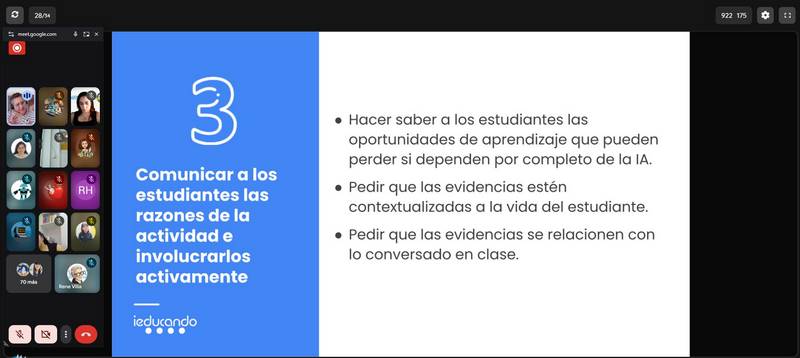 El viernes pasado, nuestro personal recibió una capacitación que busca proporcionar a los docentes de la comprensión básica del funcionamiento de la inteligencia artificial, para conocer sus posibilidades y limitaciones, como base para el diseño de actividades de aprendizaje que disminuyan la posibilidad de plagio mediante herramientas de Inteligencia Artificial, y que vean a esta tecnología como un aliado que potencie las oportunidades de aprendizaje.