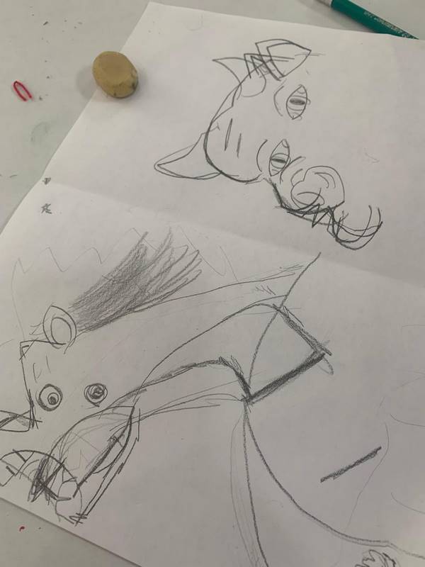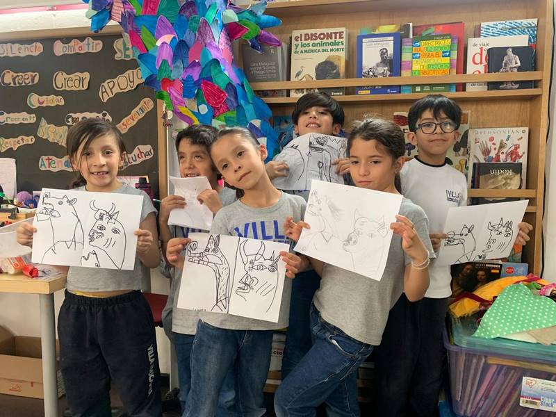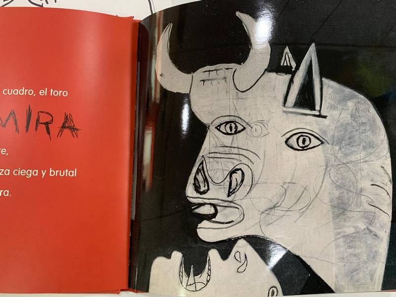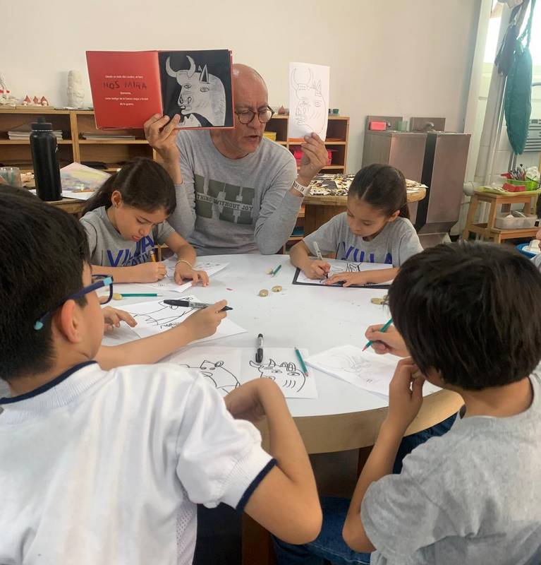 En la segunda clase, los alumnos aplicaron lo que aprendieron del Cubismo; dibujaron ahora al caballo y al toro que aparecen en el mural. El profesor Roberto destacó cómo Picasso no solo a “alteraba la realidad” con Cubismo a las personas, sino también a los objetos y animales.