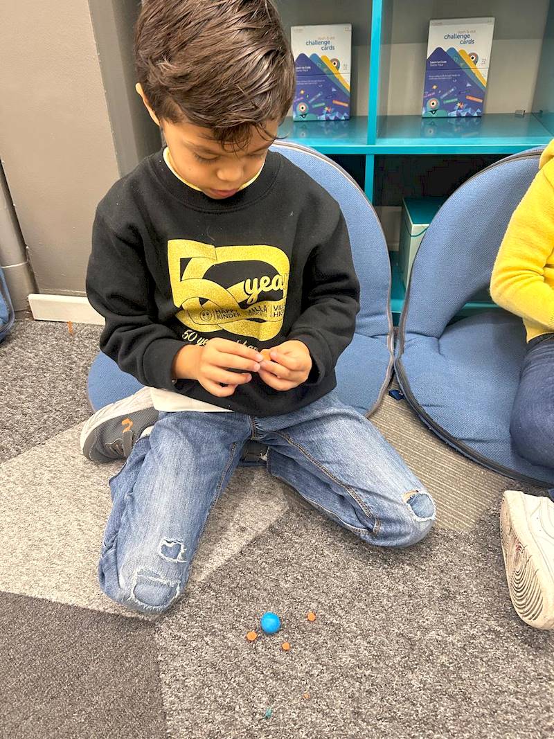 Over several sessions, the children explored space and the universe through creative and sensory experiences. They started by watching virtual reality videos that transported them to other planets. In the classroom, we built a mini planetarium using a projector to simulate stars and planets. Inspired by these experiences, the children imagined Dash the robot traveling through the solar system. In small teams, they molded a Dash figure out of playdough and designed a parachute using rubber, paper, and ribbons. Finally, they tested