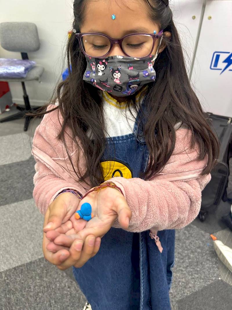 Durante varias sesiones, los niños exploraron el espacio y el universo a través de diversas experiencias sensoriales y creativas. Comenzaron observando videos de realidad virtual que los transportaron a otros planetas. En el aula, construimos un mini planetario con un proyector para simular estrellas y planetas. Inspirados por estas experiencias, imaginaron que el robot Dash viajaba por el sistema solar. En pequeños equipos, moldearon una figura de Dash en plastilina y diseñaron su paracaídas con hule, papel y listones. Finalmente, probaron su paracaídas elevándose con una sopladora y observaron cómo descendía.