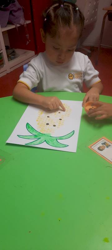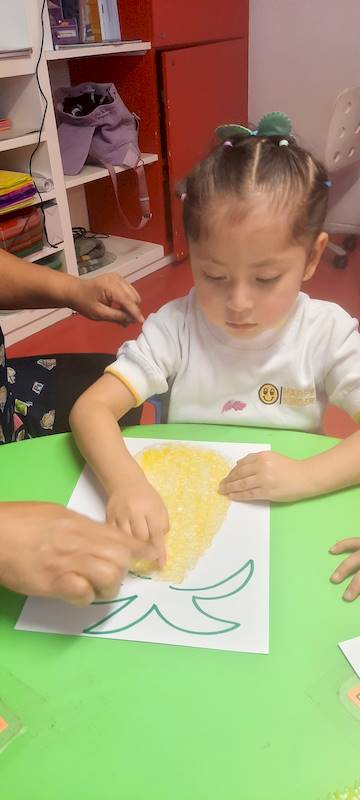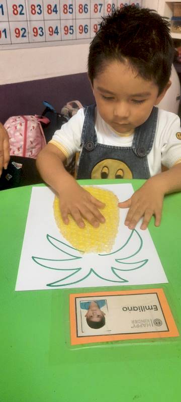 En nuestra última clase los niños de K1 se divirtieron bailando la canción “El baile de las frutas” y pintaron una rica piña con textura. Para nuestros niños es muy significativo hacer este tipo de actividades, pues les ayuda a desarrollar habilidades sensoriales, motoras y creativas, así como la expresión emocional, la cual permite que expresen sus sentimientos y emociones de una forma visual y creativa.