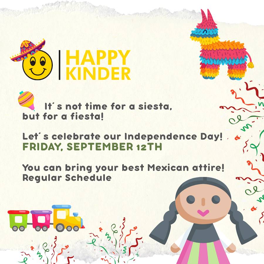 Remember that our first event is coming! Come and join us to celebrate our Independence Day in Happy Kinder! You can bring your best Mexican Attire. We will have games and activities to commemorate this day, everything will have a festive touch. Our celebration will be held on Friday, September 12th.