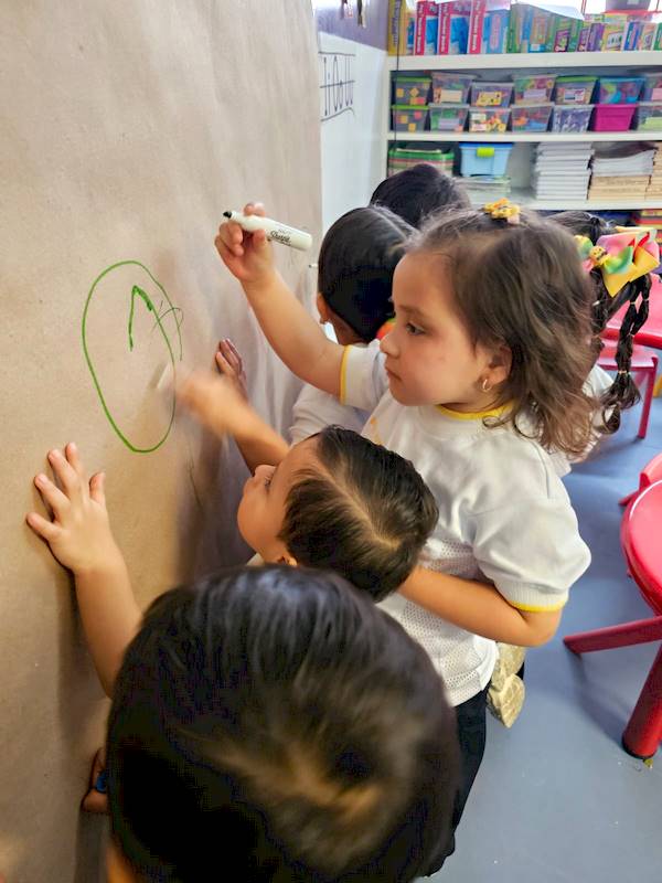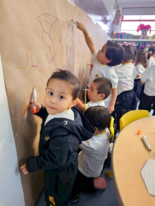En esta actividad los alumnos expresaron sus emociones, con pintura y plumones sobre un papel kraft de tamaño mural en el cual, al ritmo de la música, pintaban lo que ellos querían expresar y compartir con sus maestras y compañeros. Los alumnos han comenzado a conocer un nuevo espacio y a sus maestras que siempre cuidarán de ellos.