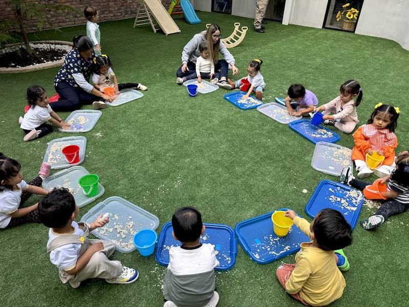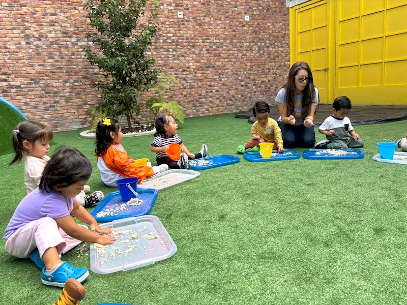 Después, los niños salieron al patio para disfrutar de charolas sensoriales con arena, donde pudieron experimentar diferentes texturas con sus manitas y sentidos, desarrollando así su percepción sensorial de una manera natural y entretenida.