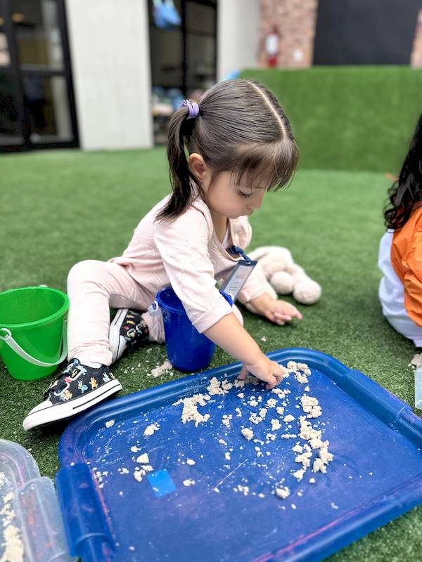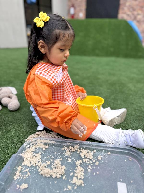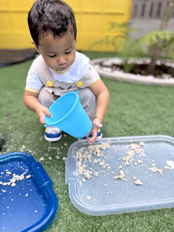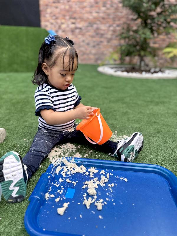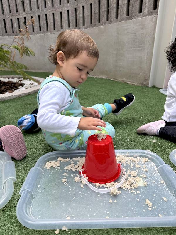 After that, the children went outside to enjoy sensory trays with sand, where they could experiment with different textures using their little hands and senses, naturally developing their sensory perception.
