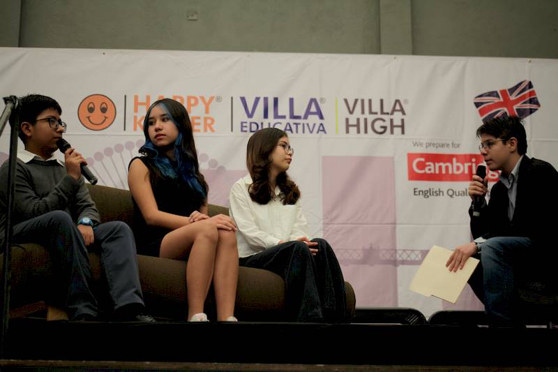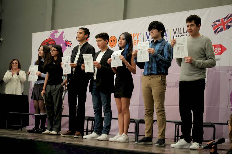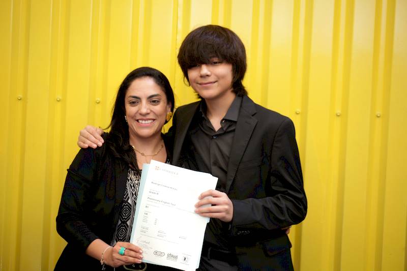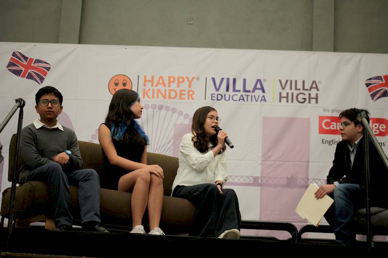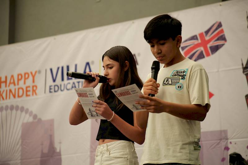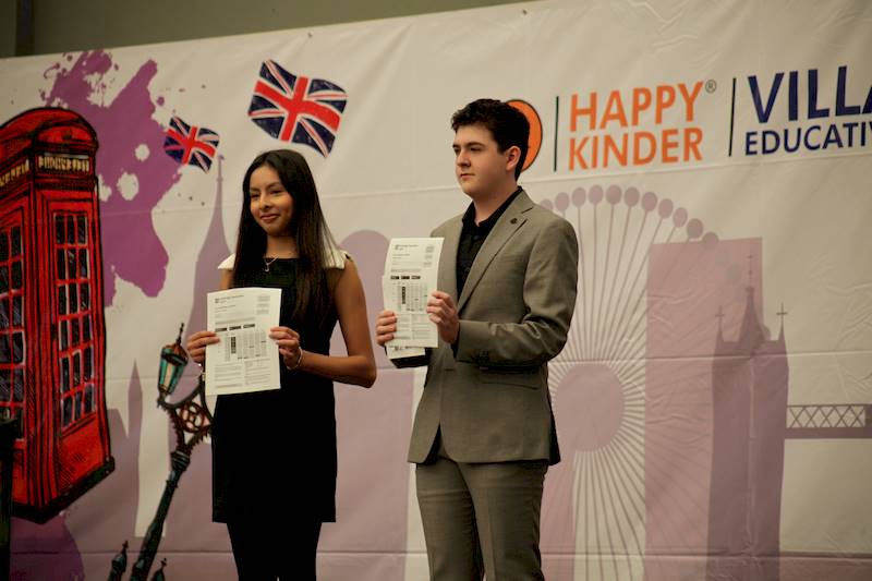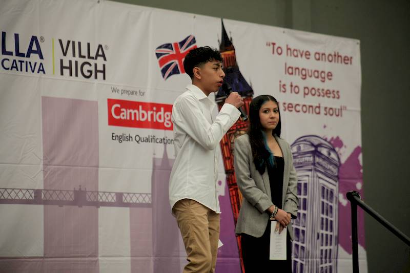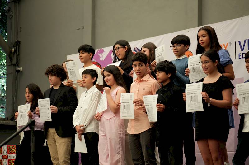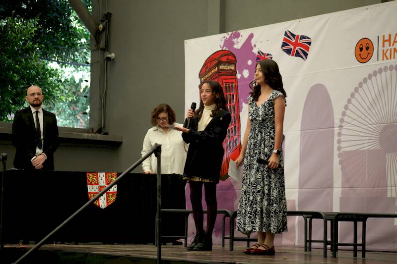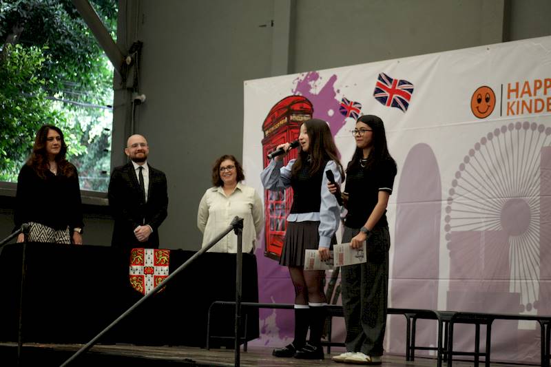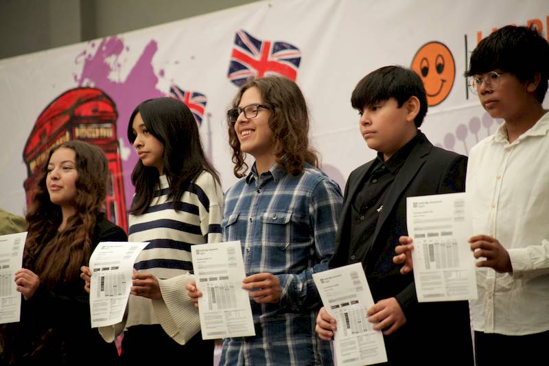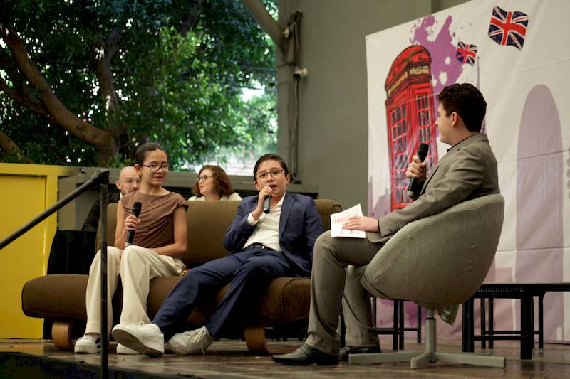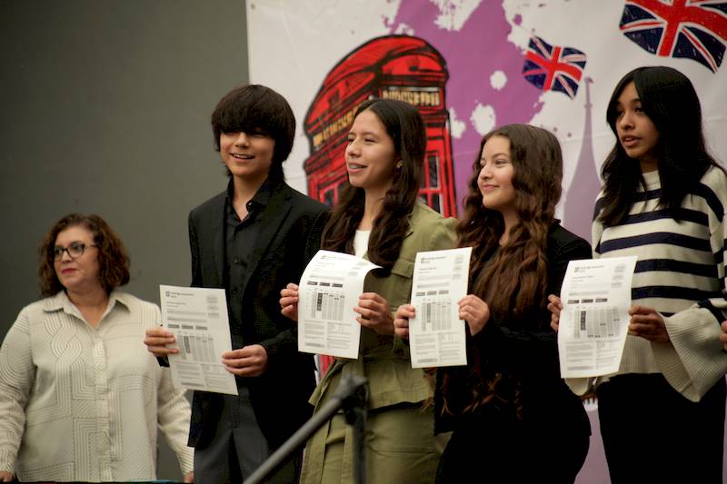 Un momento destacado de la ceremonia fue “The Cambridge Show”, una dinámica al estilo programa de entrevistas en la que se les preguntó a los estudiantes sobre sus pensamientos y emociones durante la preparación y realización del examen. Un enorme aplauso para nuestros participantes: su fluidez en inglés realmente ayudó a que la escena se sintiera lo más auténtica posible.