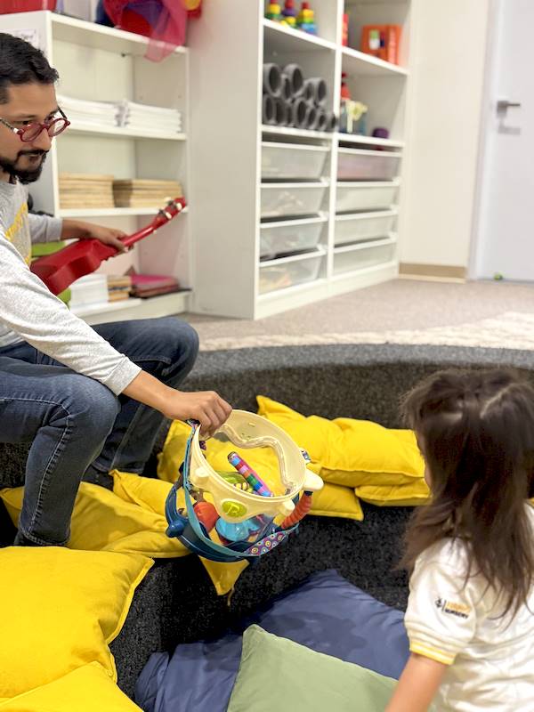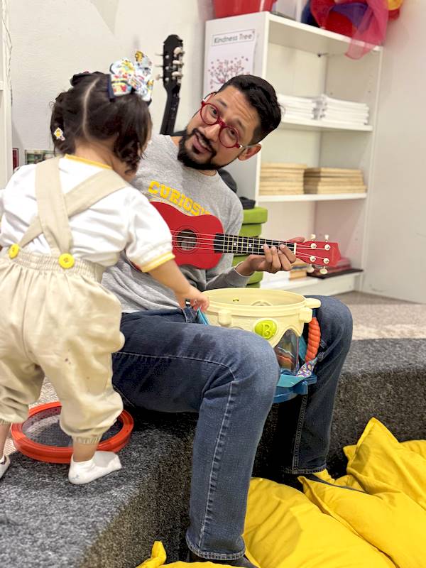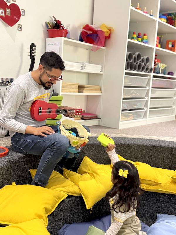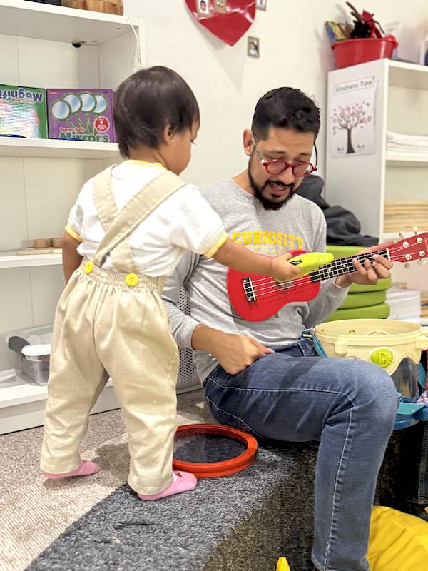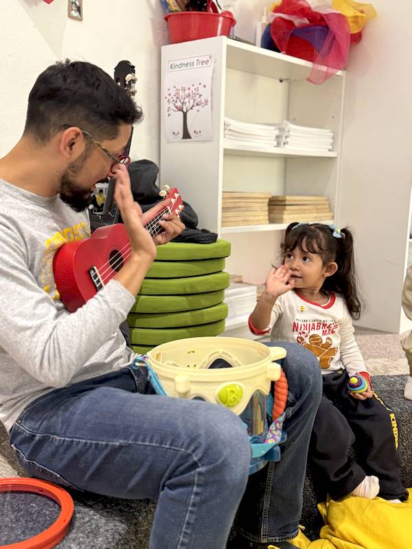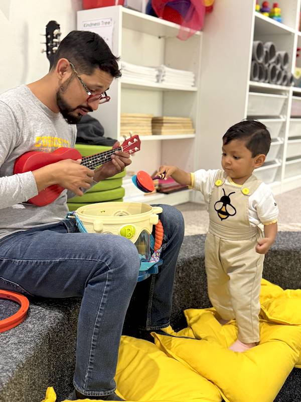 En el área de música, he disfrutado muchísimo compartiendo estas primeras semanas con los niños y niñas de Nursery. Aprendimos canciones nuevas llenas de ritmo, exploramos instrumentos de percusión como tambores, maracas y cascabeles, y cantamos juntos mientras los acompañaba tocando el teclado, el ukelele y la guitarra.
