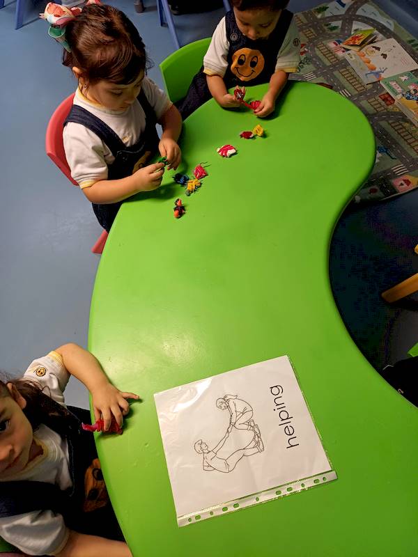 Kids worked in different stations; each station depicted one of the purposes of our hands: hands are for drawing, hands are for helping, hands are for playing, and hands are for creating. Working in stations encourages independence, decision-making, and collaboration with peers. We also watched a video about good and bad actions, where kids had to give a thumbs-up if the image portrayed a correct action and a thumbs-down if it portrayed an action that was not kind.