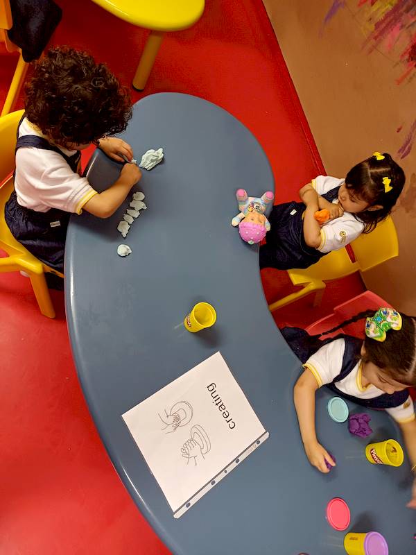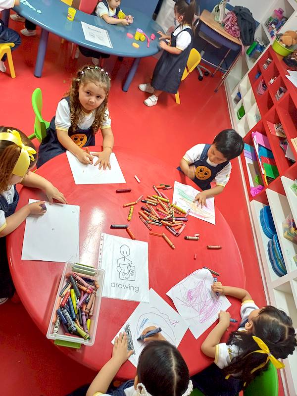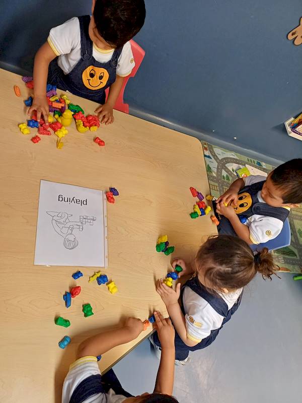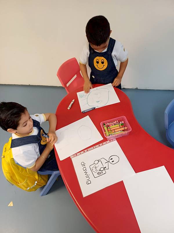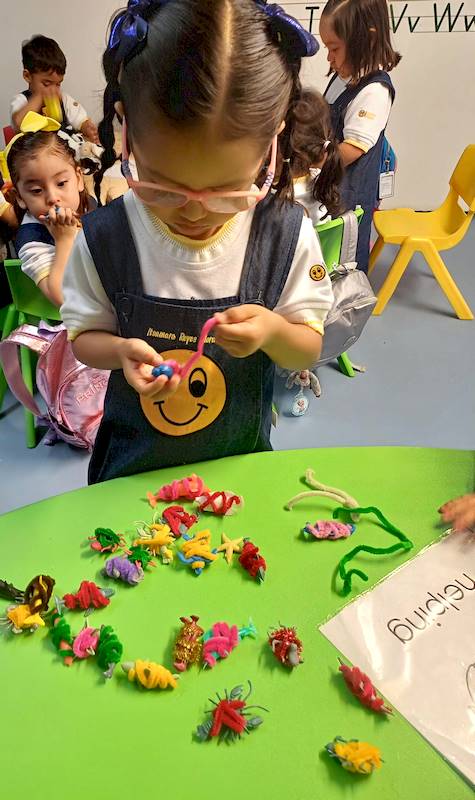 Los pequeños trabajaron en diferentes estaciones; cada estación representaba uno de los usos de las manos: dibujar, ayudar, jugar y crear. Trabajar en estaciones fomenta la independencia, la toma de decisiones y la colaboración con los compañeros.