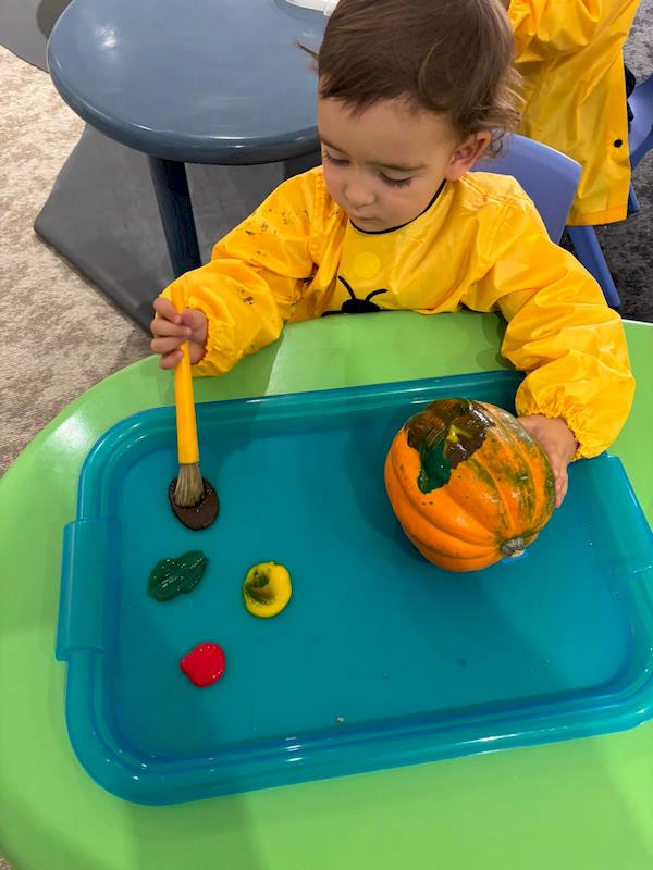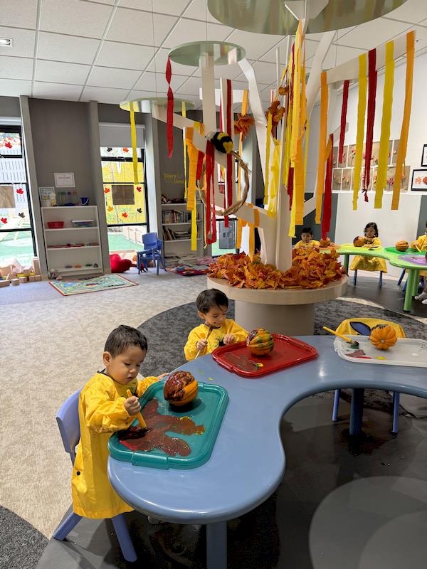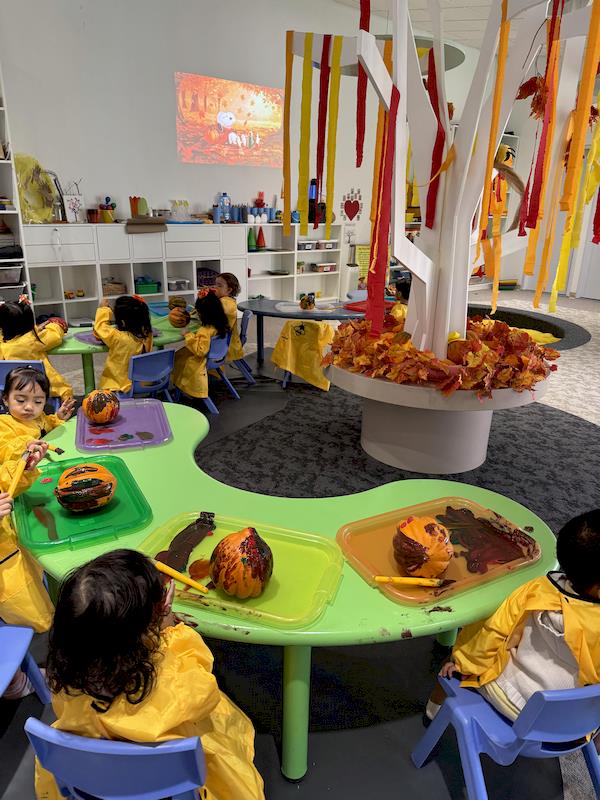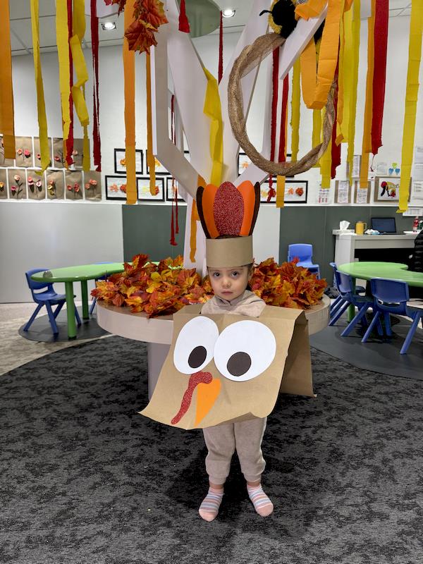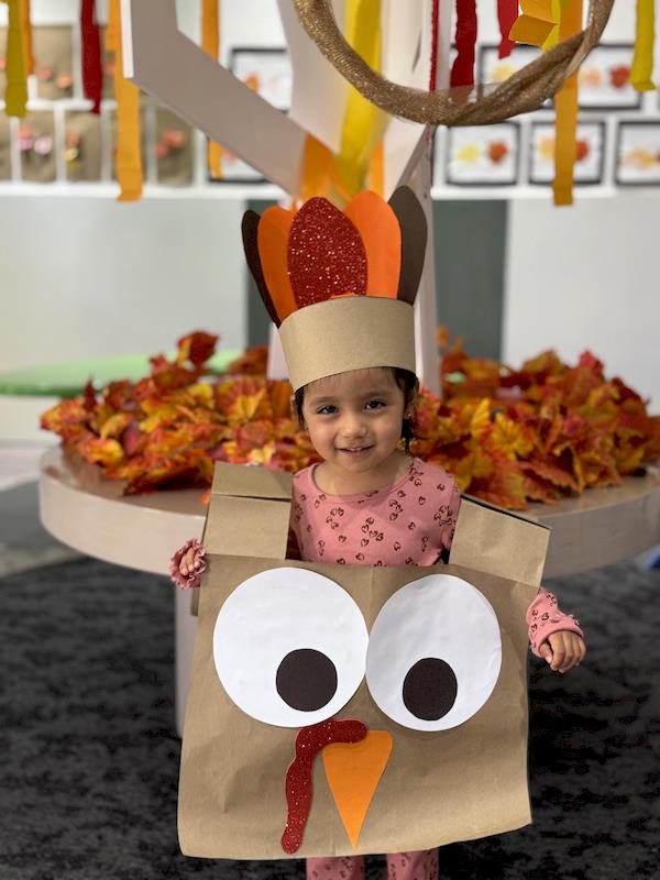 In our creative area, each child painted their own pumpkin and created a thankful turkey decorated with photographs of the things they appreciate: their family, toys, friends, food, and favorite moments.