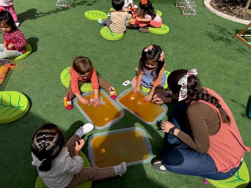 Throughout the day, we carried out a variety of sensory and artistic activities that allowed the children to explore, have fun, and express what they are grateful for. We began with orange gelatin, inviting them to touch, squish, and discover new textures. Then they worked with orange-colored rice, searching for hidden red hearts, which encouraged attention, curiosity, and excitement. They also enjoyed sensory corn, perfect for strengthening fine motor skills and coordination.