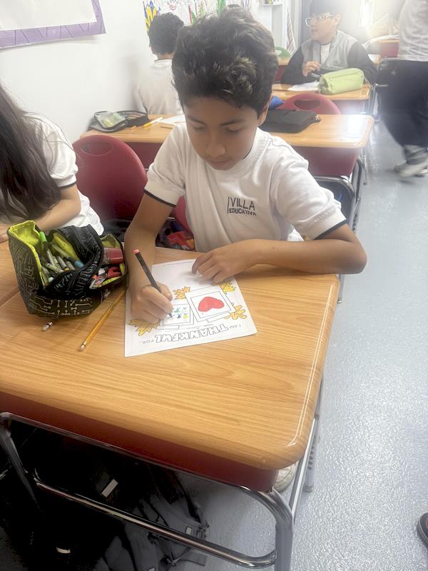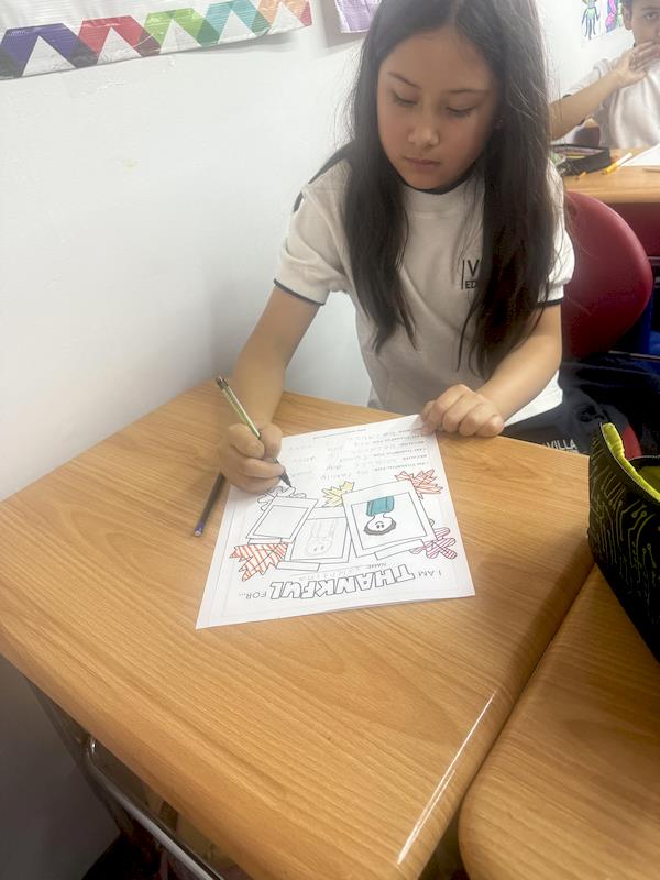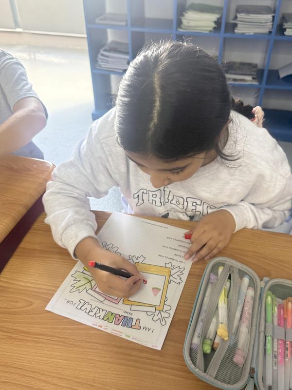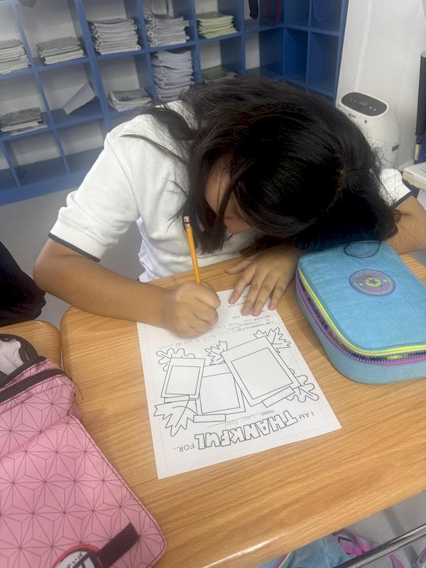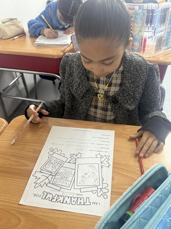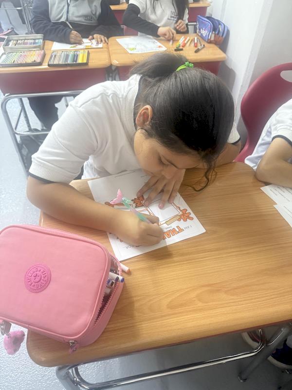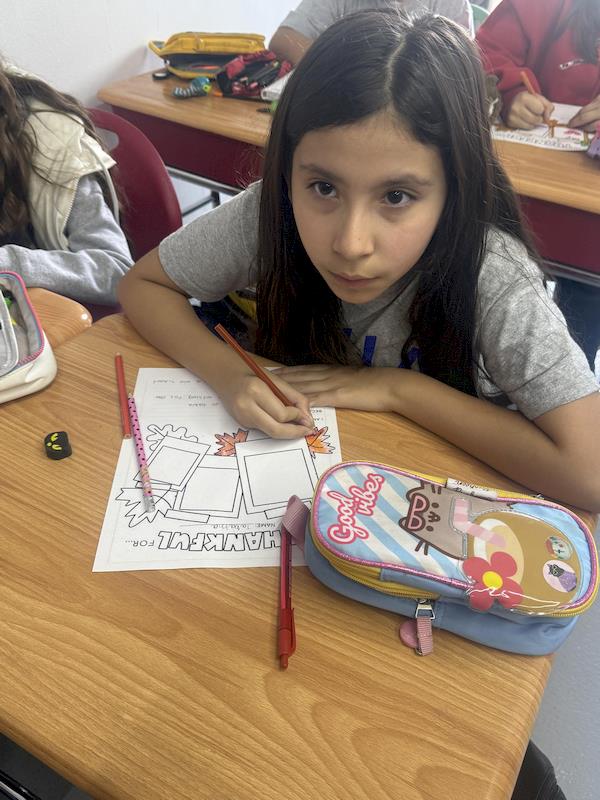 The fifth-grade Thanksgiving activity was a meaningful and creative experience that allowed students to reflect on gratitude in a personal and thoughtful way. Each student was asked to write three things they were thankful for and then illustrate them. This simple task encouraged deep reflection, helping students recognize the people, moments, and experiences that bring value to their lives.
