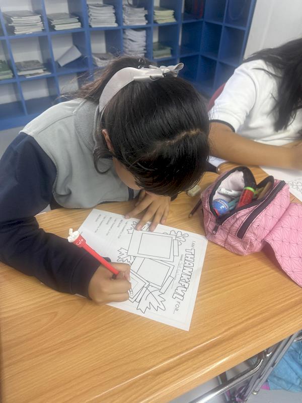 Throughout the activity, students showed genuine engagement. Many expressed gratitude for their families, friends, teachers, and even small but significant aspects of daily life, such as their pets, hobbies, or good health. Their illustrations added a special touch, showing their ideas with color, imagination, and emotion. Some drawings were humorous, others touching, and all of them showed how each child views gratitude from their own perspective.