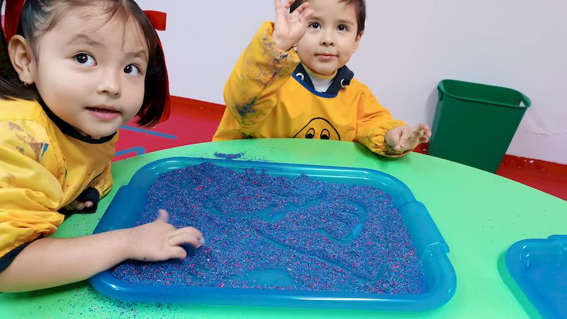 Además, esta actividad exige que los ojos sigan el movimiento del dedo mientras este crea una marca visible en el aserrín. Esta acción repetitiva y enfocada es esencial para desarrollar la coordinación mano-ojo, la cual es una habilidad clave que permitirá al niño leer una palabra y reproducirla en su cuaderno.