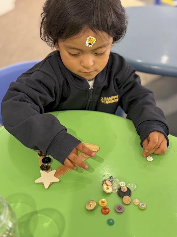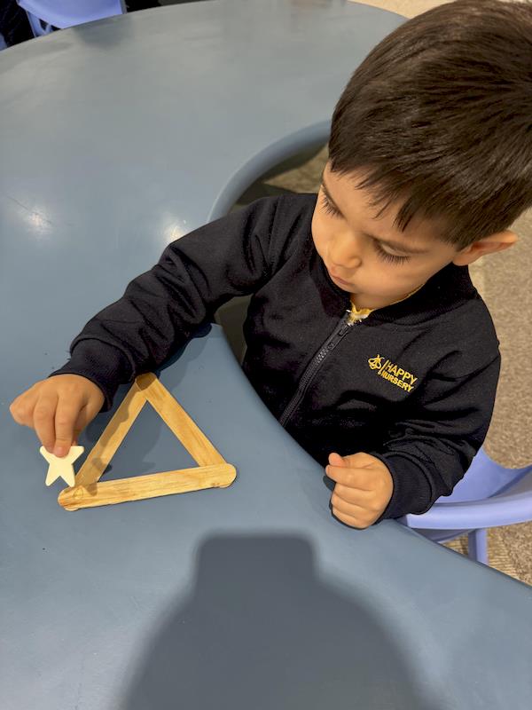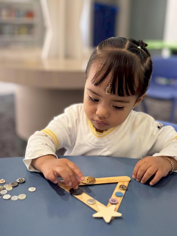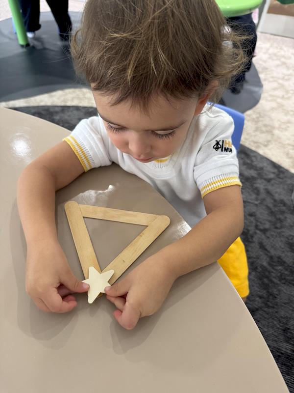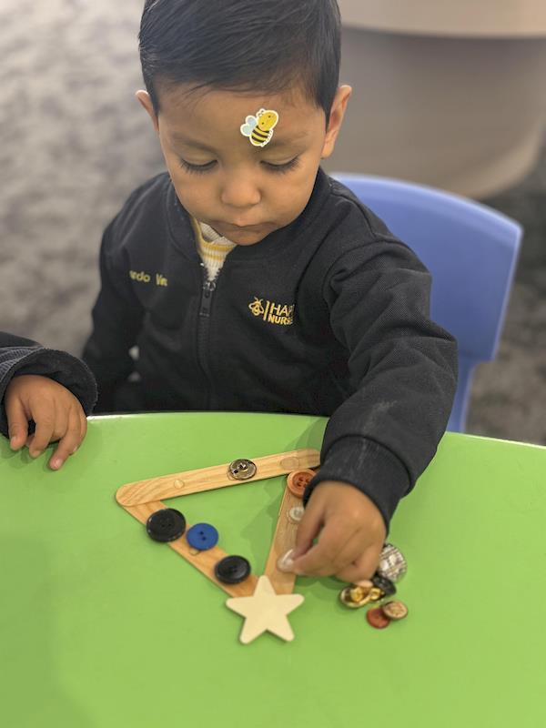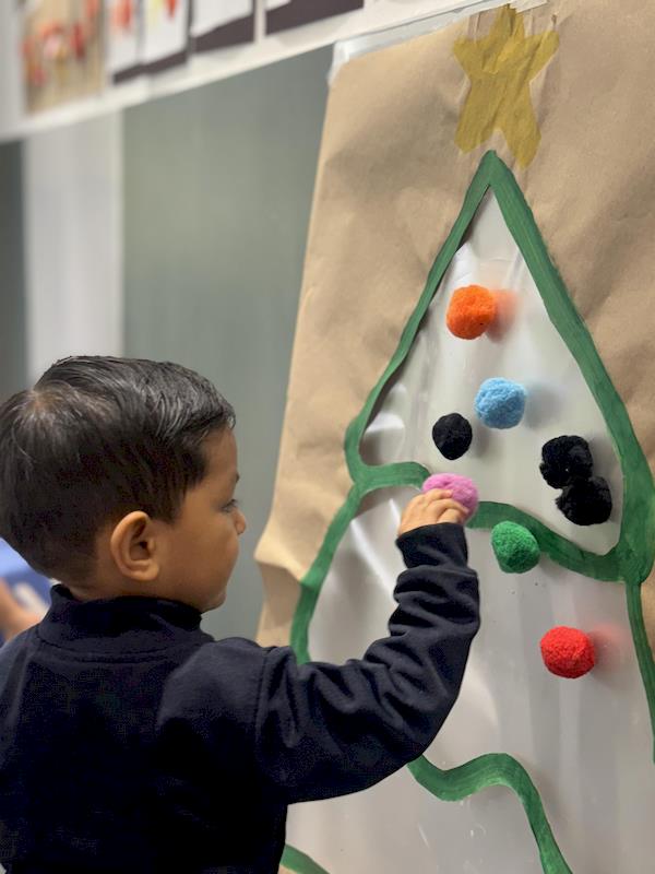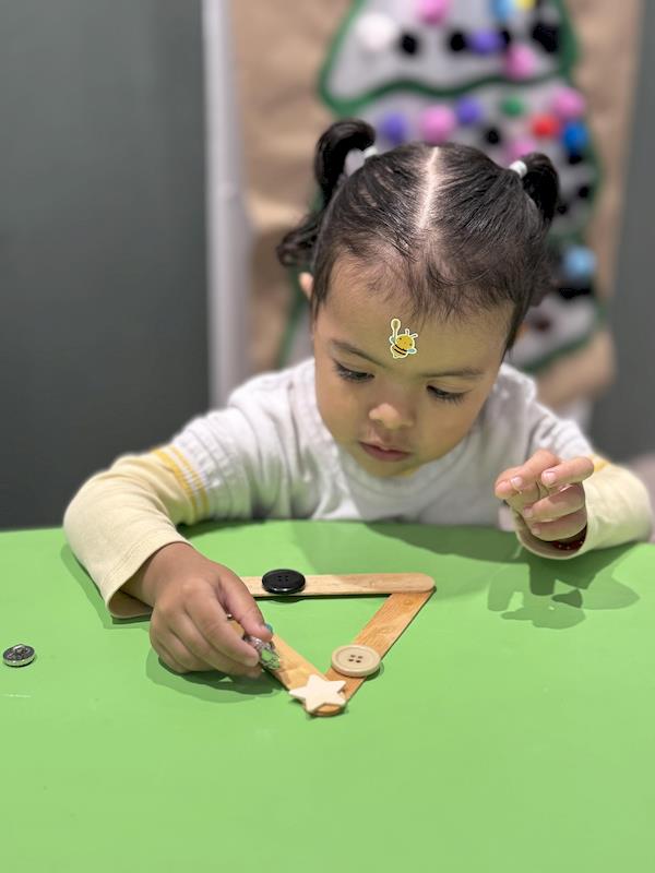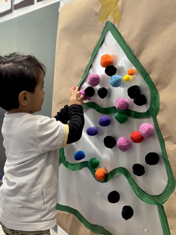 In our Nursery classroom, we began this month celebrating Christmas with lots of joy and creativity. First, we made our own Christmas trees using craft sticks arranged in a triangle shape. Each child decorated their tree with buttons, practicing fine motor skills as they chose, picked up, and glued each one.