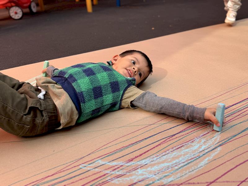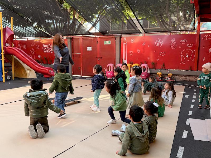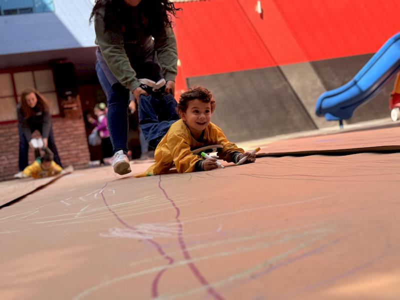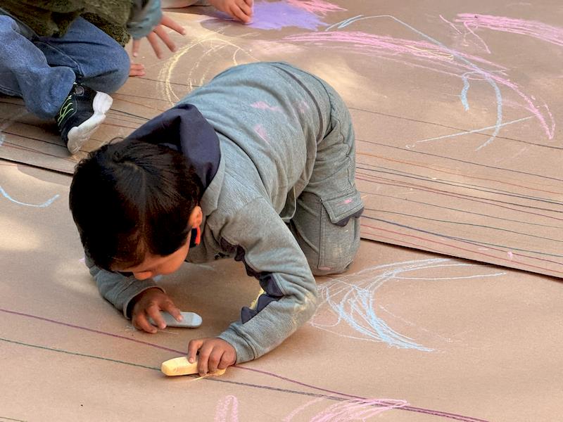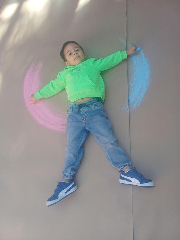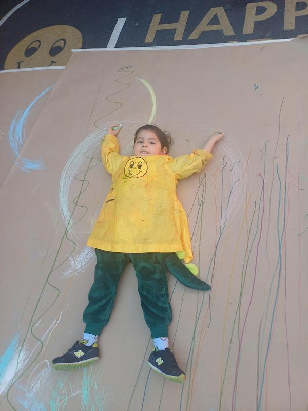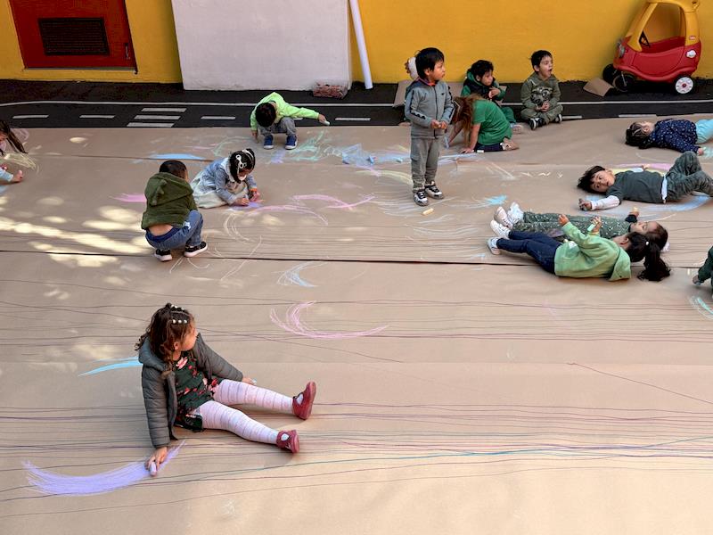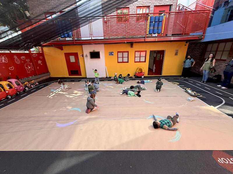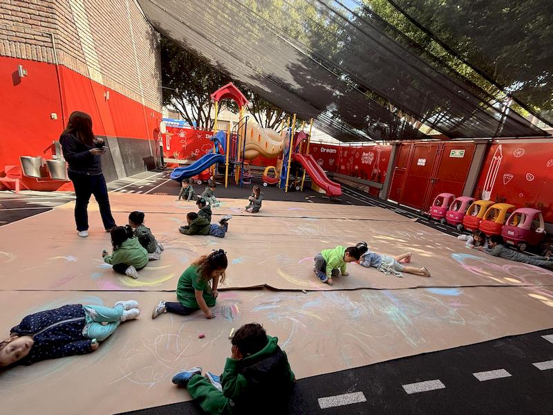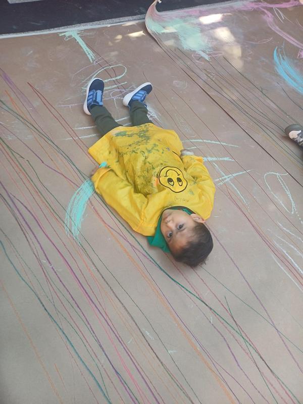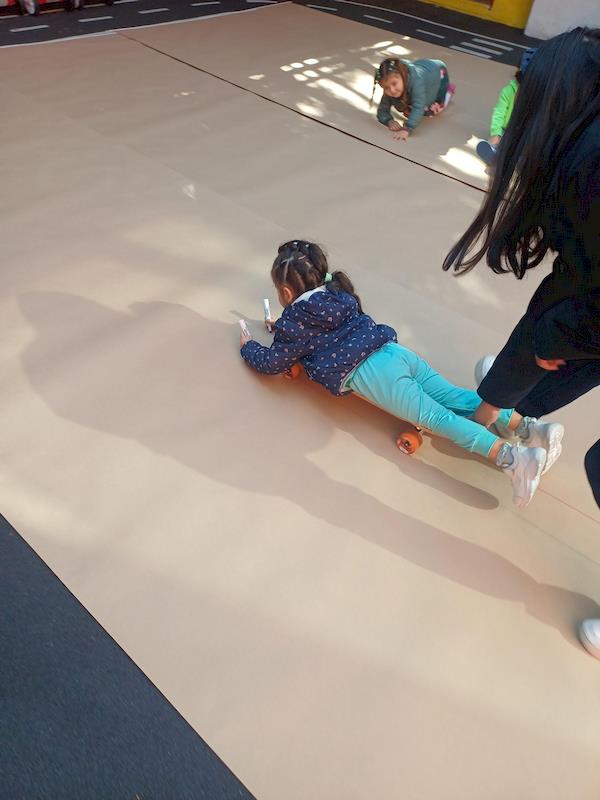 En nuestra clase de Literacy, realizamos actividades relacionadas con el Proyecto Reggio sobre la conciencia corporal. Para cerrar el cuento «De la cabeza a los pies», realizamos una actividad donde los niños exploraron las capacidades de sus cuerpos de una manera divertida y dinámica. Extendimos una hoja larga de papel kraft en el suelo y les proporcionamos crayones y tizas. En lugar de sentarse o pararse, los niños se tumbaron boca abajo sobre patinetas, las maestras los tomamos de los pies para que dibujaran el movimiento del rumbo de la patineta en el kraft.