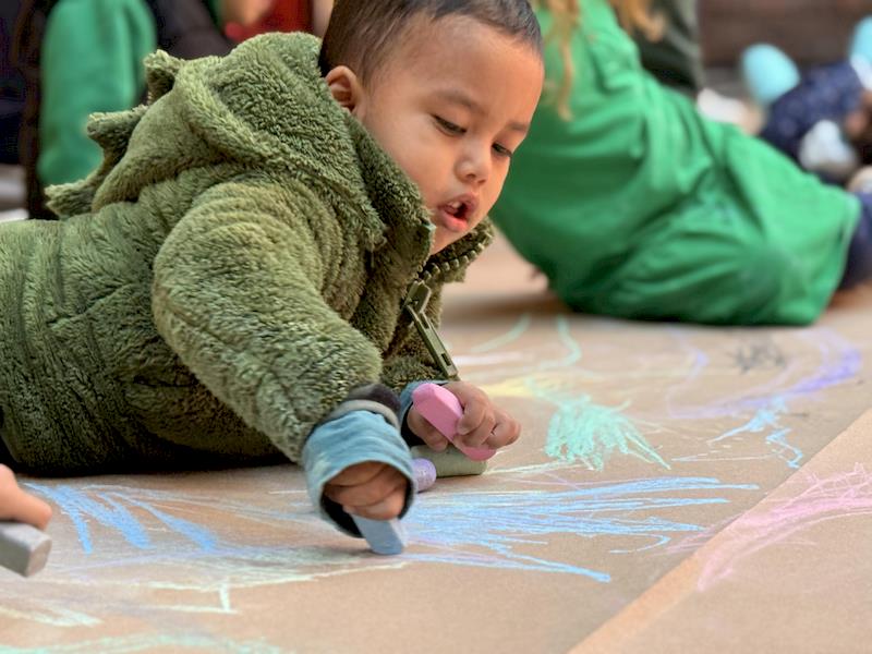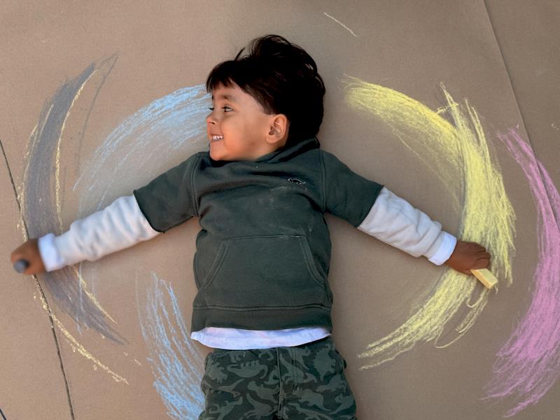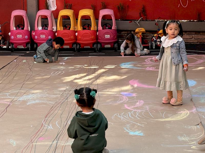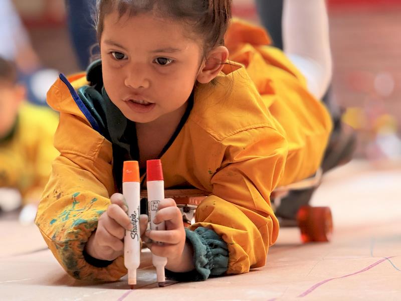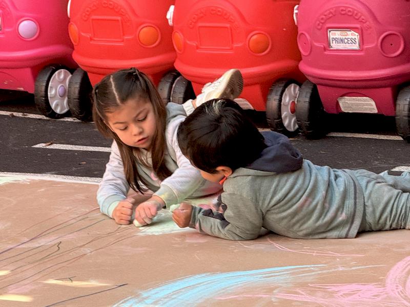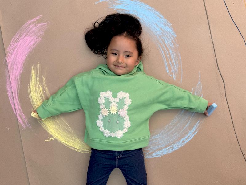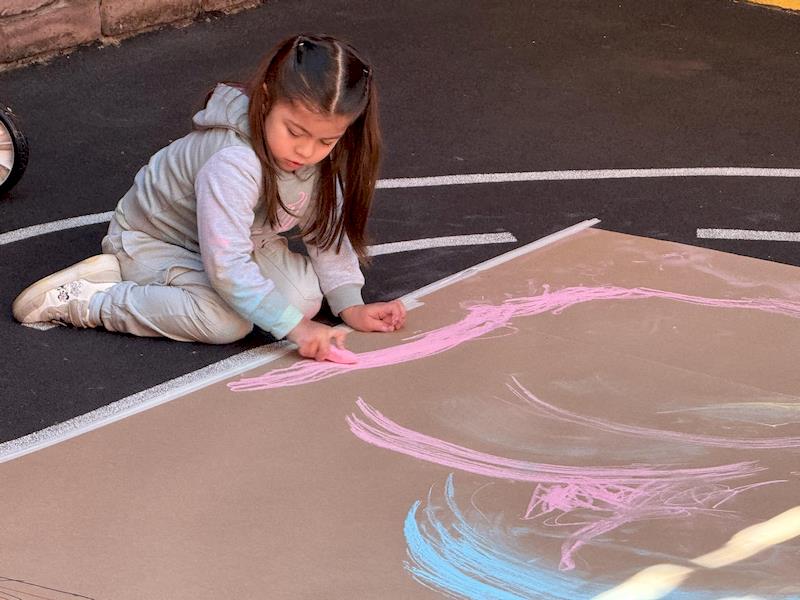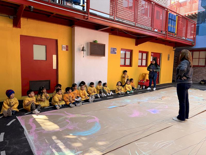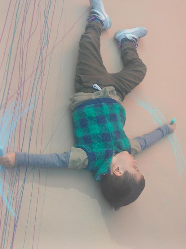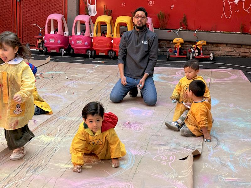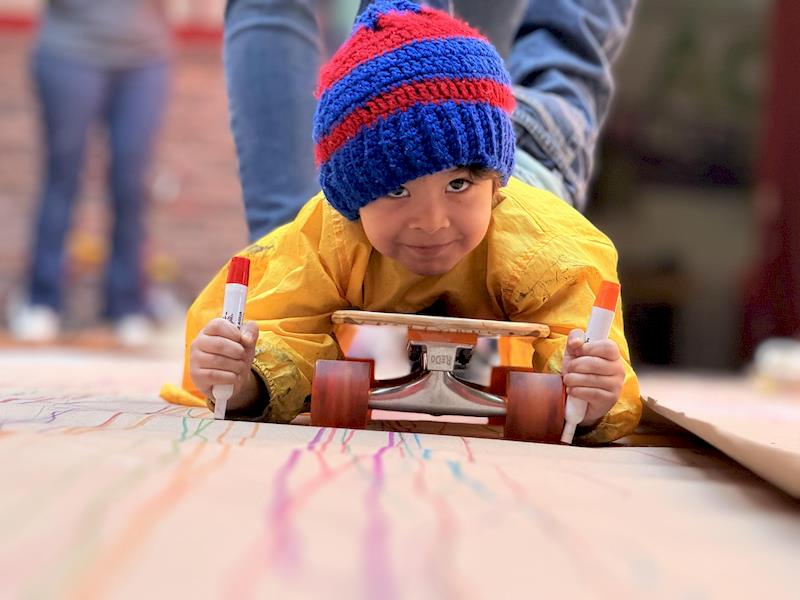 En nuestra clase de Literacy, realizamos actividades relacionadas con el Proyecto Reggio sobre la conciencia corporal. Para cerrar el cuento «De la cabeza a los pies», realizamos una actividad donde los niños exploraron las capacidades de sus cuerpos de una manera divertida y dinámica. Extendimos una hoja larga de papel kraft en el suelo y les proporcionamos crayones y tizas. En lugar de sentarse o pararse, los niños se tumbaron boca abajo sobre patinetas, las maestras los tomamos de los pies para que dibujaran el movimiento del rumbo de la patineta en el kraft.