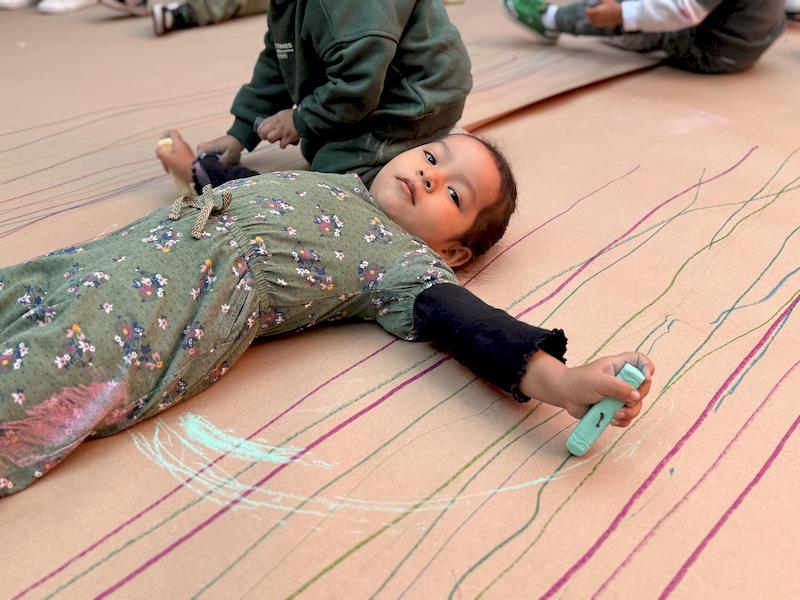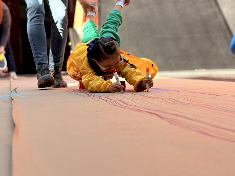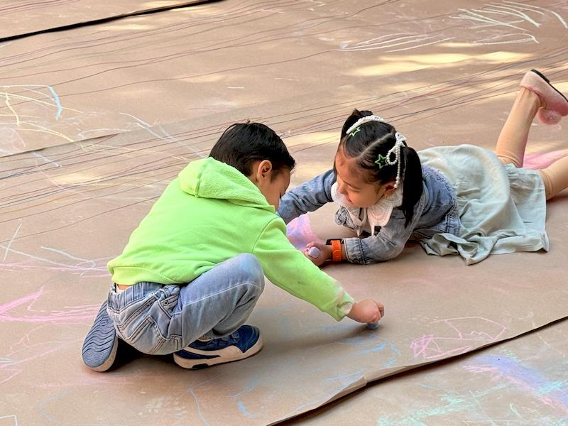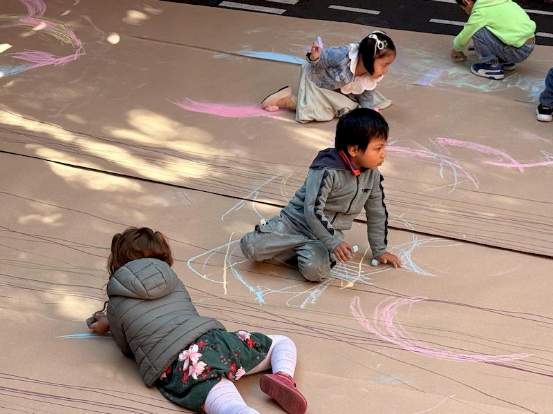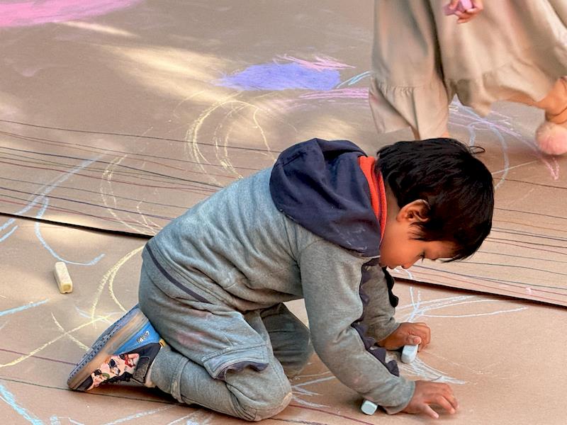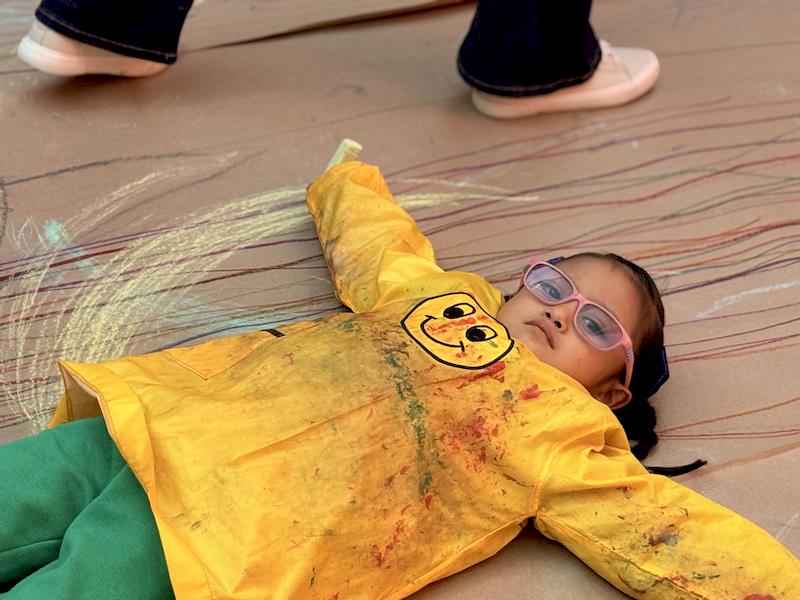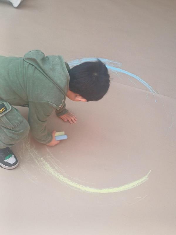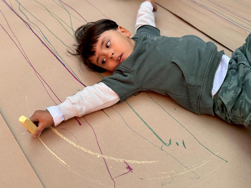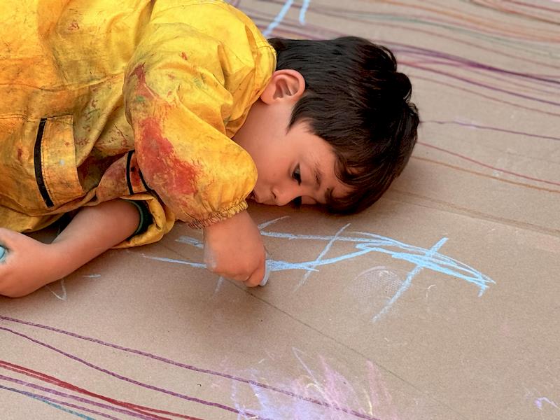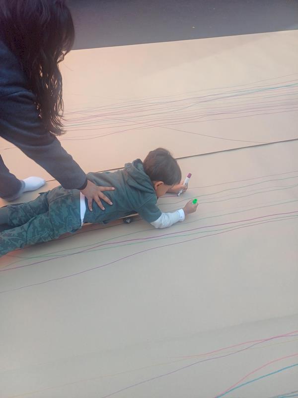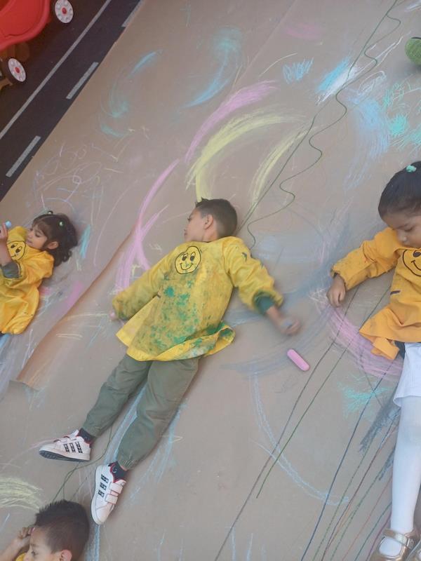 This playful setup encouraged full-body movement, coordination, and balance while giving them the freedom to create large, expressive strokes. As they glided across the paper, children experimented with colors, lines, and shapes, turning the activity into a joyful combination of art and gross-motor exploration.