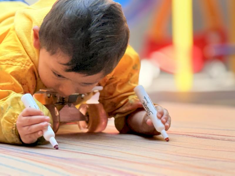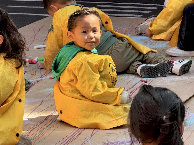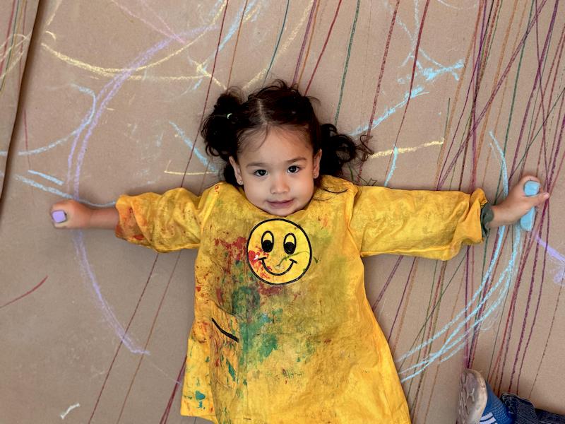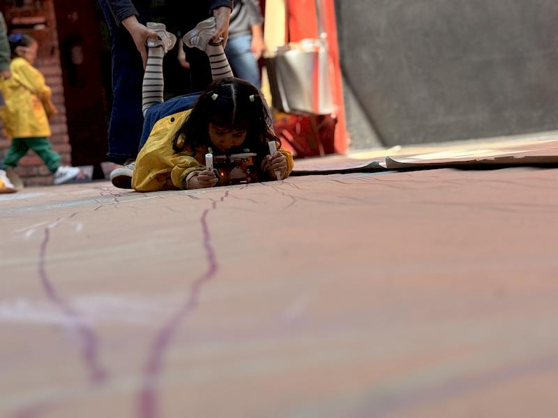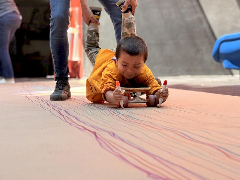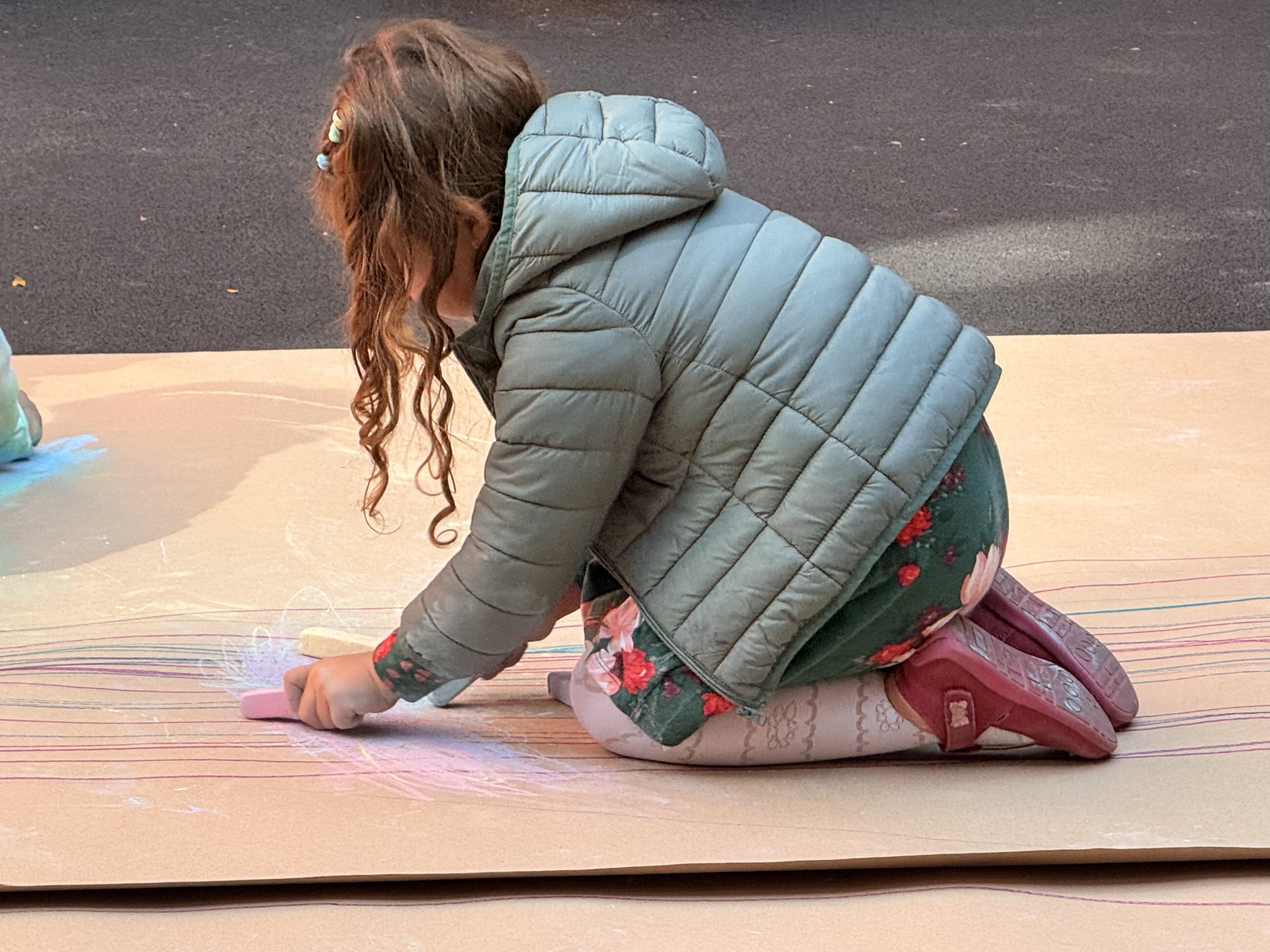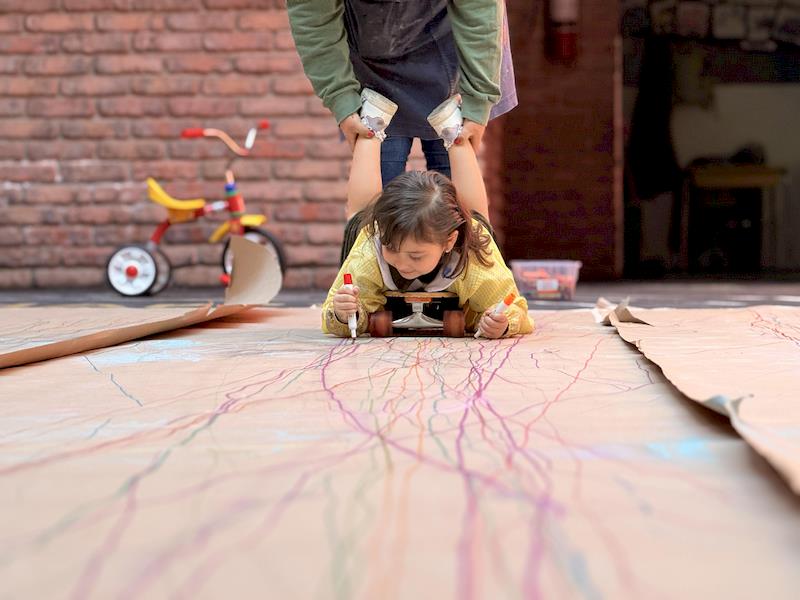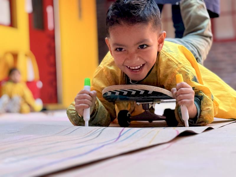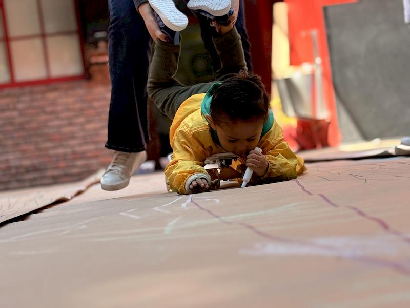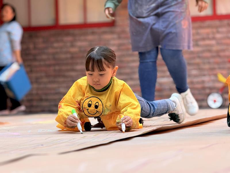 This playful setup encouraged full-body movement, coordination, and balance while giving them the freedom to create large, expressive strokes. As they glided across the paper, children experimented with colors, lines, and shapes, turning the activity into a joyful combination of art and gross-motor exploration.