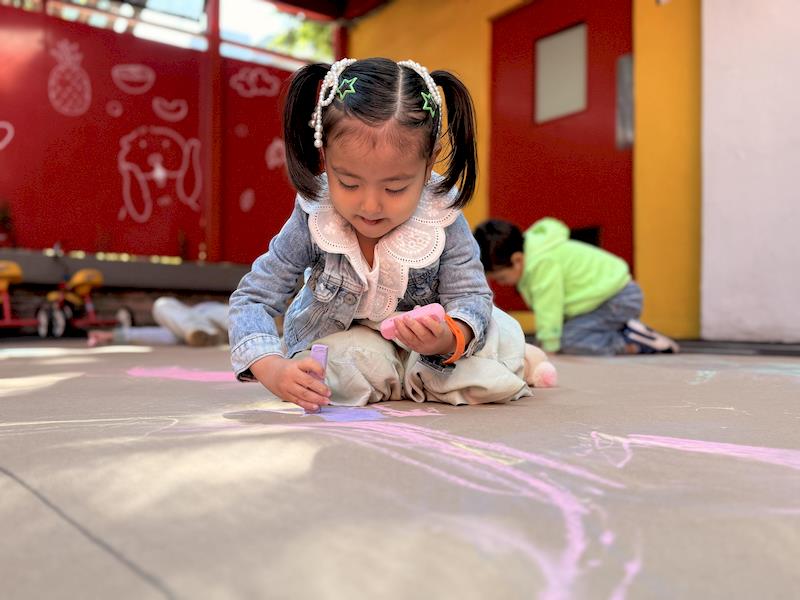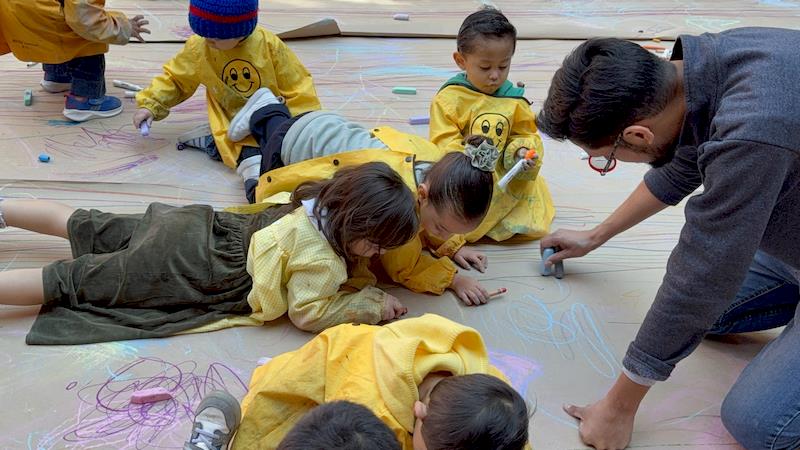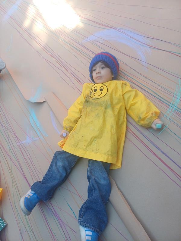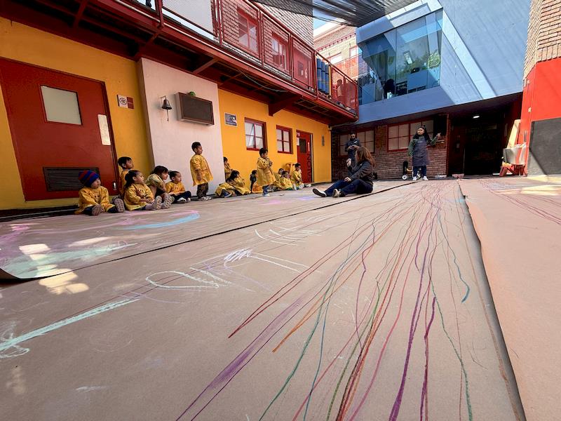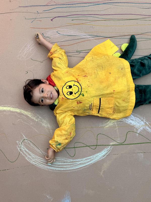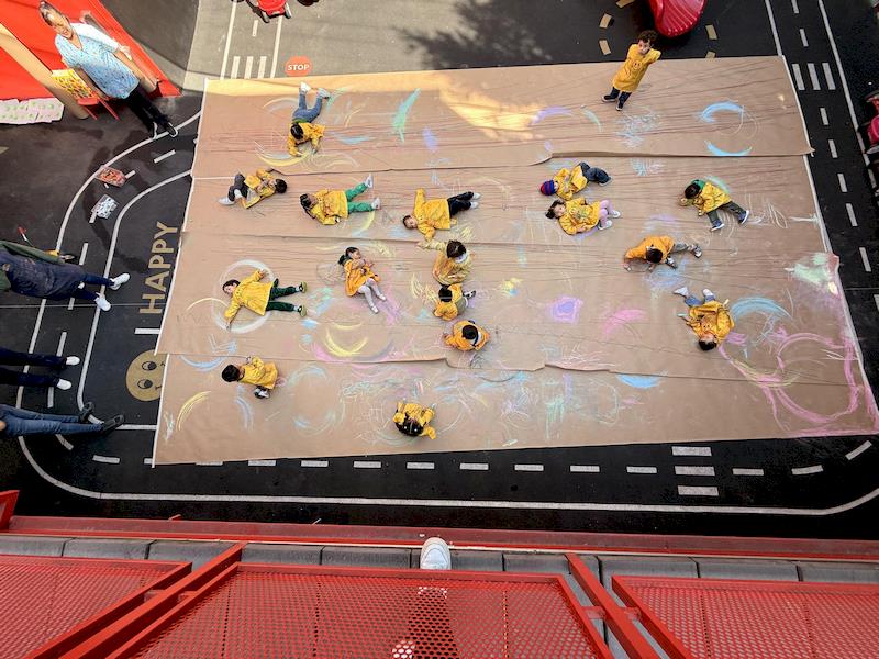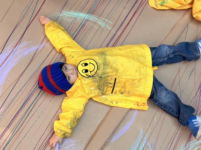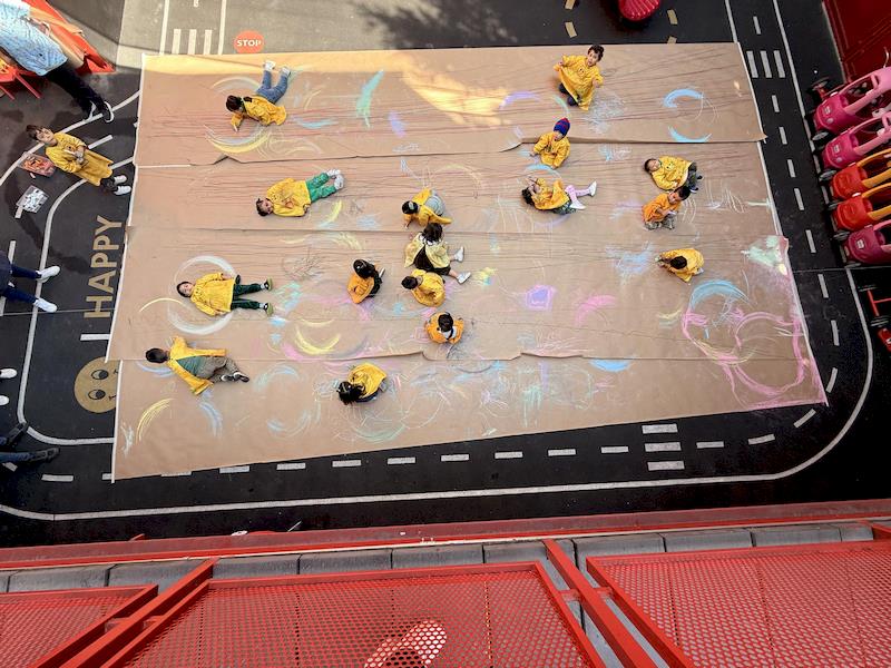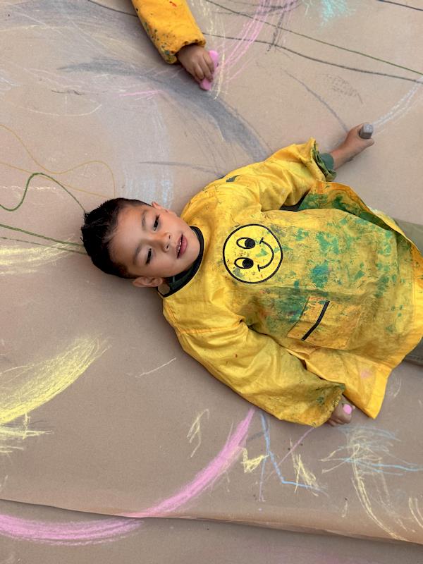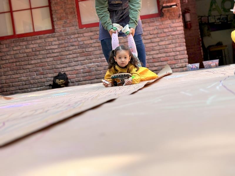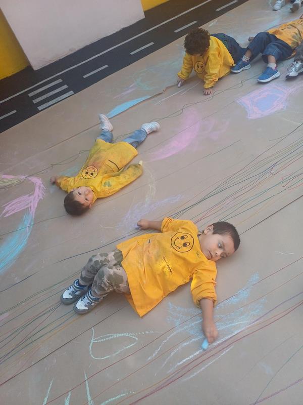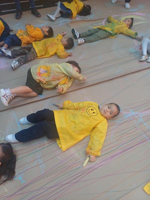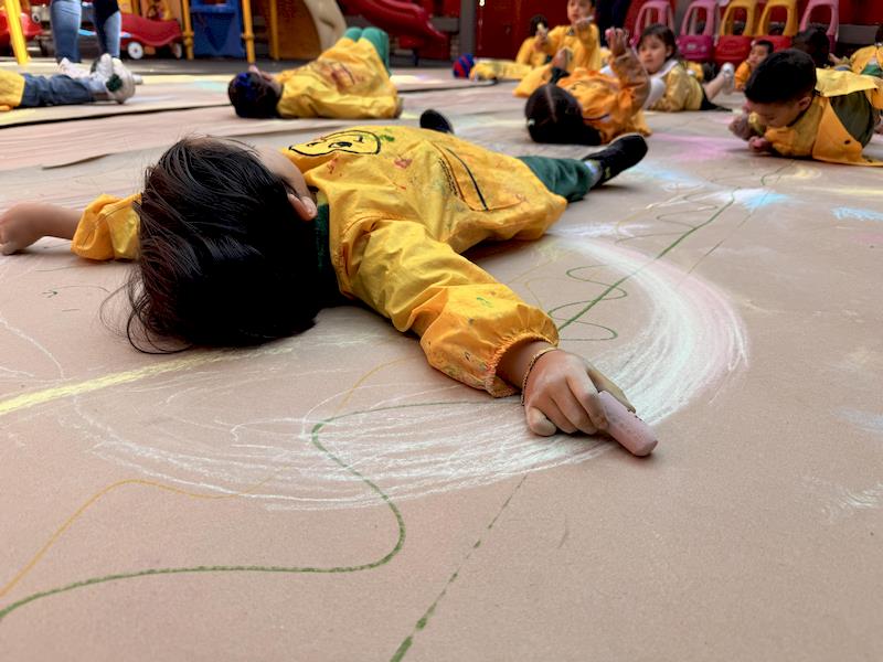In our Literacy class, we are doing activities related to the Reggio Project about body consciousness. As a closure for the story “From Head to Toes,” we had an activity where children explored what their bodies can do in a fun and dynamic way. We spread a long sheet of kraft paper on the floor and provided crayons and chalk. Instead of sitting or standing, the kids lay on their stomachs on skateboards, and the teachers held them by the feet so they could draw the movement of the skateboard’s direction on the kraft paper.