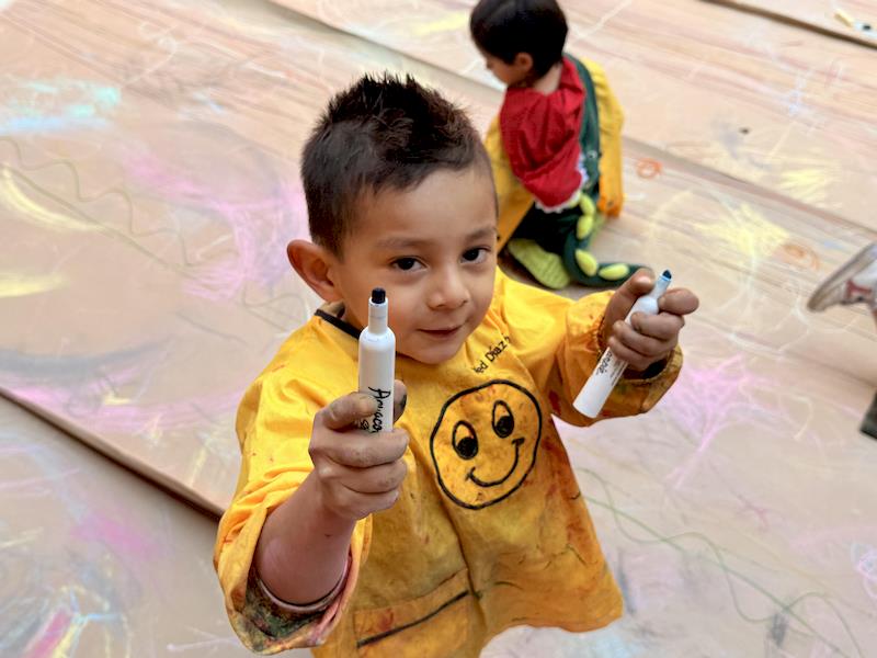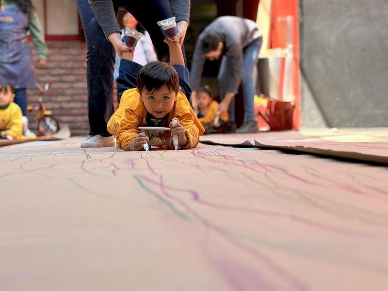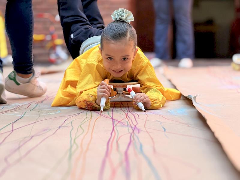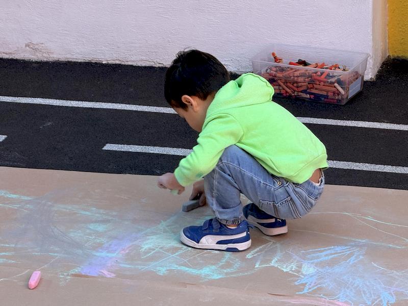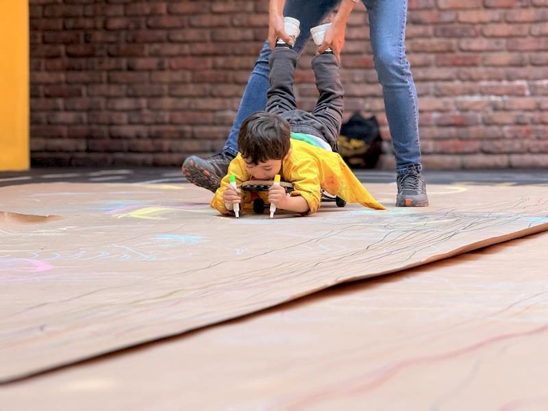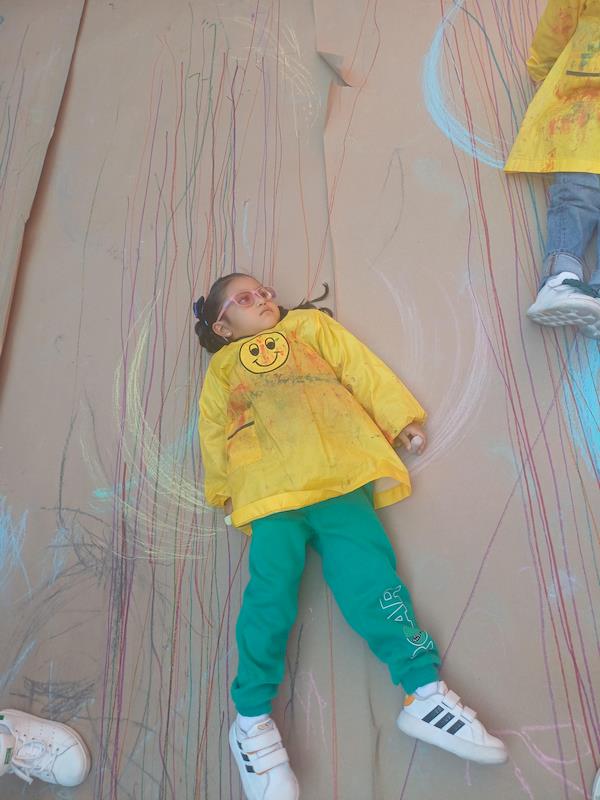 Este divertido montaje fomentó el movimiento corporal, la coordinación y el equilibrio, a la vez que les dio la libertad de crear trazos amplios y expresivos. Al deslizarse sobre el papel, los niños experimentaron con colores, líneas y formas, convirtiendo la actividad en una divertida combinación de arte y exploración de la motricidad gruesa.