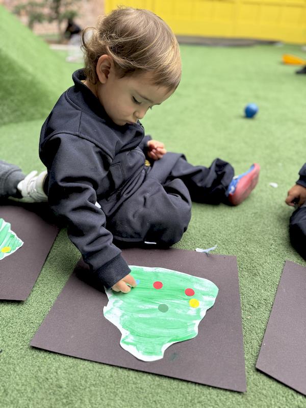 Como parte de la actividad navideña, los alumnos crearon sus propios árboles de Navidad utilizando pintura verde y stickers. Esta propuesta no solo permitió reforzar el vocabulario relacionado con la Navidad, sino que también impulsó la creatividad de cada niño, haciendo que cada árbol fuera único y especial.