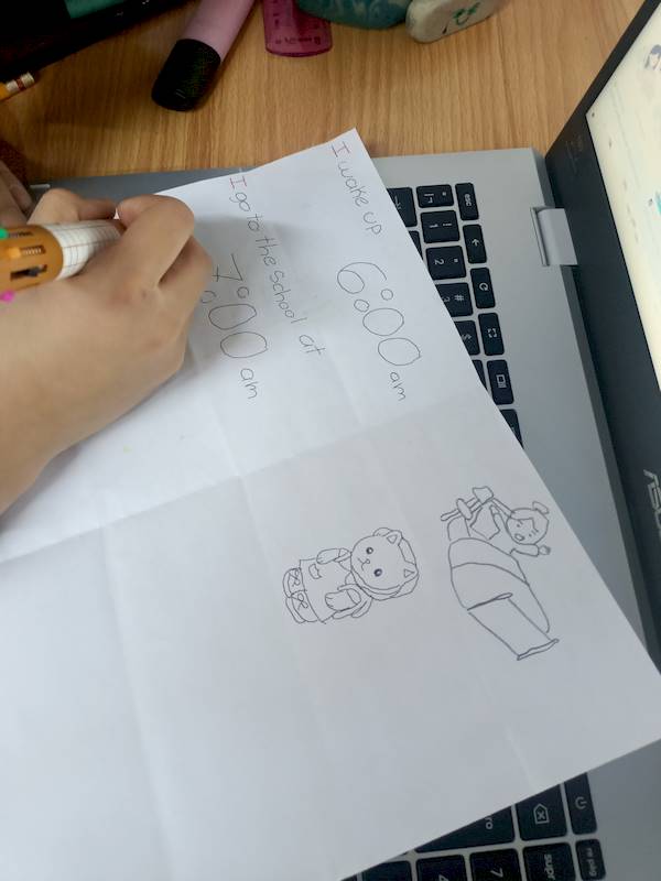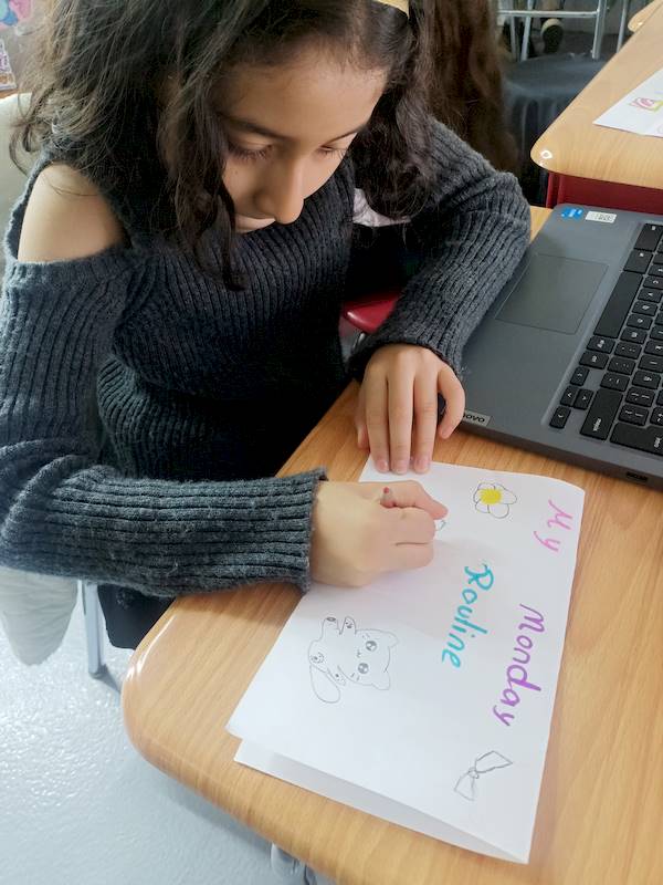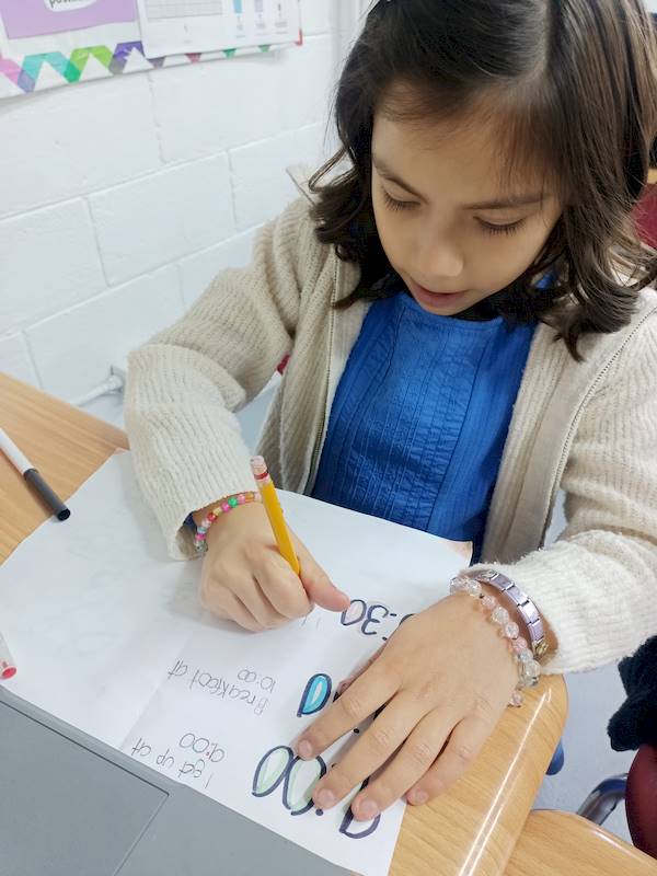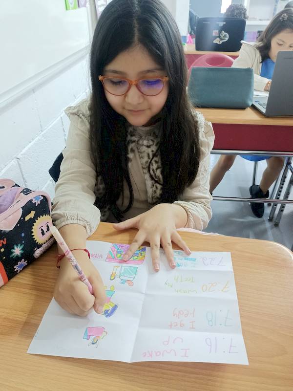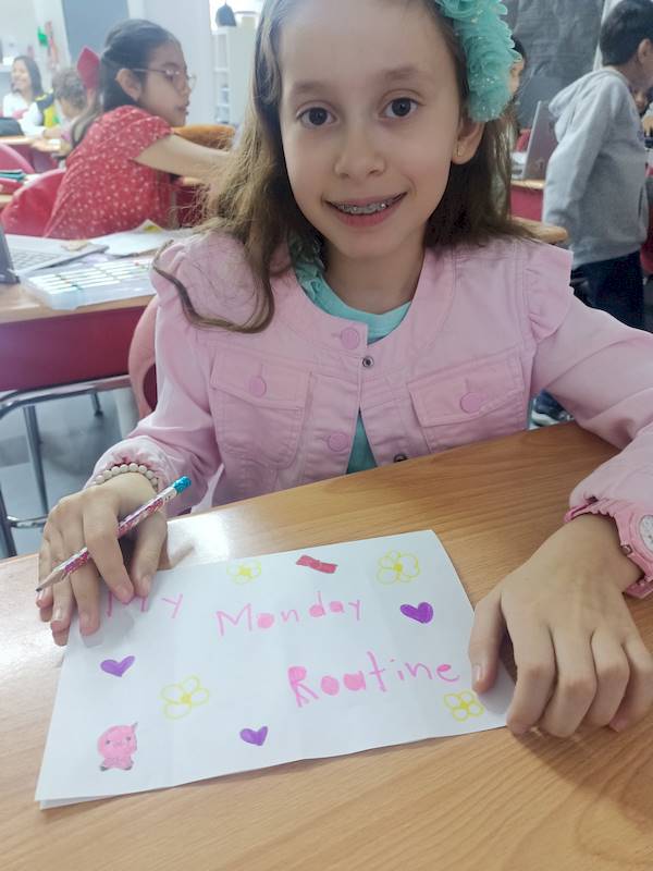 Fourth-grade students worked on the grammatical topic of the Simple Present tense through a hands-on and student-centered learning activity. In order to make this grammatical structure more meaningful and conscious, students created a craft focused on their daily routine on their favorite day.