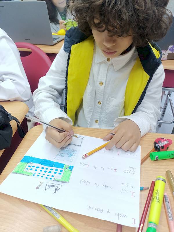 As part of the activity, learners wrote affirmative sentences using the Simple Present to describe habitual actions and everyday activities. They also included illustrations and visual representations to support written language and reinforce comprehension. This activity promoted contextualized grammar practice, encouraged creativity, and supported the development of writing skills and language awareness.