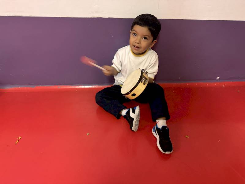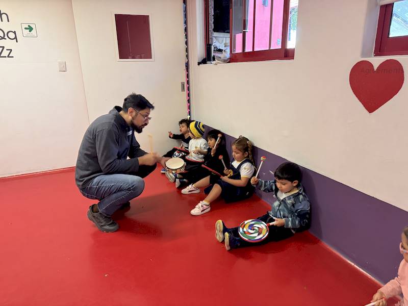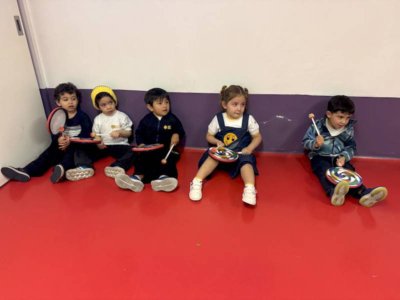 En el Club After School de música de Kinder 1, las niñas y los niños han estado convirtiendo sus nombres en ritmos: primero con palmas y después usando instrumentos como palos, tambores, panderos y ukuleles. Nunca falta el movimiento en sus clases, lo que ayuda a desarrollar su sentido rítmico y espacial, mientras aprenden nuevas canciones y gestos que fortalecen su motricidad fina y gruesa.