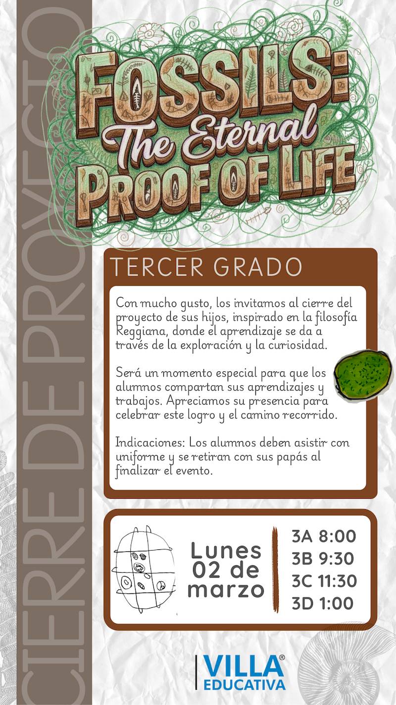 Jueves 26 de febrero: 5A (8:30) | 5B (10:30) | 5C (12:30) - 3º Grado: Fossils: The Eternal Proof of Life