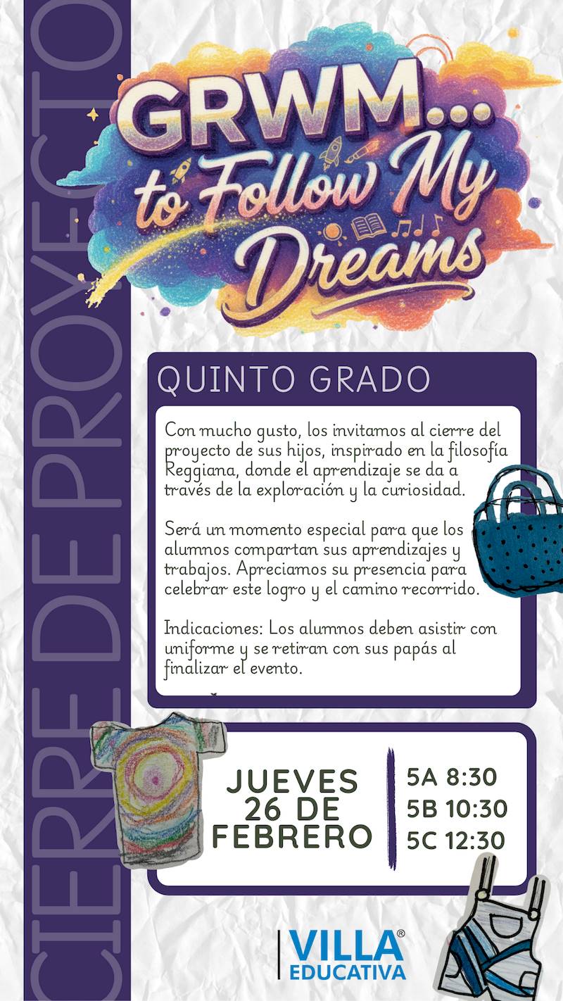 Miércoles 25 de febrero: 2A (8:00) | 2B (9:30) | 2C (11:30) | 2D (1:00) - 5º Grado: GRWM… to Follow My Dreams